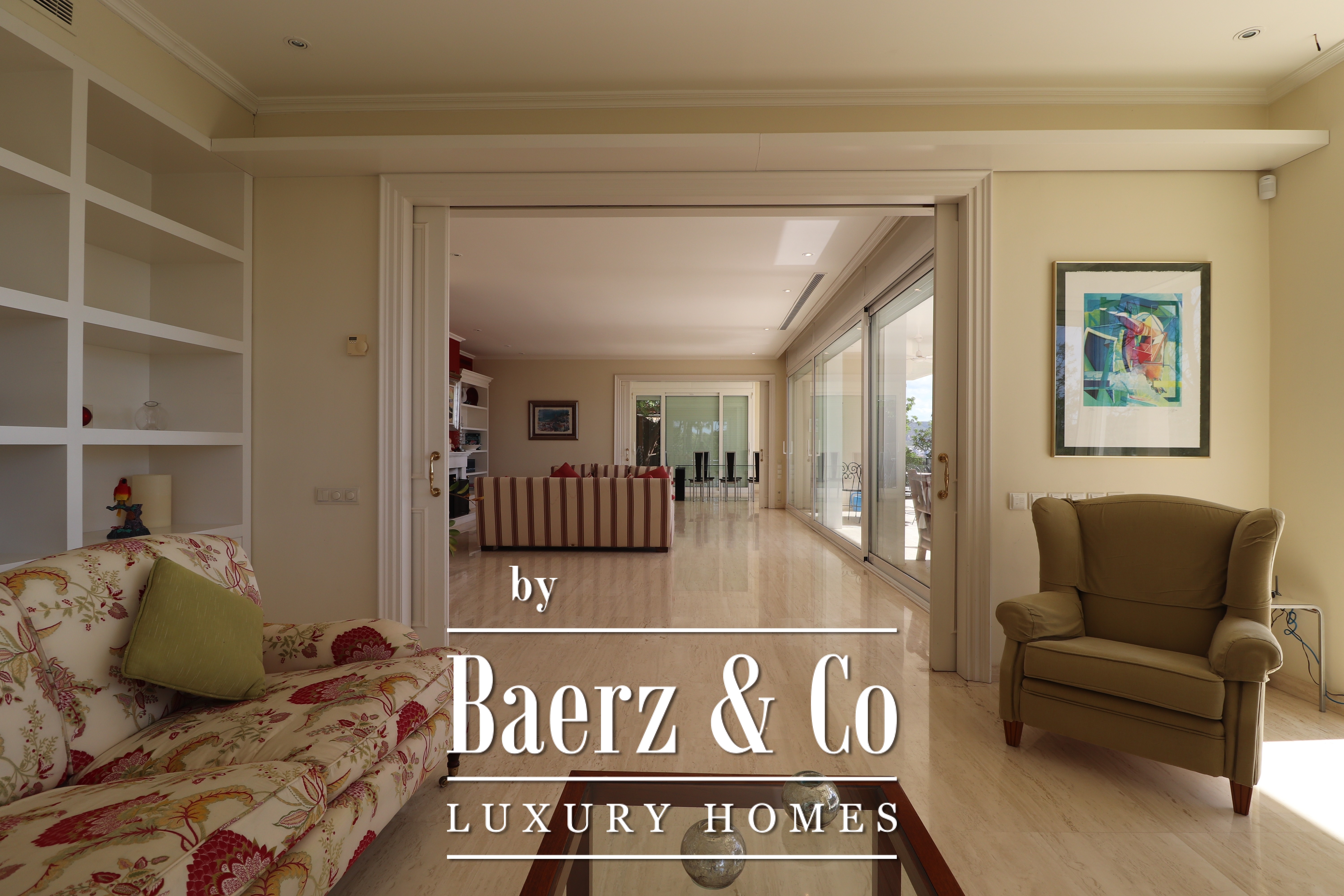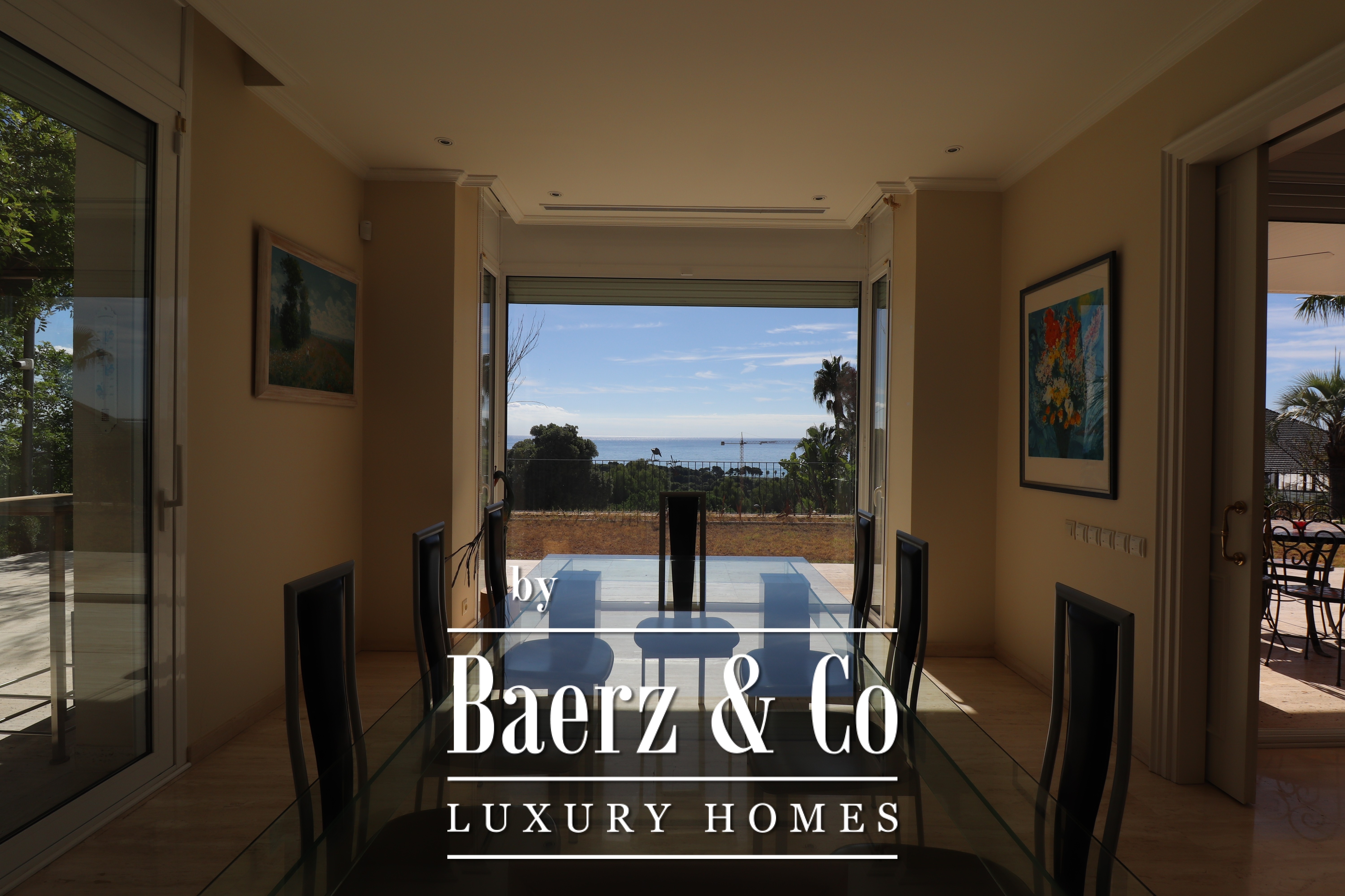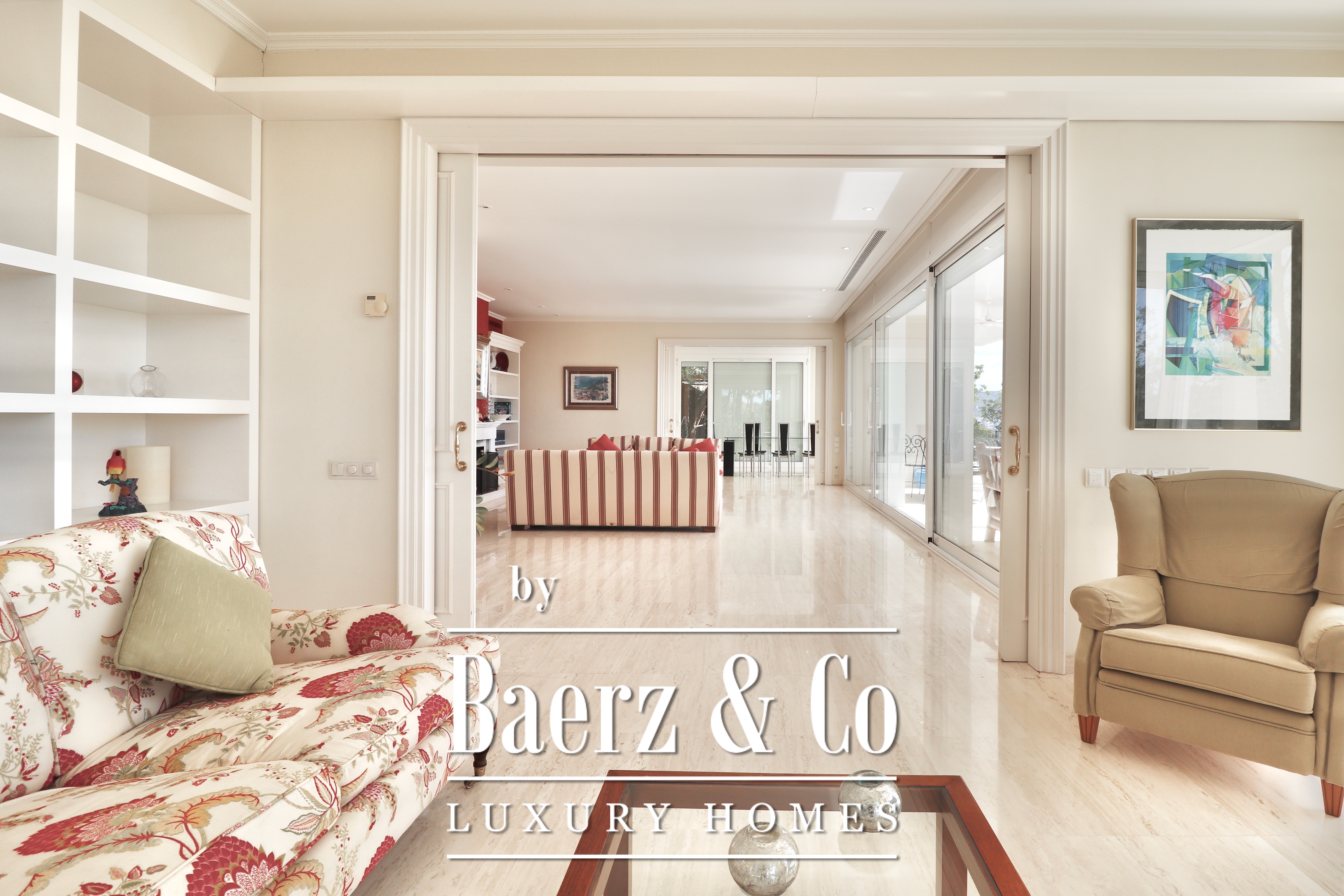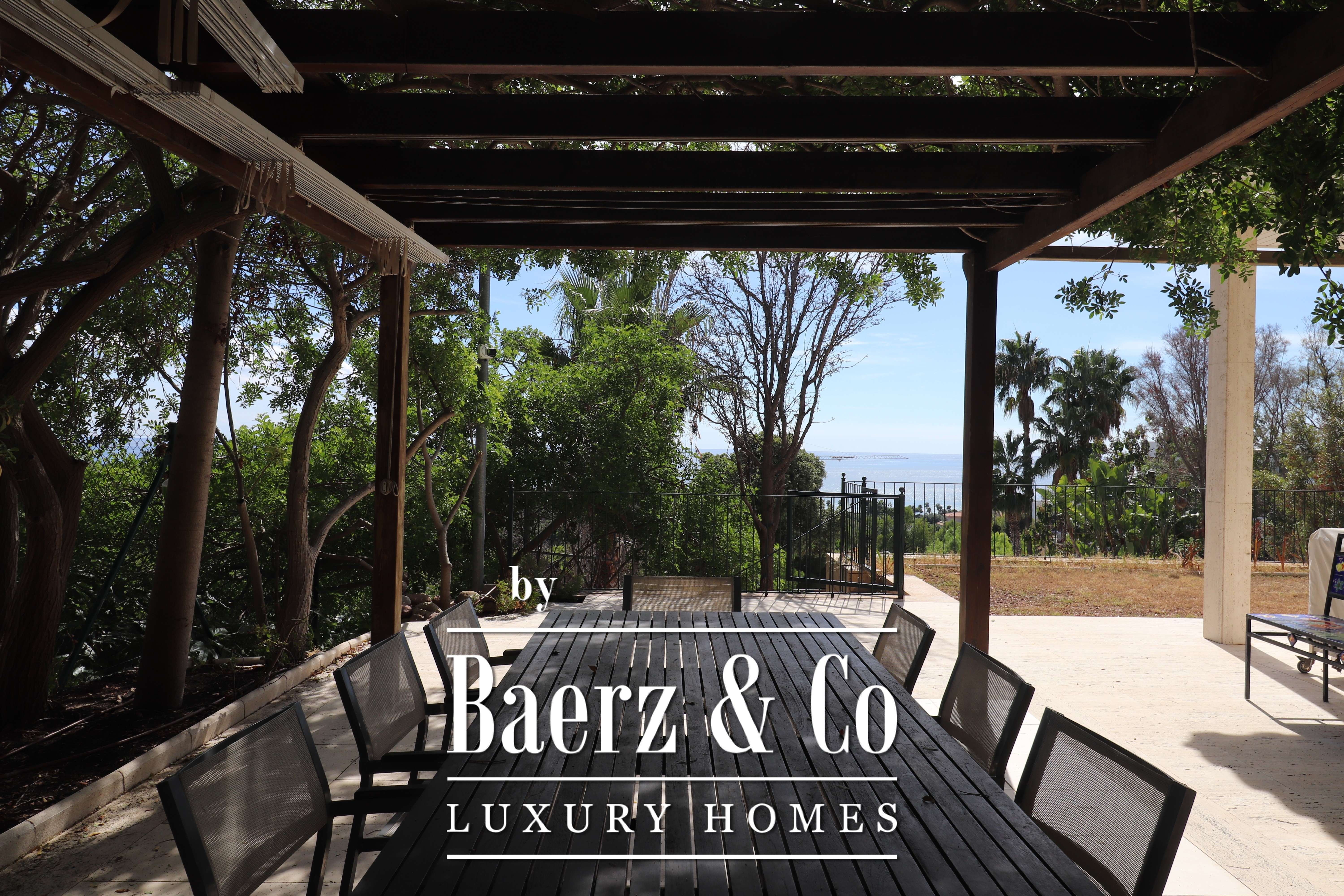 Designed for discretion and comfort, the villa unfolds across three levels, connected by a private lift. The main level opens with a refined entrance hall leading to a fluid living space, including living and dining rooms, a media zone, and a fully equipped kitchen with an adjoining service area and dedicated office. Five bedrooms and eight bathrooms allow for both family intimacy and entertaining on a generous scale.
