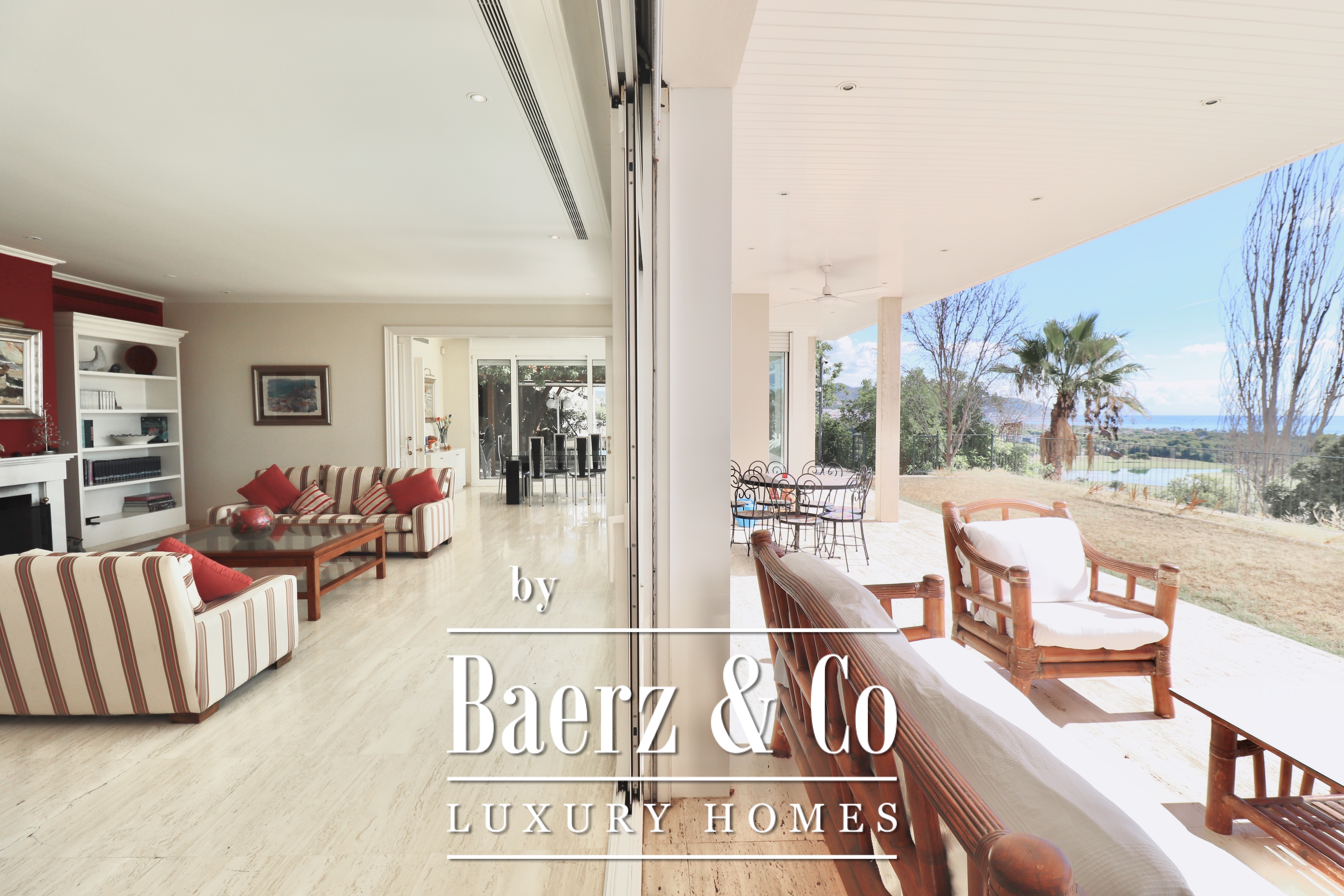 Contemporary villa Sitges defines the height of modern Mediterranean living, with 910 m² of architecture overlooking the golf course and the protected coastline. The property is set within 2,647 m² of mature land, embraced by native vegetation and oriented south to capture exceptional natural light. Residents experience serene privacy, expansive terraces, and sweeping sea views that extend over a manicured garden and a shimmering deep blue swimming pool.