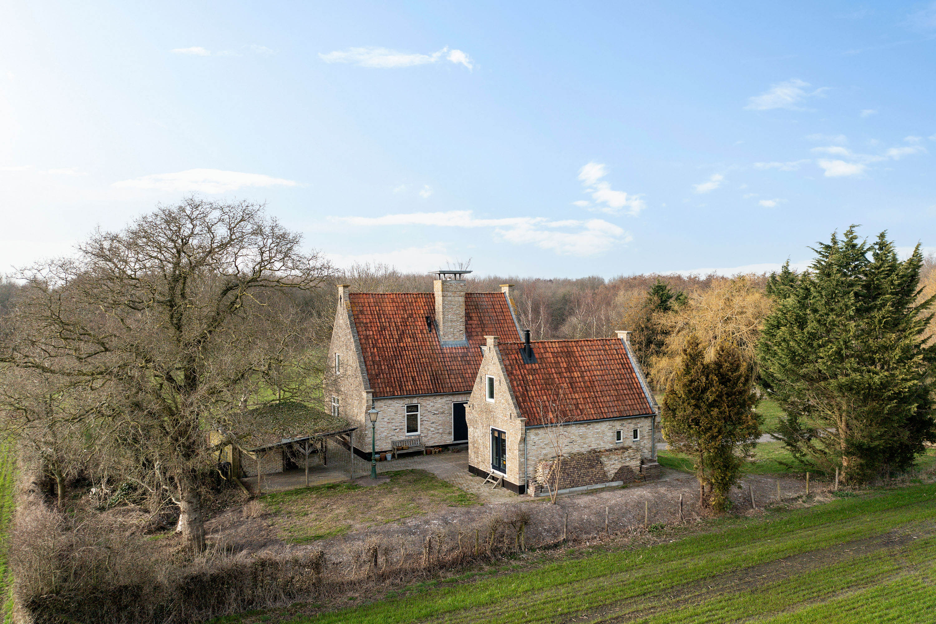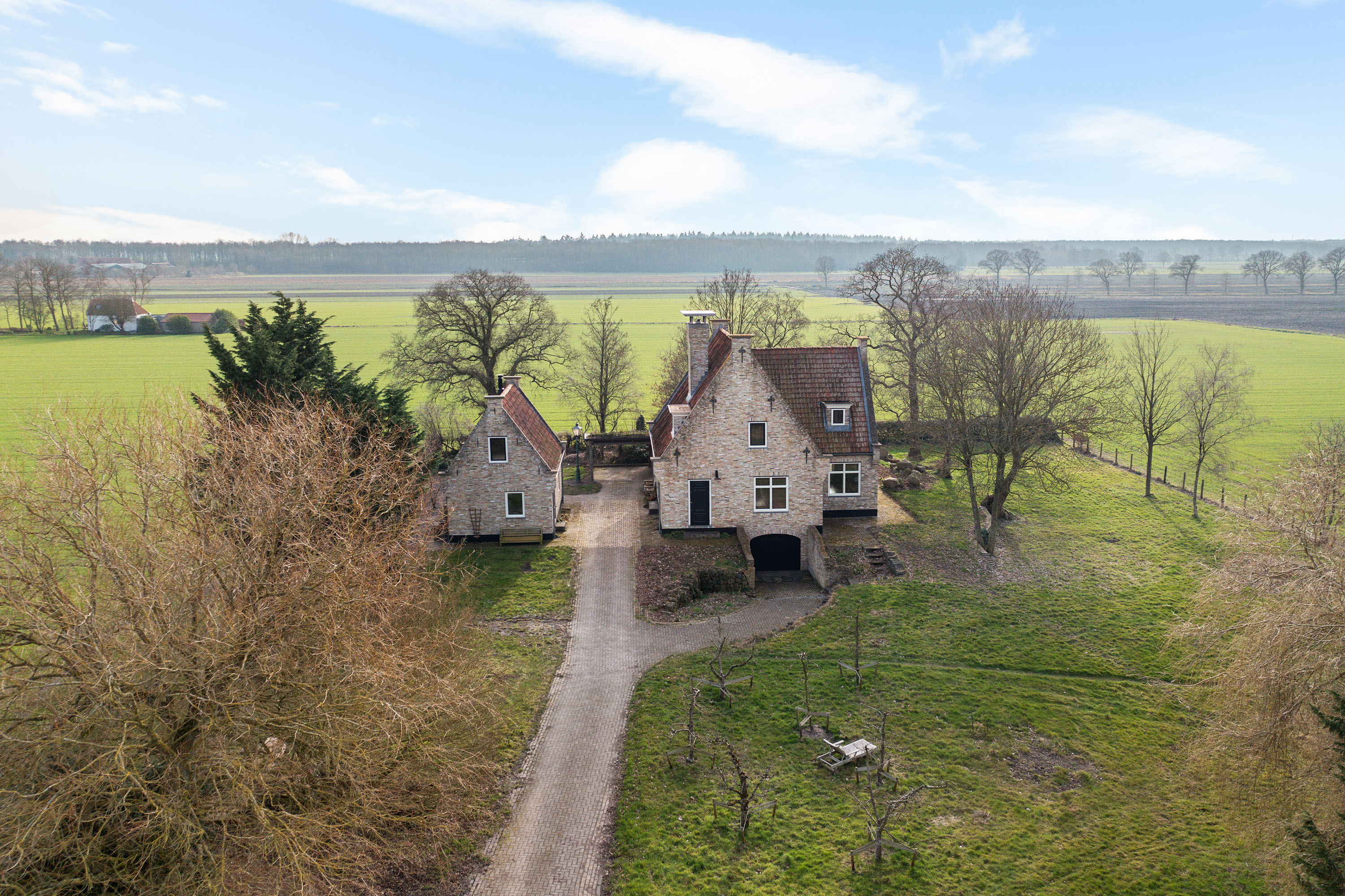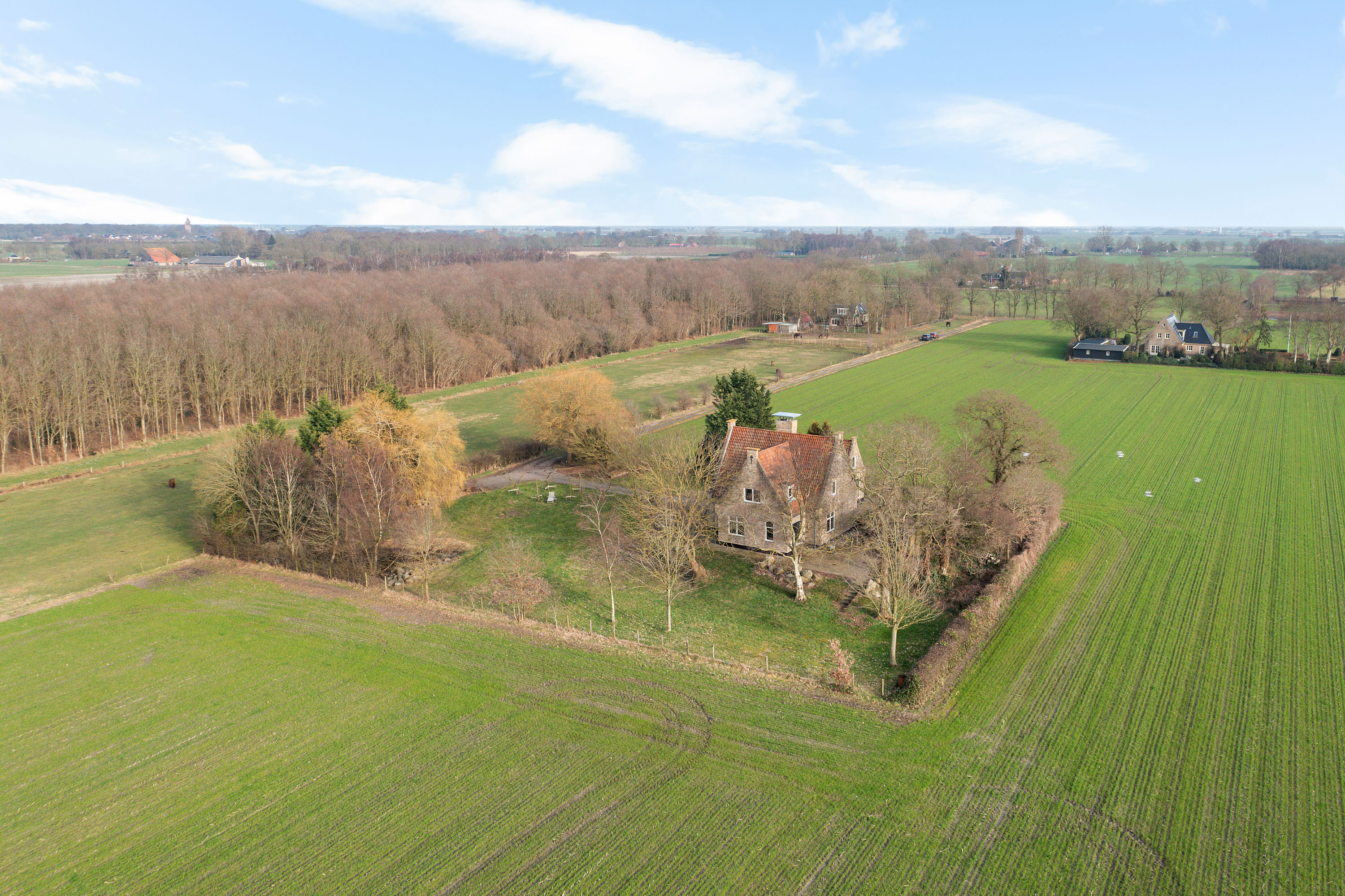 The country house was robustly built on a traditional terp around 2003 and is set on a plot of approx. 4,240 m², surrounded by rolling meadows and bordering woodland. A private driveway of approx. 450 metres leads from the public road to this secluded oasis.