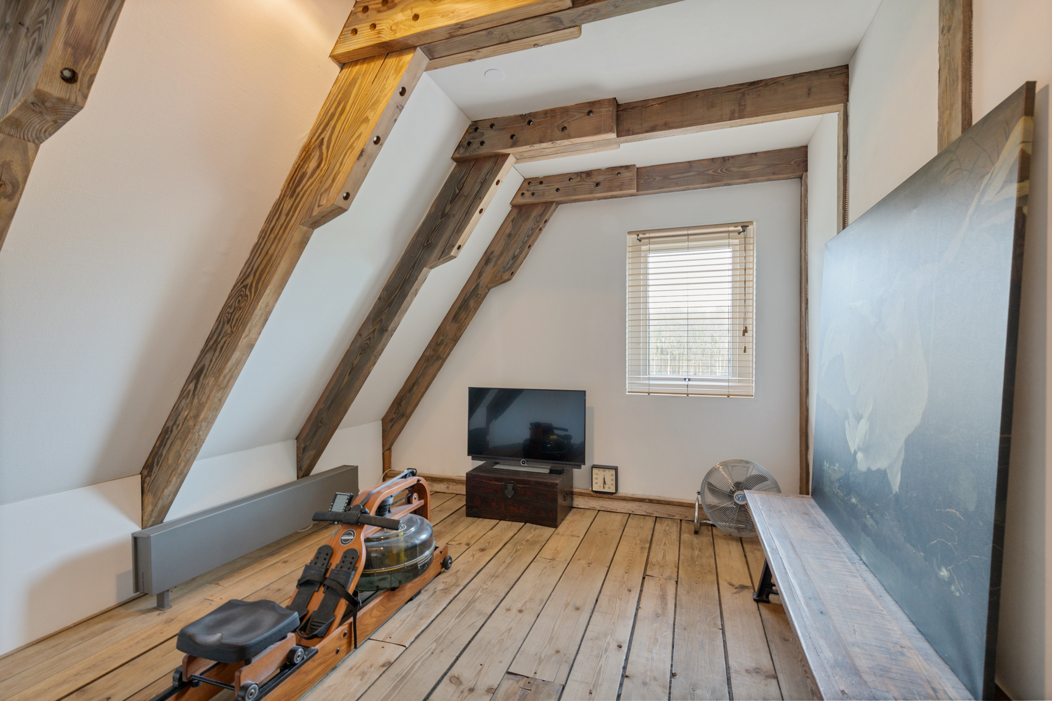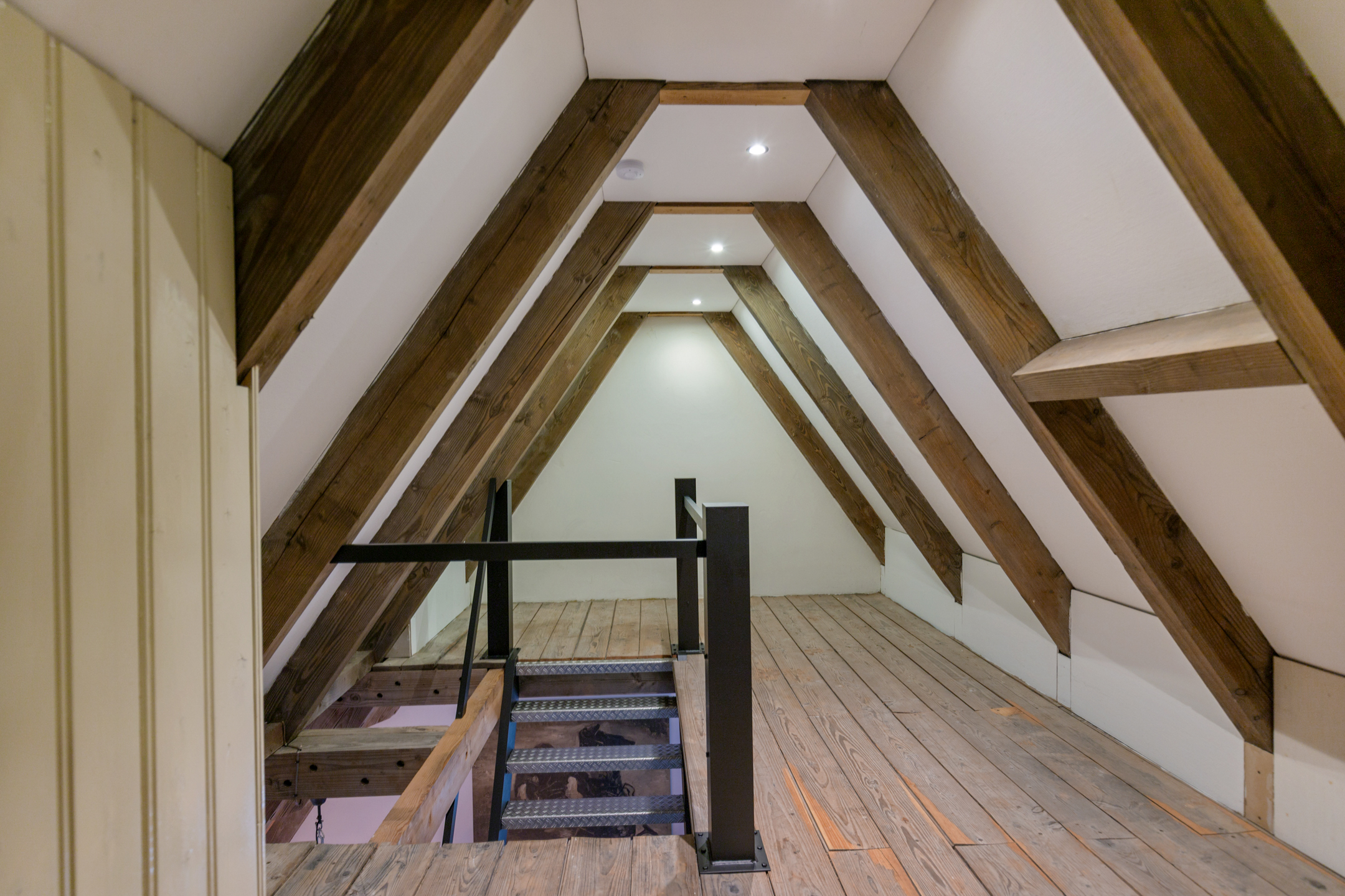 From the landing the technical room is accessible, housing the Nefit combi boiler (2024). The floors on this level are finished with solid pine boards.