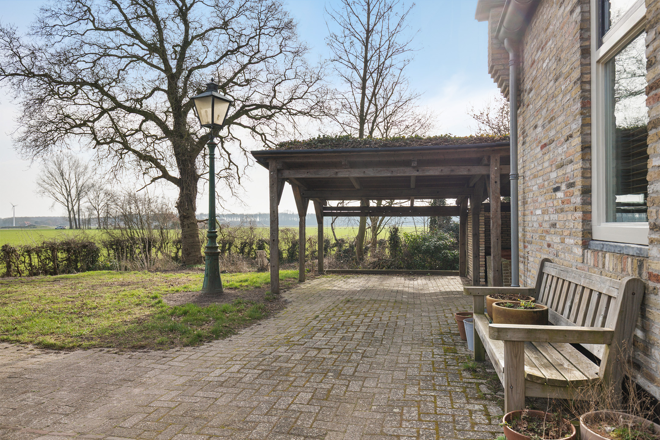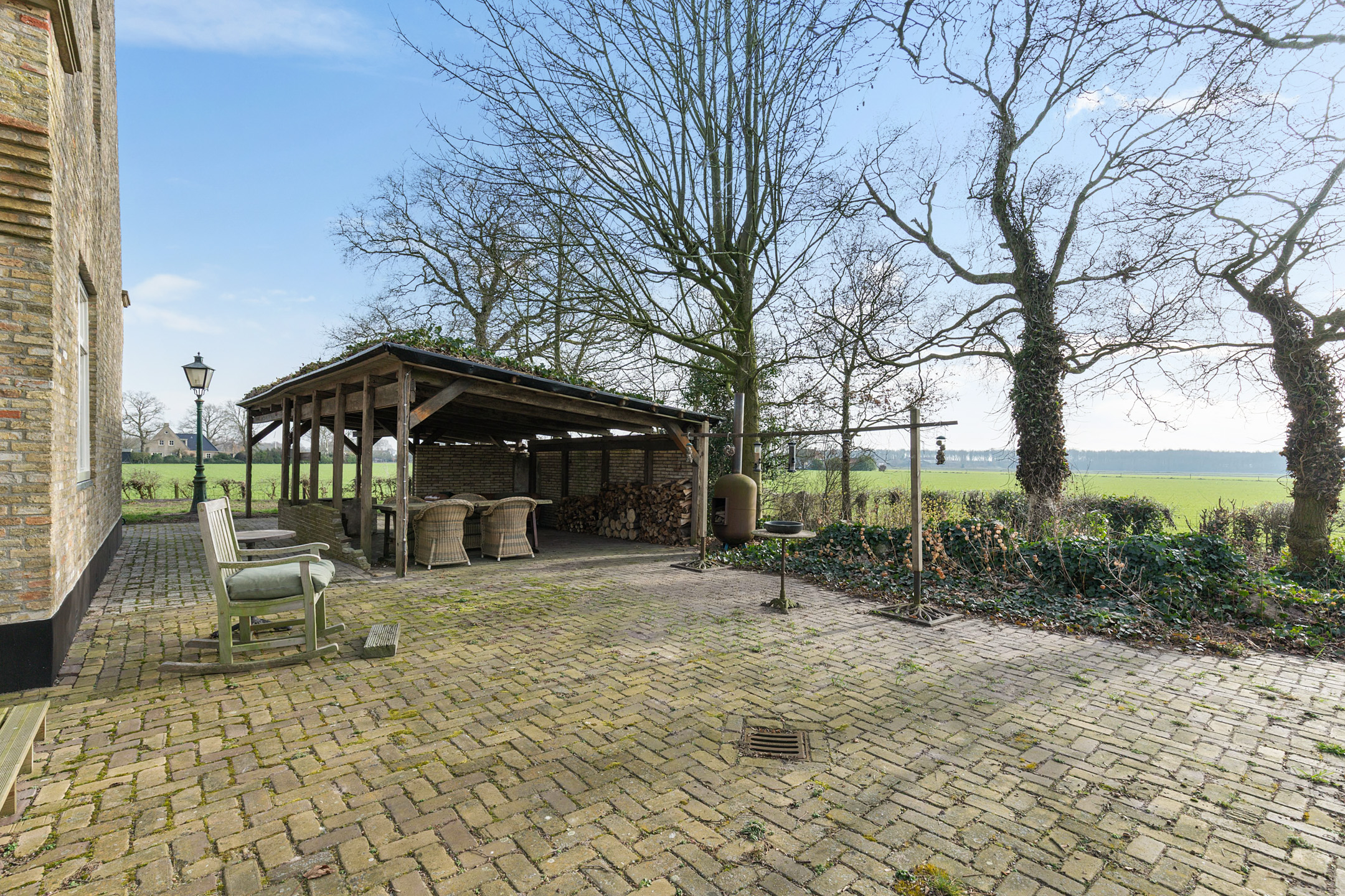 The garden is thoughtfully designed around the terp and blends harmoniously with the surrounding landscape. A long private driveway, guest parking area, carport with covered west-facing terrace, easy-to-maintain lawn, various planted borders, an orchard with traditional fruit varieties and a beautiful pond with sheltered decking terrace together create a true countryside oasis.