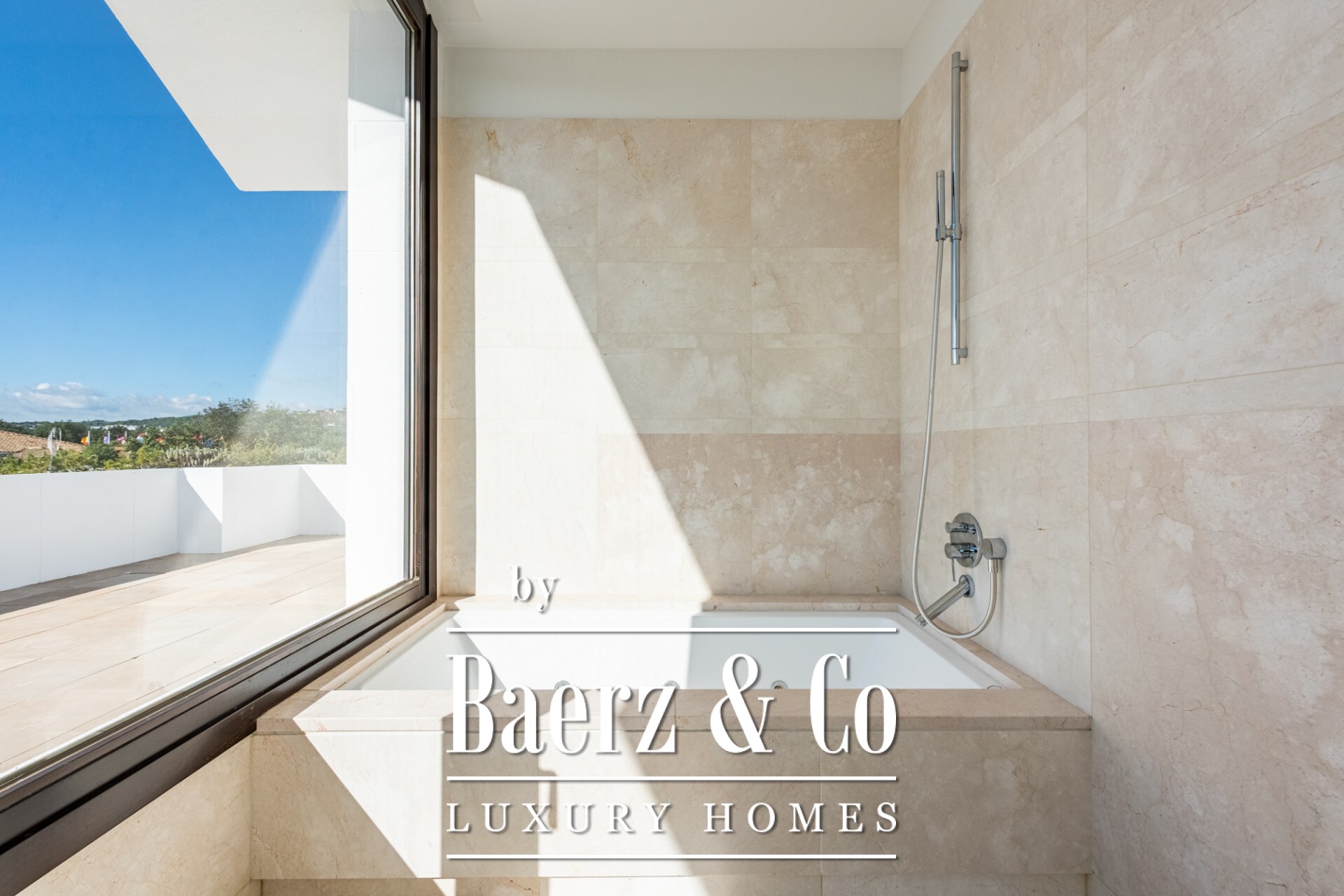 The main floor presents three bedroom suites, each benefitting from considered orientation and quiet outlooks, while the living and dining areas connect seamlessly to a fully fitted kitchen and utility room. The staircase rises to a master suite of presence and calm, framed by panoramic and partial sea views from its private terrace. Marble floors, underfloor heating, a smart home system, and double glazing offer comfort and control throughout.