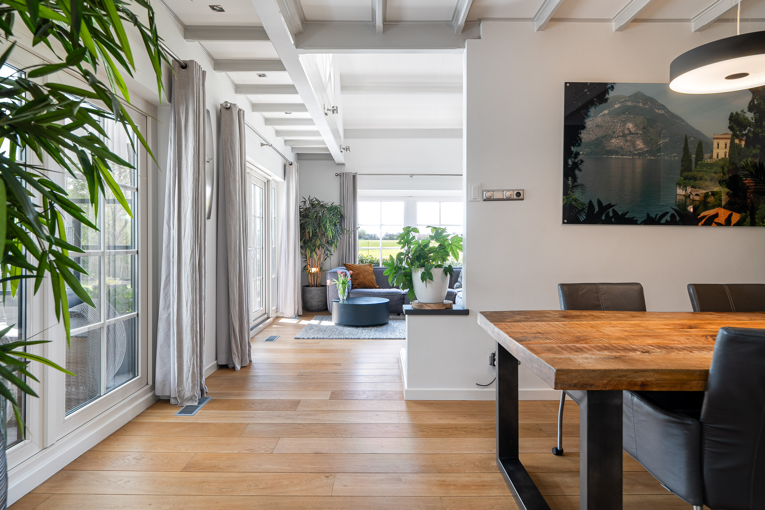 In a prime location near the IJsselmeer, adjacent to a marina with direct access to all waterways in Friesland, this villa was completely renovated in 2004 and is situated on a spacious, fenced plot with full privacy and stunning Frisian panoramas. The tranquility, greenery, water, ever-changing skies, and sense of freedom are the defining features of this home. This well-insulated villa of 245m² is designed for lifelong living, featuring a spacious living area, four bedrooms, two bathrooms, a luxurious kitchen with utility room, and a beautiful veranda with scenic views. The double garage with an upper floor offers an abundance of space and possibilities. The fully insulated home office, studio, or guesthouse with breathtaking views of nature serves as a true source of inspiration. The architecturally designed garden, maintained with a robotic lawn mower, is easy to care for and playfully arranged with various fruit trees, hedges, and reed-lined waterways. The stylishly paved driveway and entrance gate highlight the transition to the lush green garden that remains vibrant year-round.