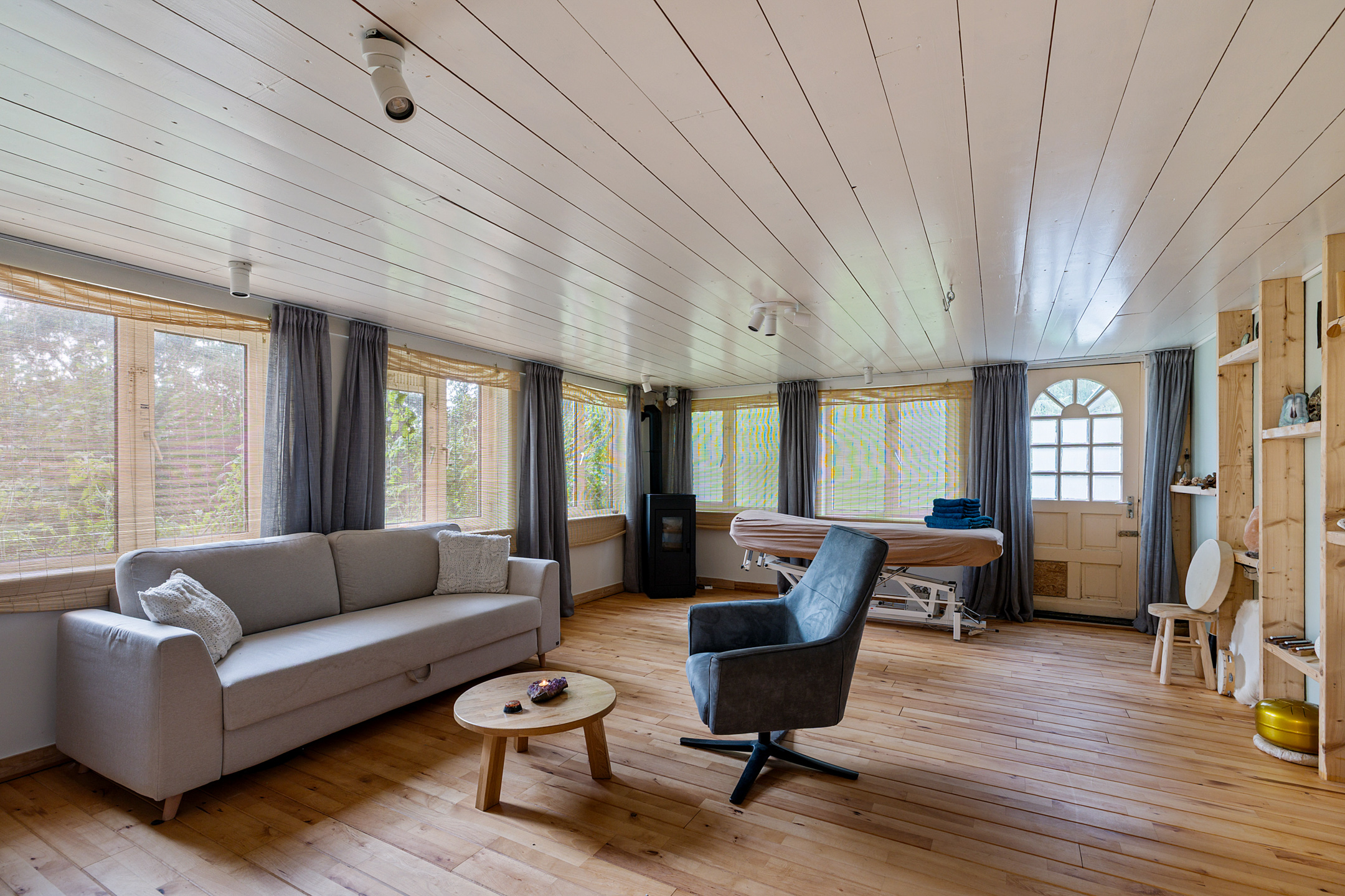 The atmospheric L-shaped living room features a wood-burning stove and, thanks to its many windows, offers beautiful views over the garden, terraces, fields and woodland. Here, indoor and outdoor living blend seamlessly.