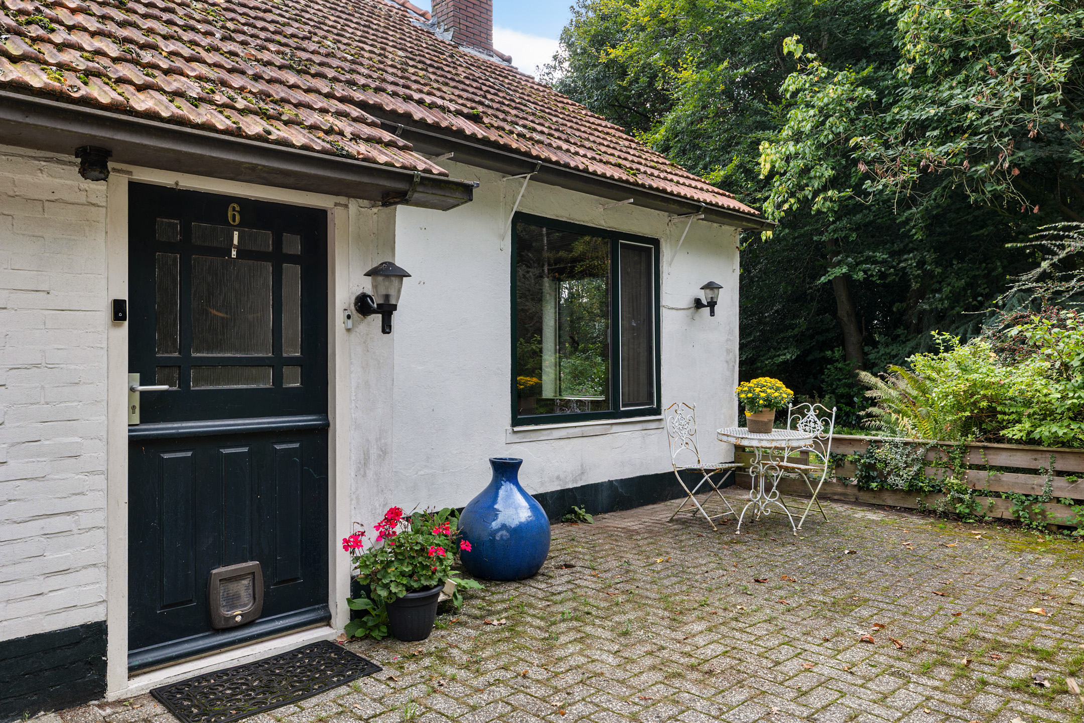 Private entrance with terrace and detached storage/outbuilding.