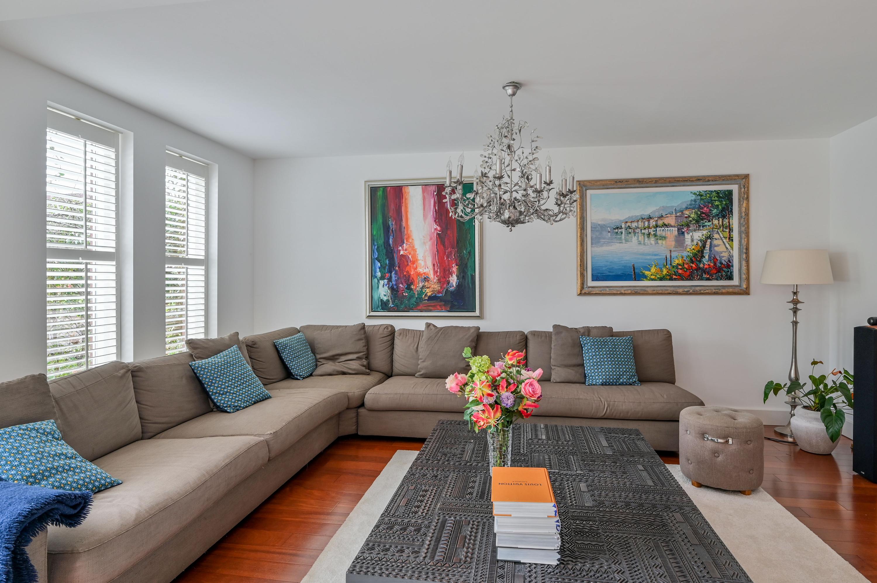 The L-shaped living room at the rear, with a generous seating area, offers beautiful views of the garden and a wide sliding door to the outside. The spacious seating area and a cozy reading corner with a wood-burning stove make it a place to completely unwind. The large side window overlooks the side garden, while shutters, sunscreens, and air conditioning ensure comfort in every season. The entire ground floor is finished with a warm, luxurious wooden floor.