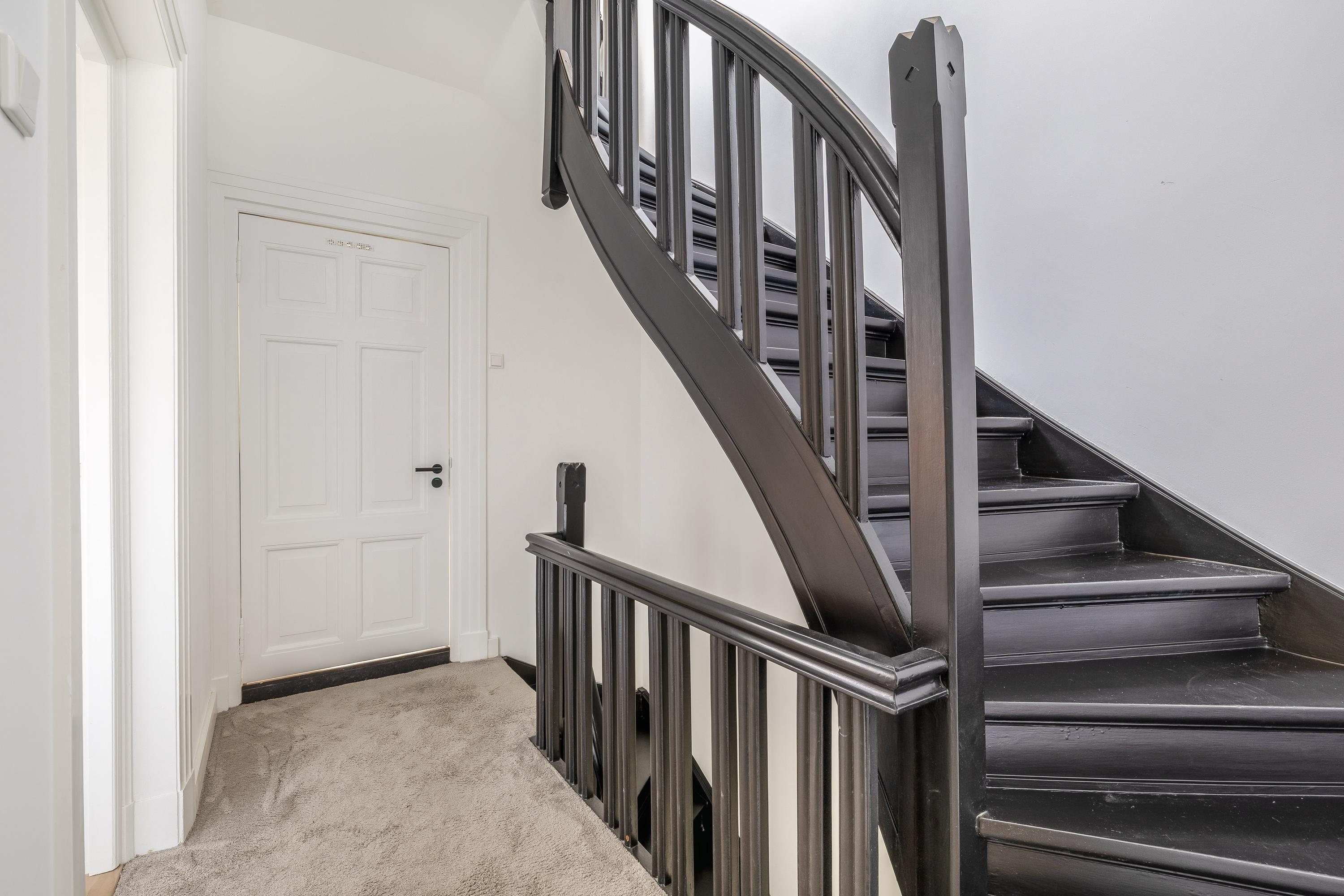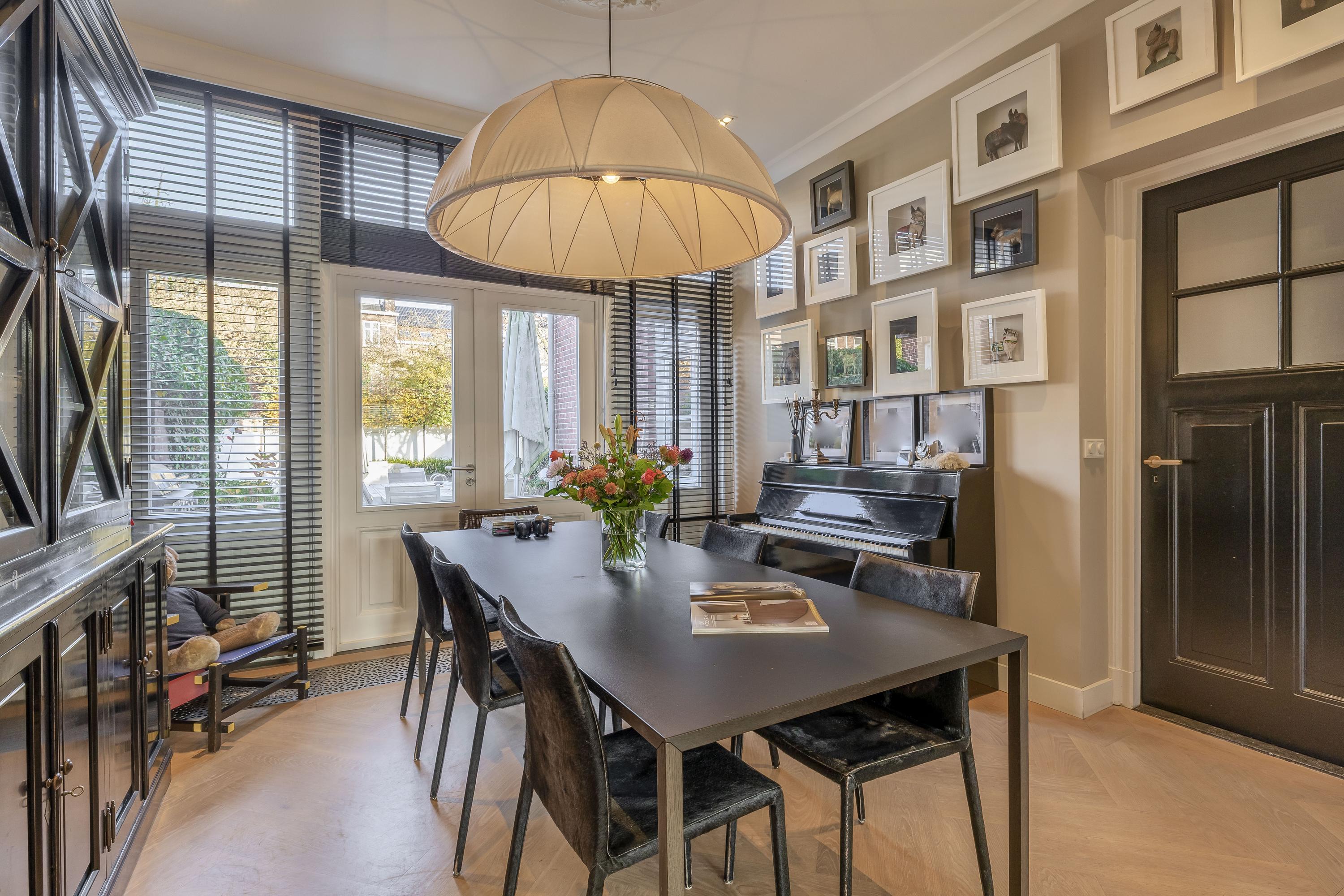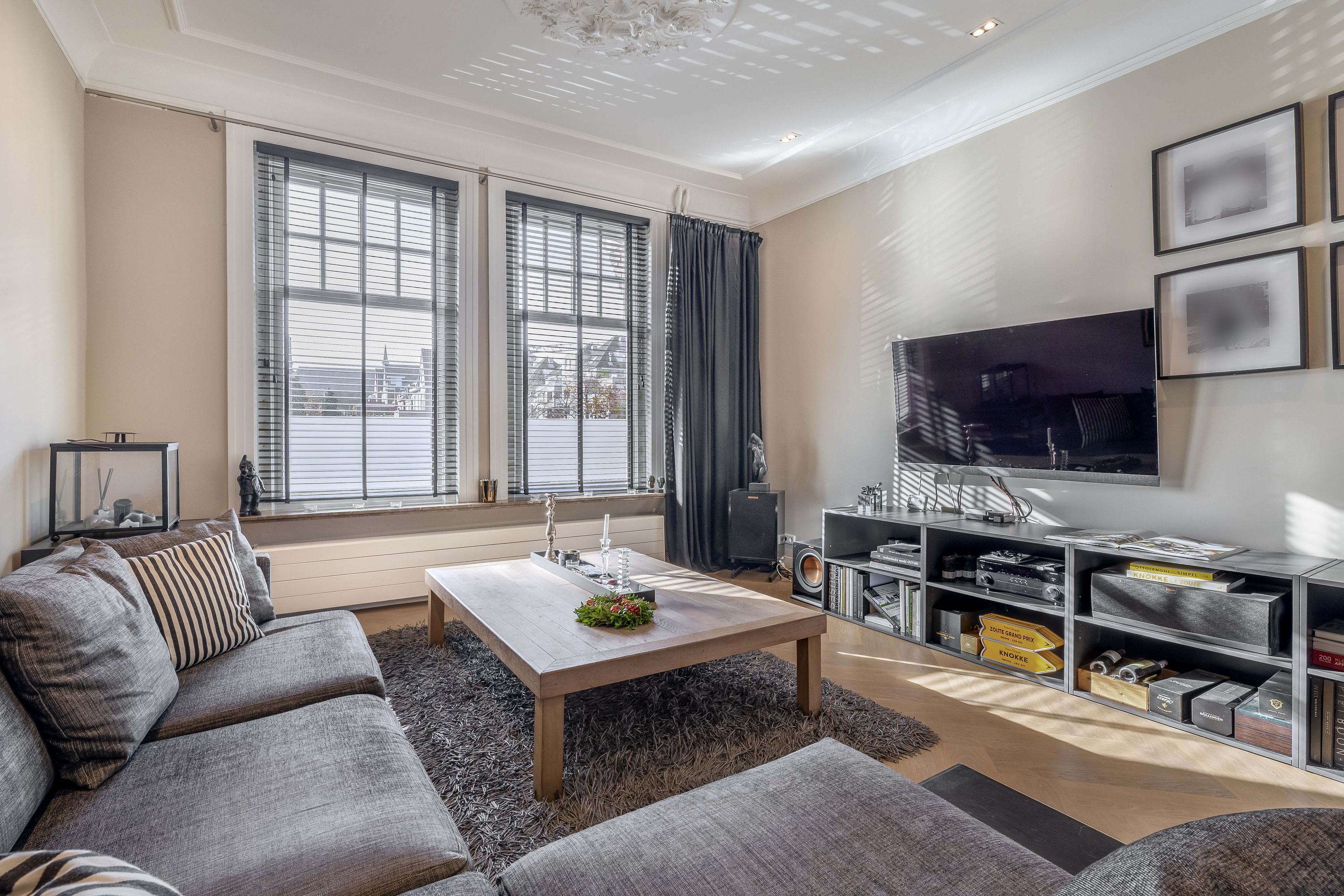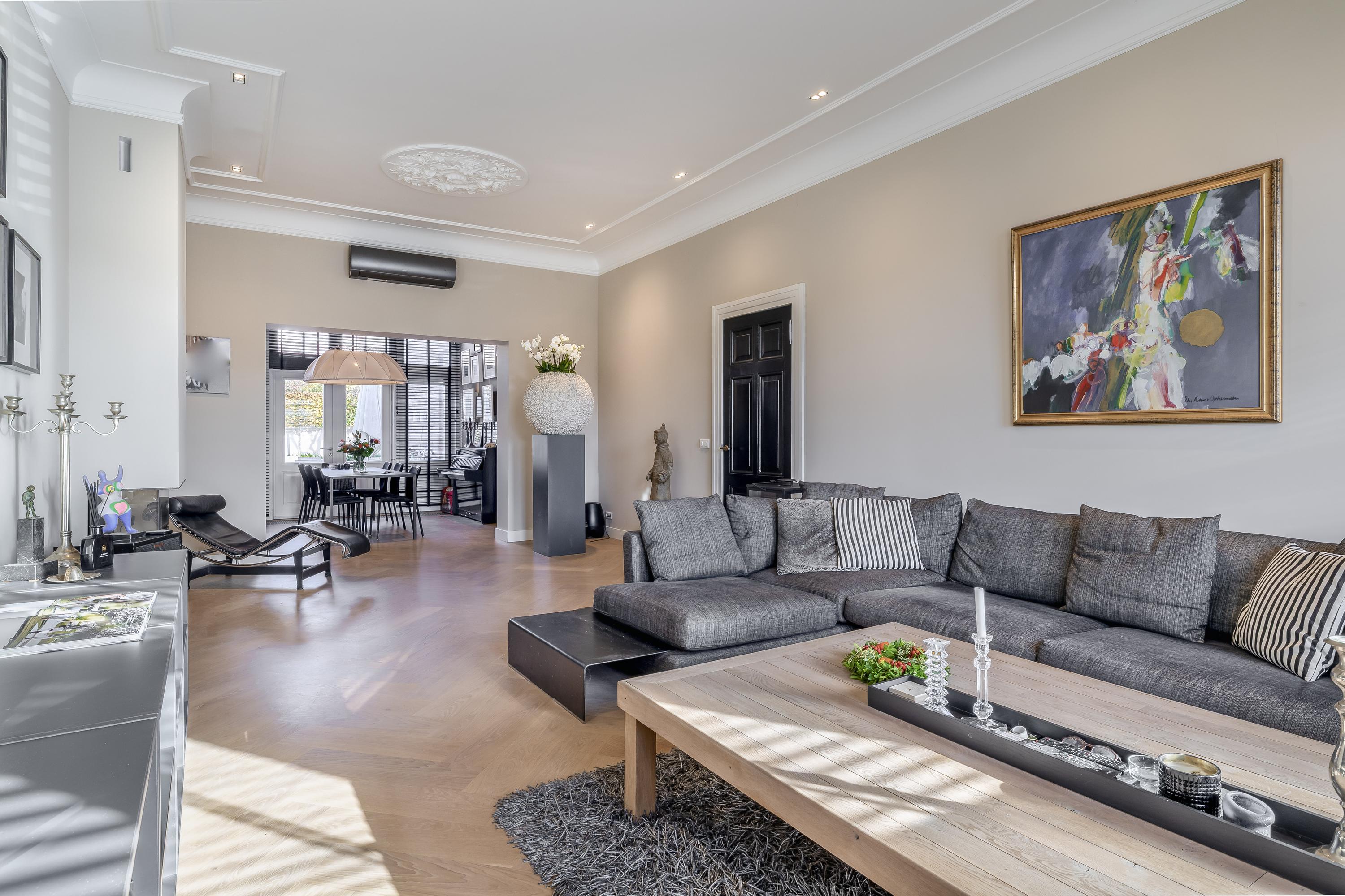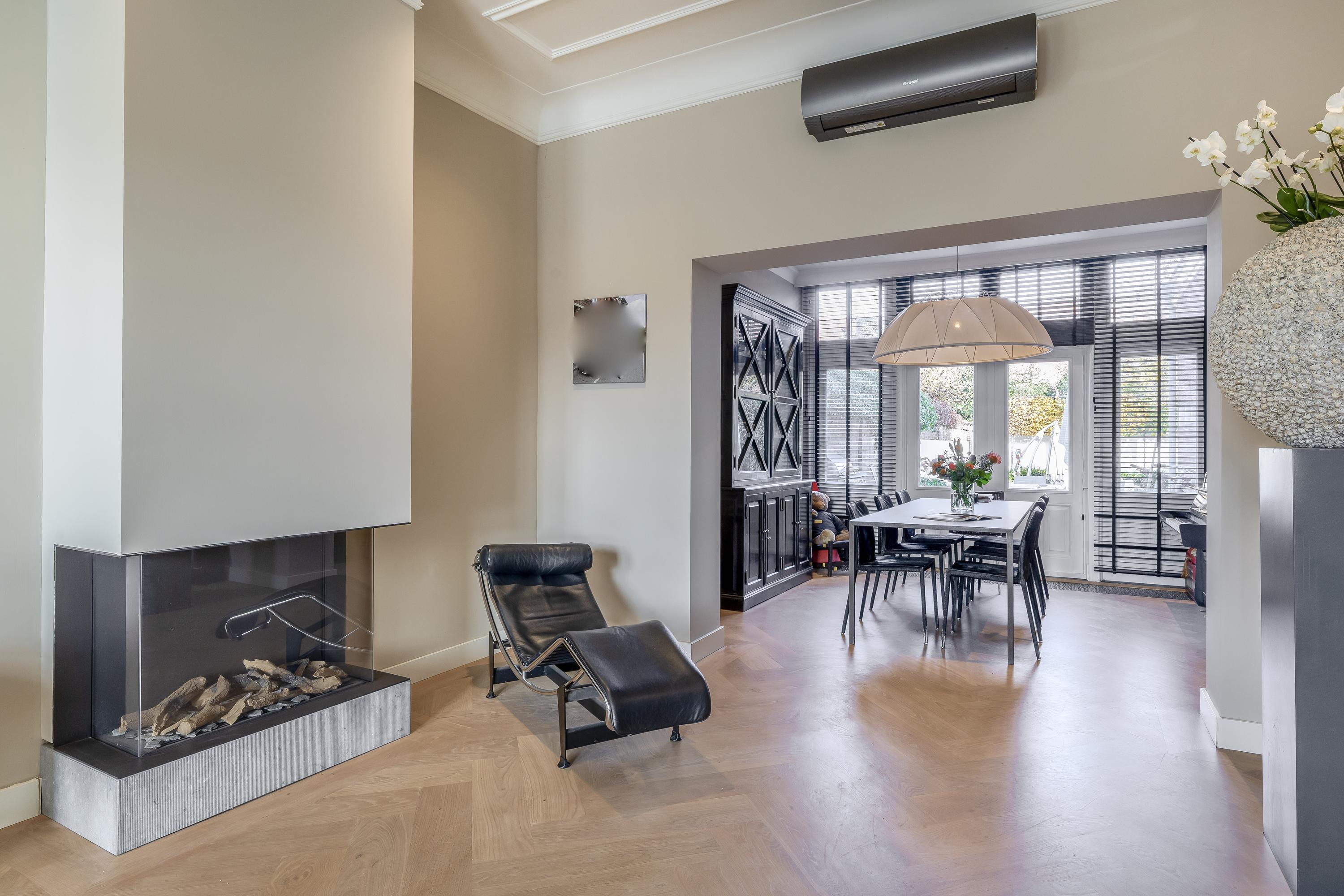 De diepe en brede woonkamer is voorzien van frans eiken extra breed visgraat parket. Het indrukwekkende hoge plafond heeft originele ornamenten en kroonlijsten en is voorzien van ingewerkte dimbare verlichting. Aan de voorzijde is vrij uitzicht op het rosarium. De gashaard zorgt voor extra sfeer en de airco zorgt zowel voor verkoeling als voor verwarming. Door de verhoogde ligging van de ramen t.o.v. het trottoir is er geen inkijk van buiten. Achterin bieden dubbele openslaande deuren directe toegang tot de tuin.