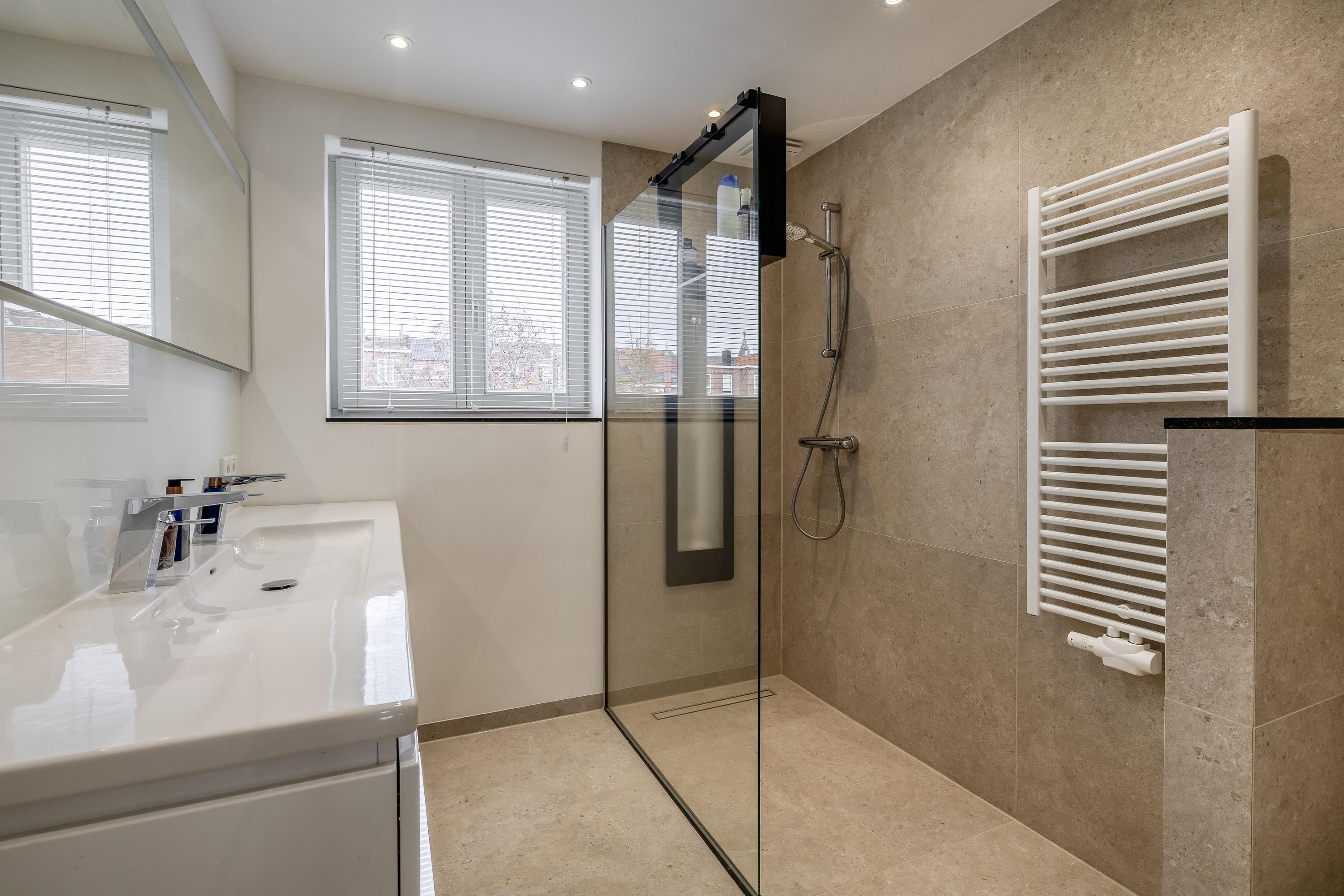 In de grote, hoogwaardig afgewerkte badkamer (2025) zijn een ruime inloopdouche voorzien van sunshower, toilet, dubbel wastafelmeubel, designradiator en mechanische ventilatie aanwezig. Er ligt een tegelvloer met een elektrische vloerverwarming.