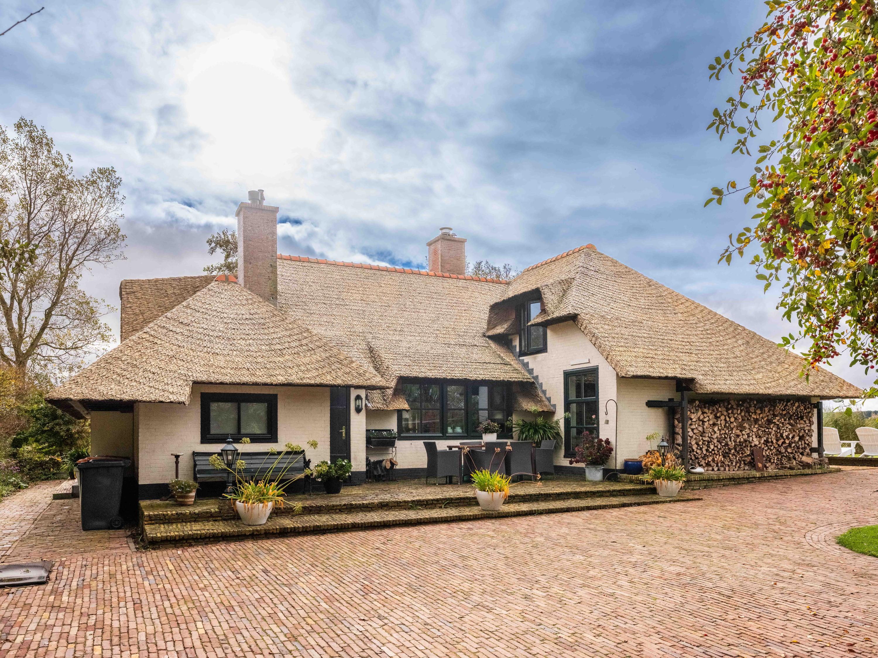 The country-style kitchen is fitted with built-in cabinets and ample storage space. From here, you can also access the spacious cellar, ideal for storage or as a wine cellar. The generous kitchen forms the heart of the home, featuring authentic details such as an English cooker with four ovens and characteristic beamed ceilings. The kitchen flows seamlessly into the inviting living room, where abundant natural light and views over the water immediately draw your attention. This room feels spacious and welcoming, enhanced by the centrally positioned wood-burning stove that adds a warm, homely touch.