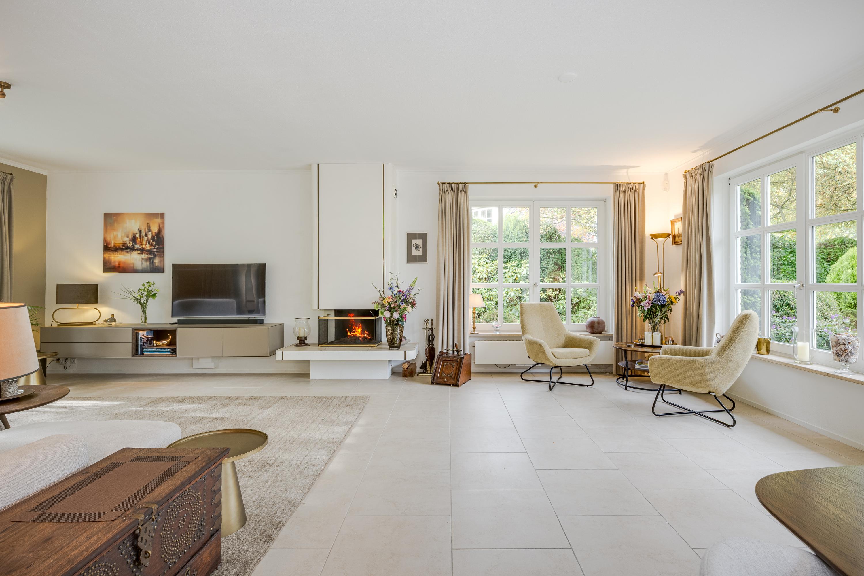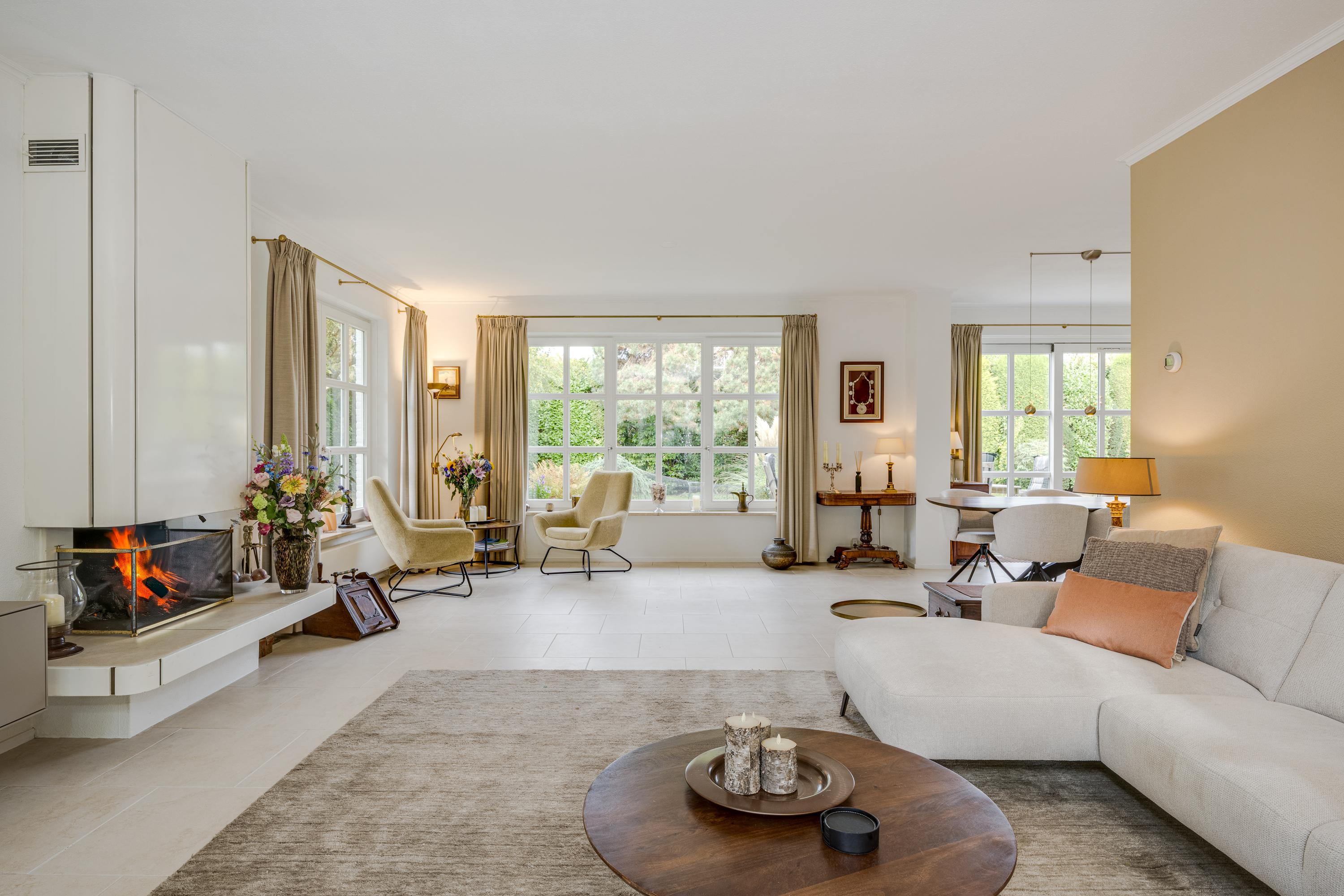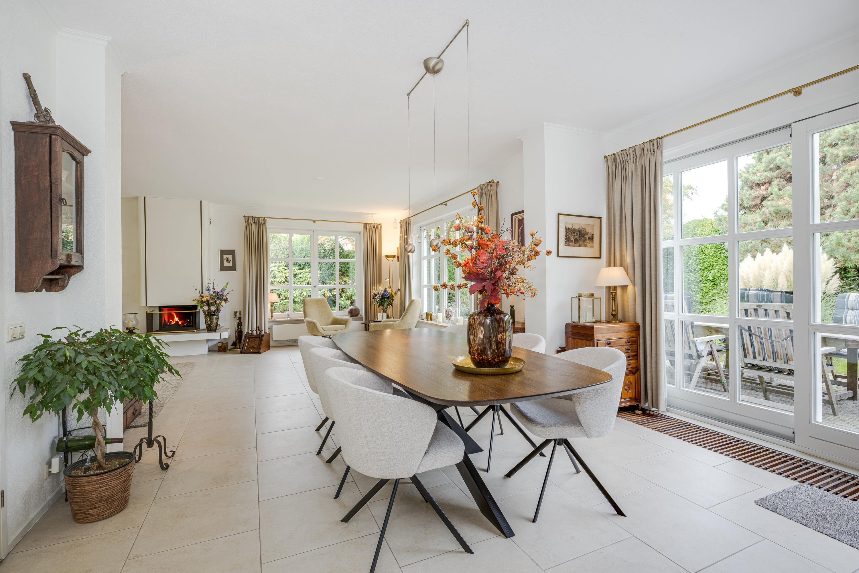 Entrance with spacious hall, toilet, and cloakroom. Double doors open into the bright and spacious living/dining room of approximately 55 m², featuring large windows, sliding doors to the terrace, and a cozy wood-burning fireplace.