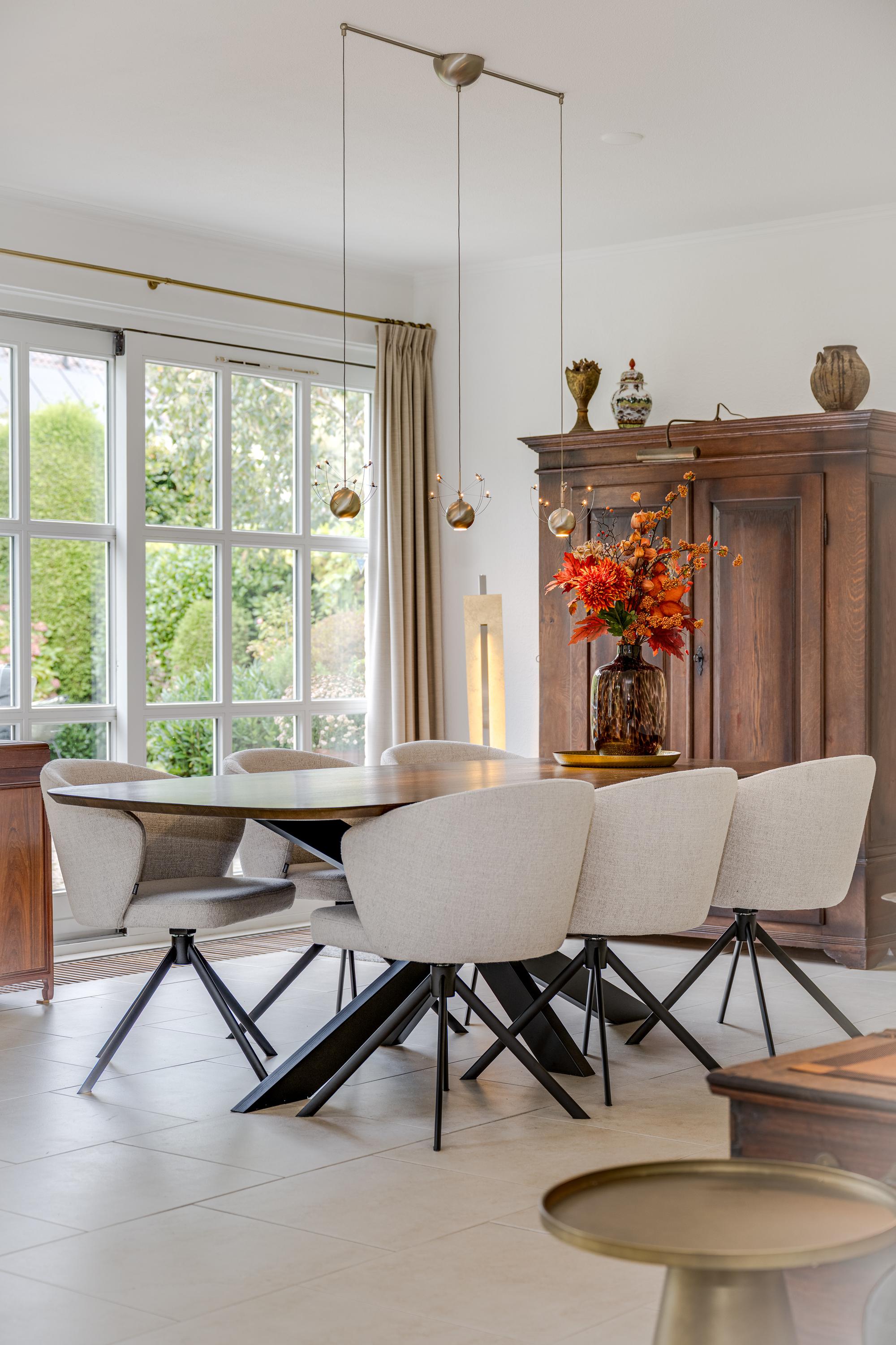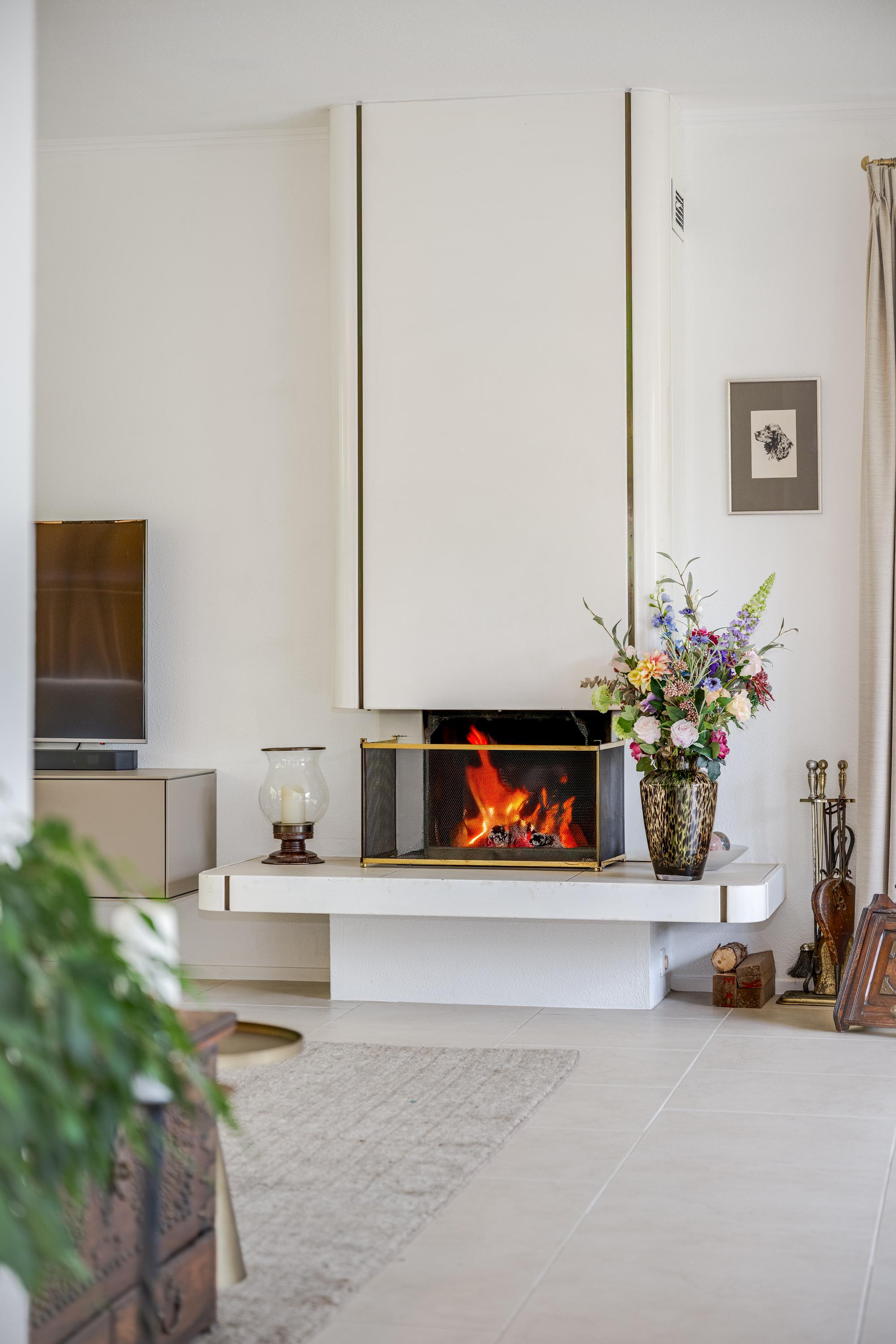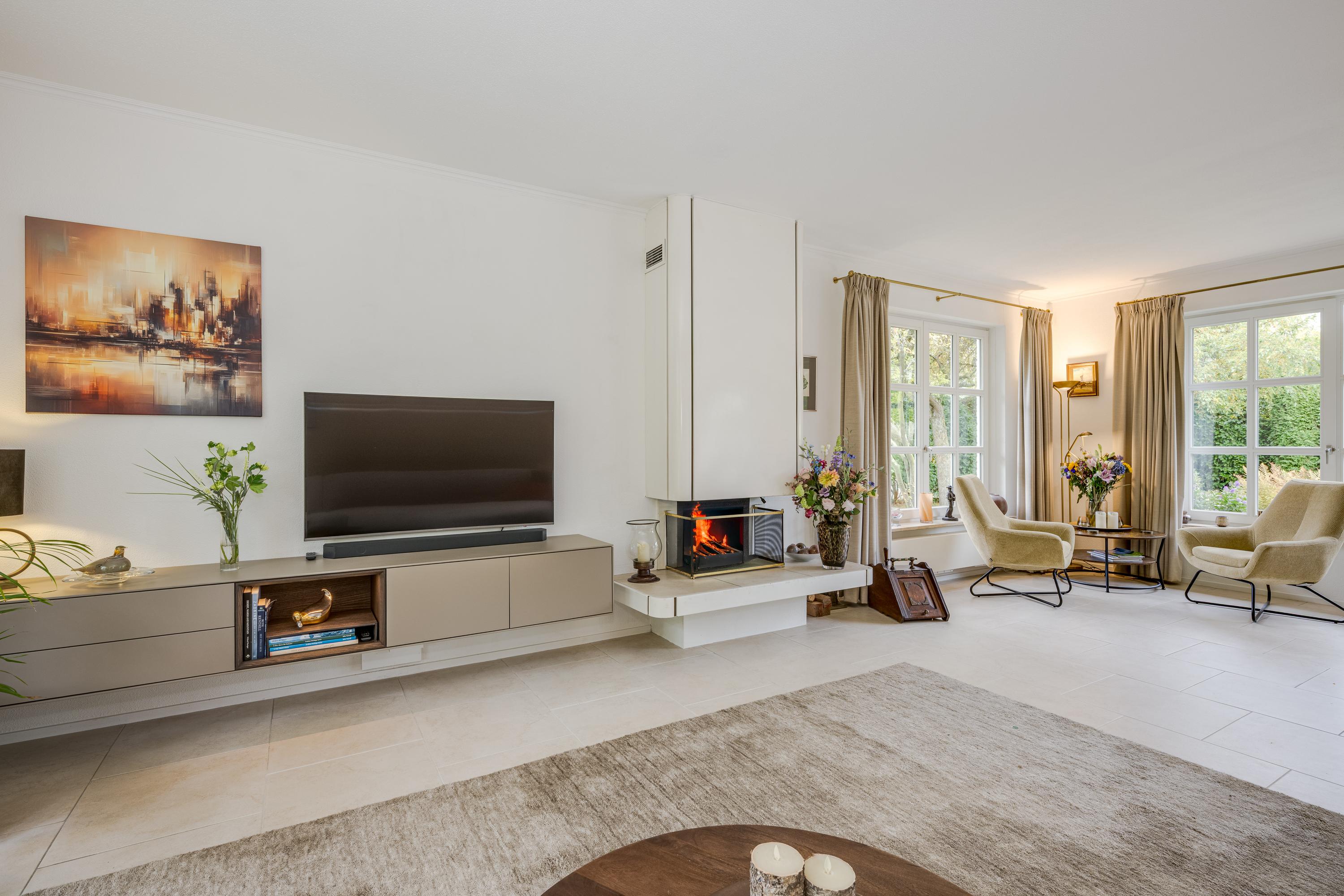 Entrance with spacious hall, toilet, and cloakroom. Double doors open into the bright and spacious living/dining room of approximately 55 m², featuring large windows, sliding doors to the terrace, and a cozy wood-burning fireplace.