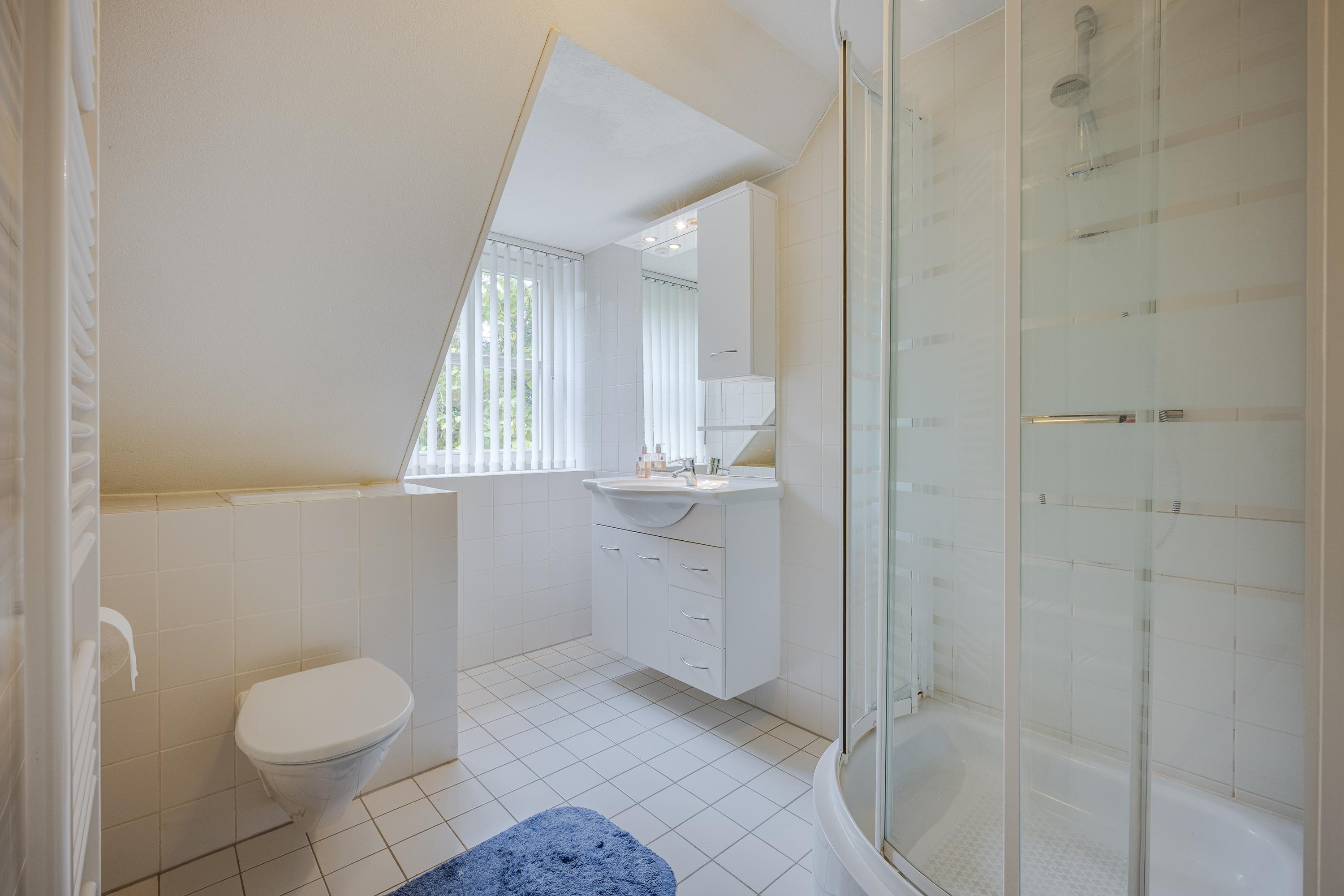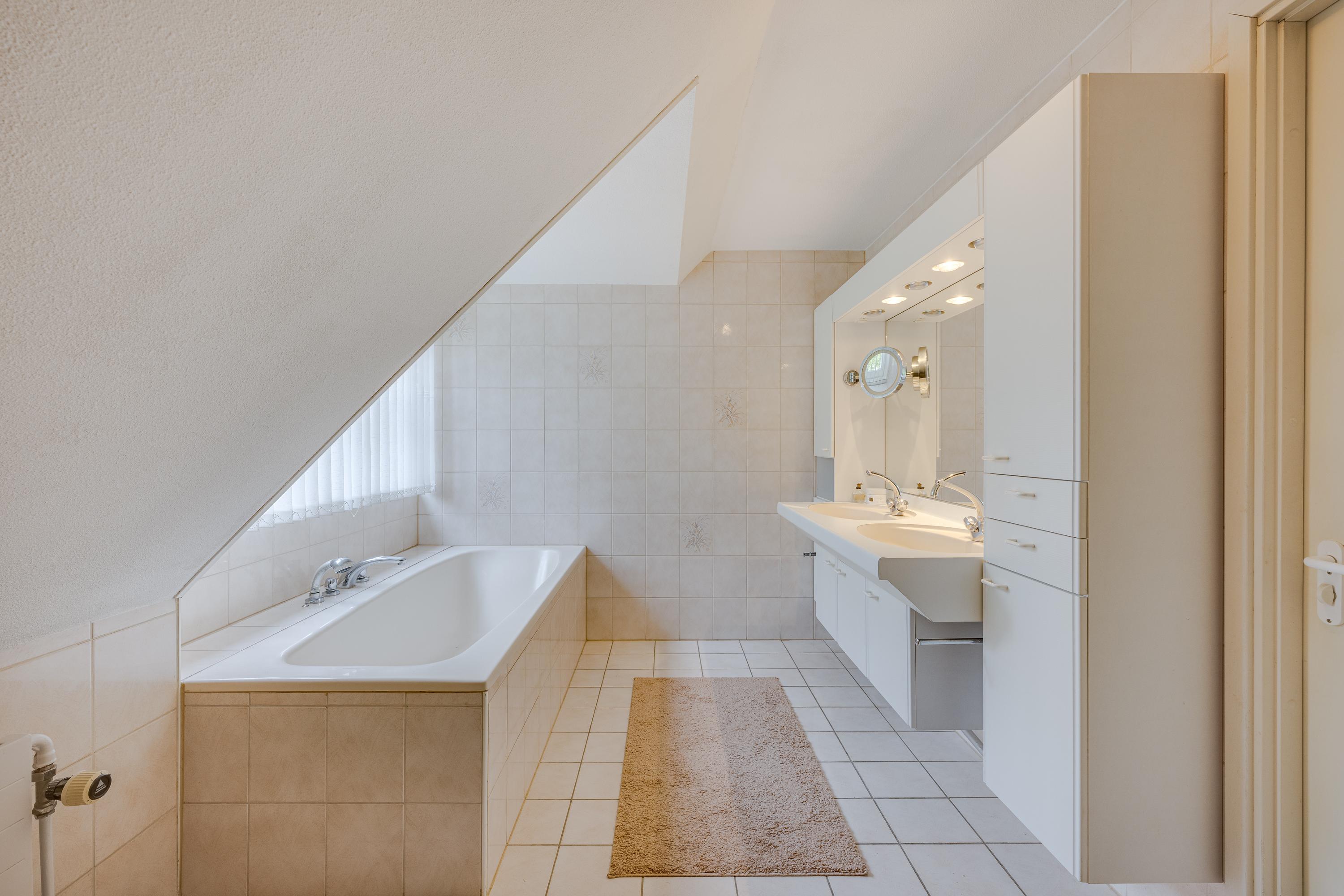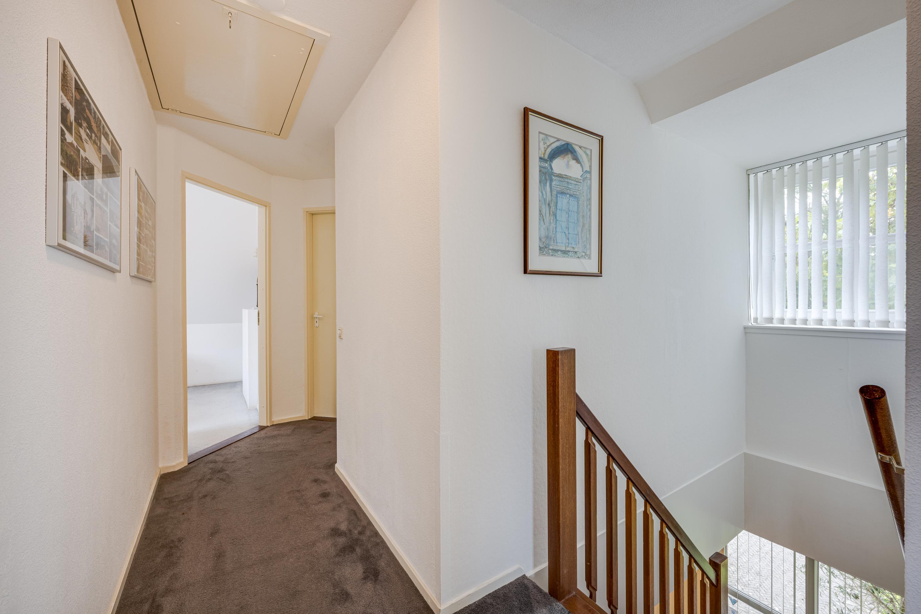 The spacious, bright kitchen/diner is equipped with all the usual built-in appliances and ample cupboard space. Adjacent is a utility room with connections for a washing machine and dryer, plus a hatch to the (wine) cellar (approx. 2.3 x 1.4 m). The integrated garage (approx. 5.4 x 3.1 m) is accessible from the utility room.