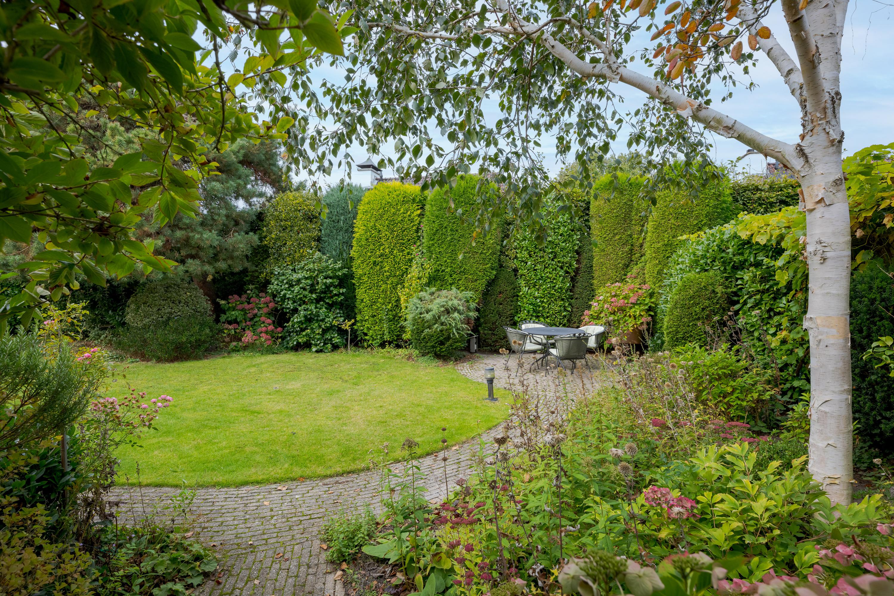 The beautifully landscaped garden surrounding the house offers several terraces and seating areas, where you can choose between sun and shade throughout the day. The mature planting ensures complete privacy and a green view year-round.