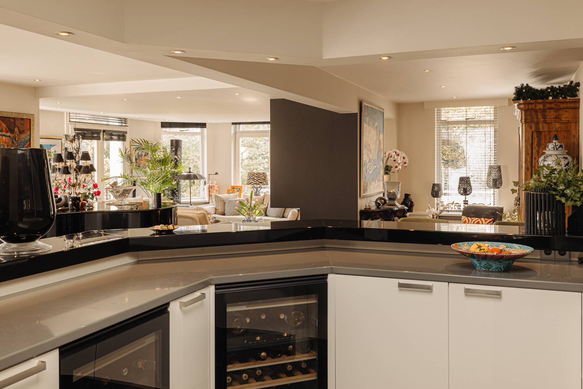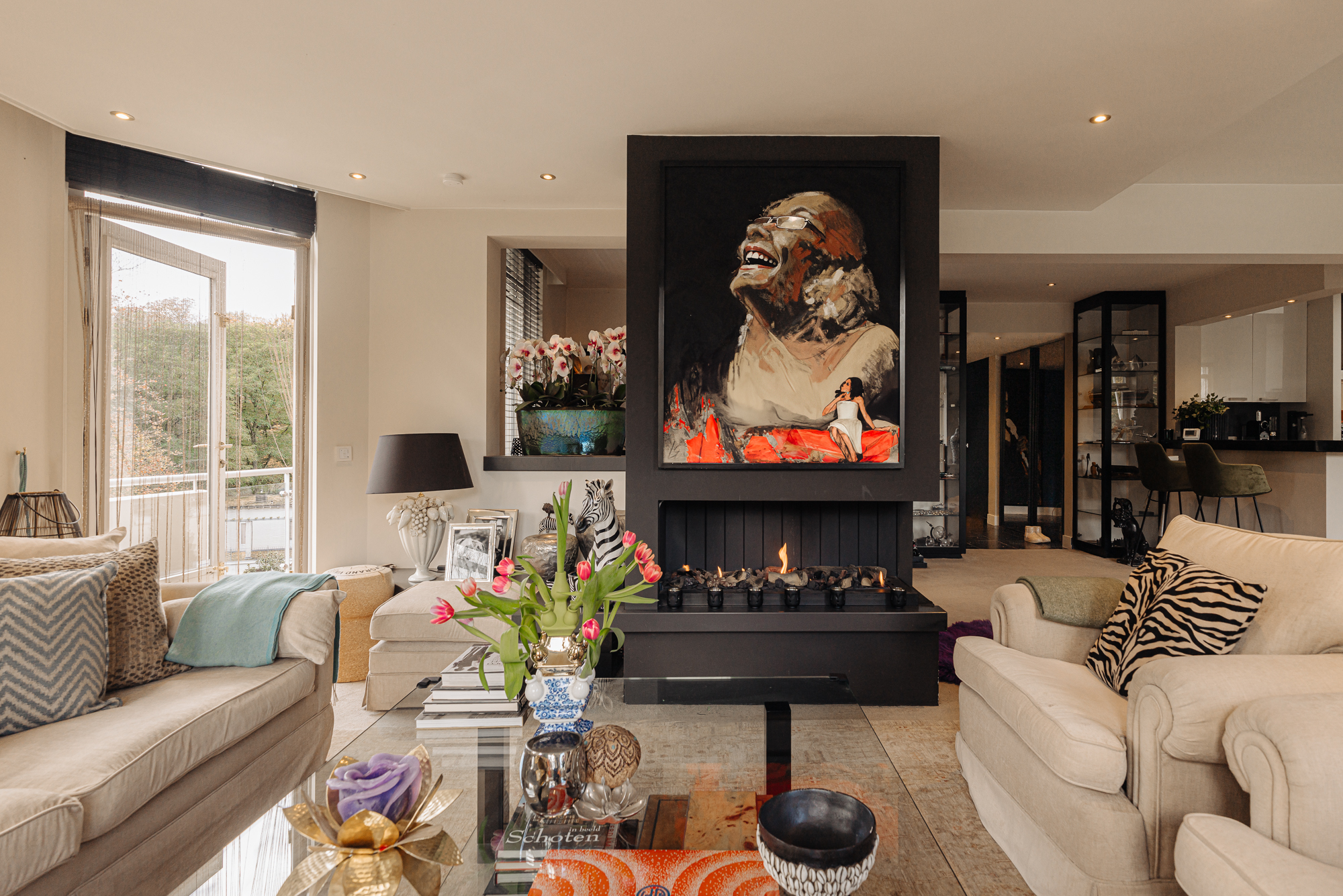 Spacious living room (three combined rooms) with a gas fireplace, large windows, and stunning views. Two balconies surrounded by greenery. The semi-open designer kitchen features high-quality Miele appliances, including two ovens, wine coolers, and a large bar.