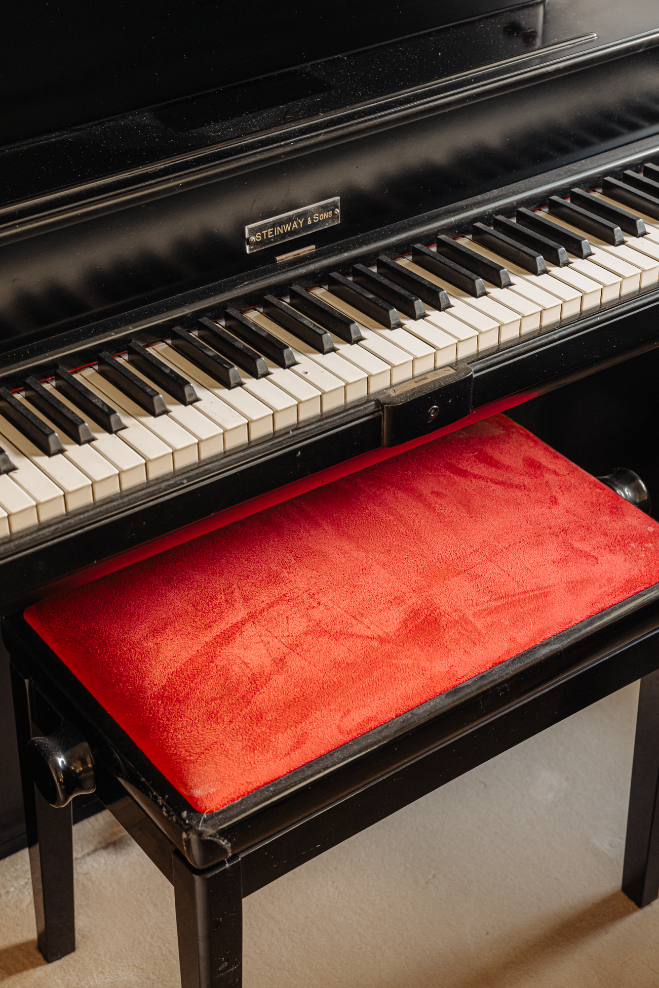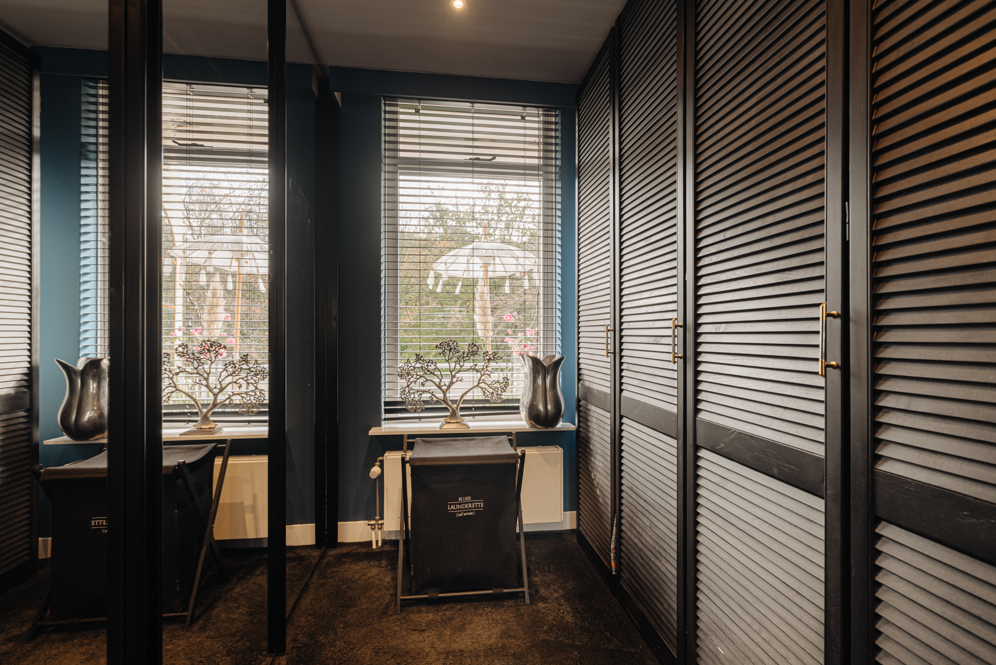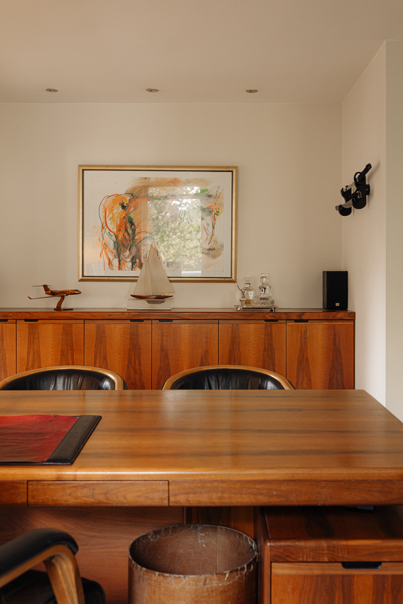 Separate laundry room and separate storage room in the hallway. Stylish office with walnut cabinets and a desk.