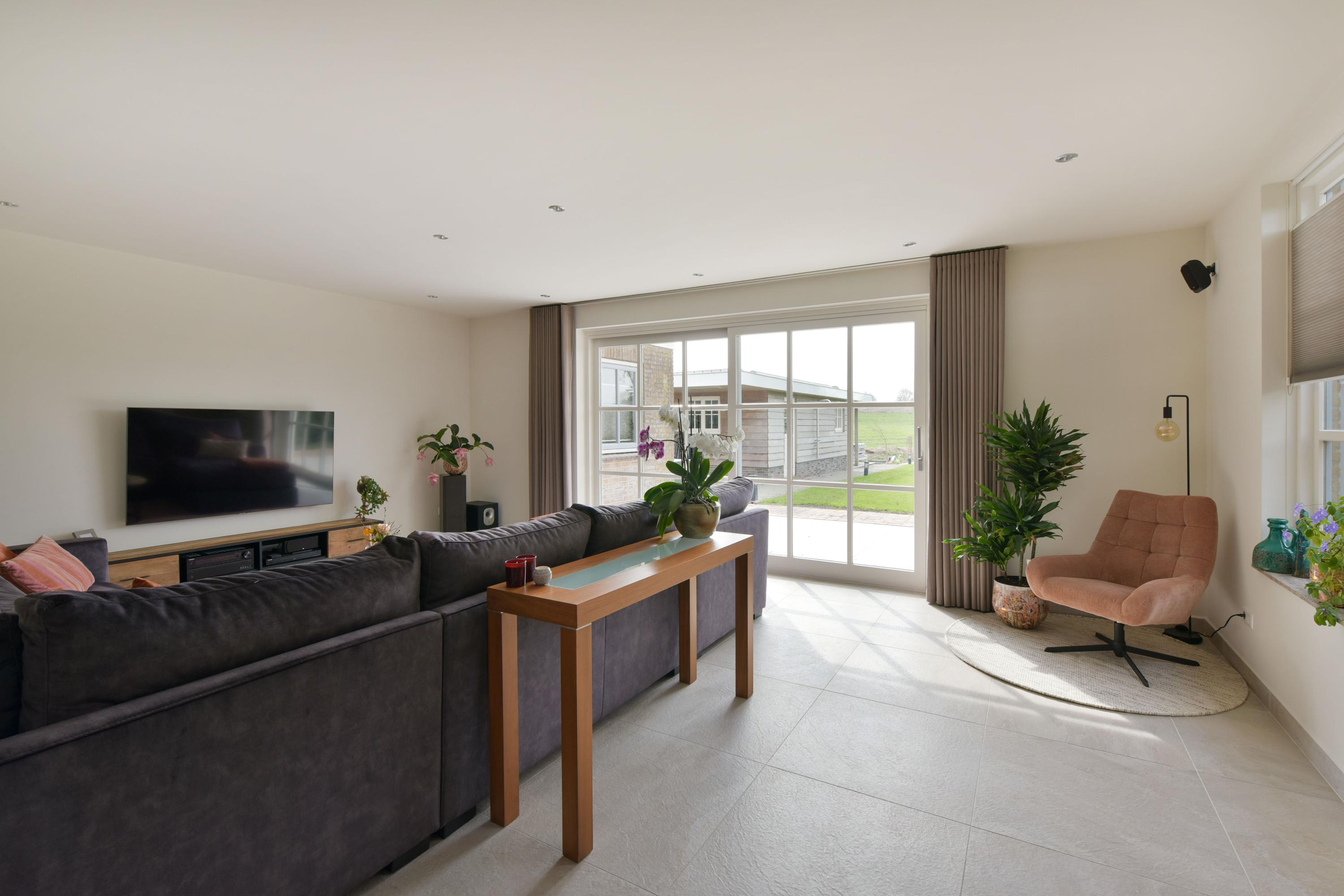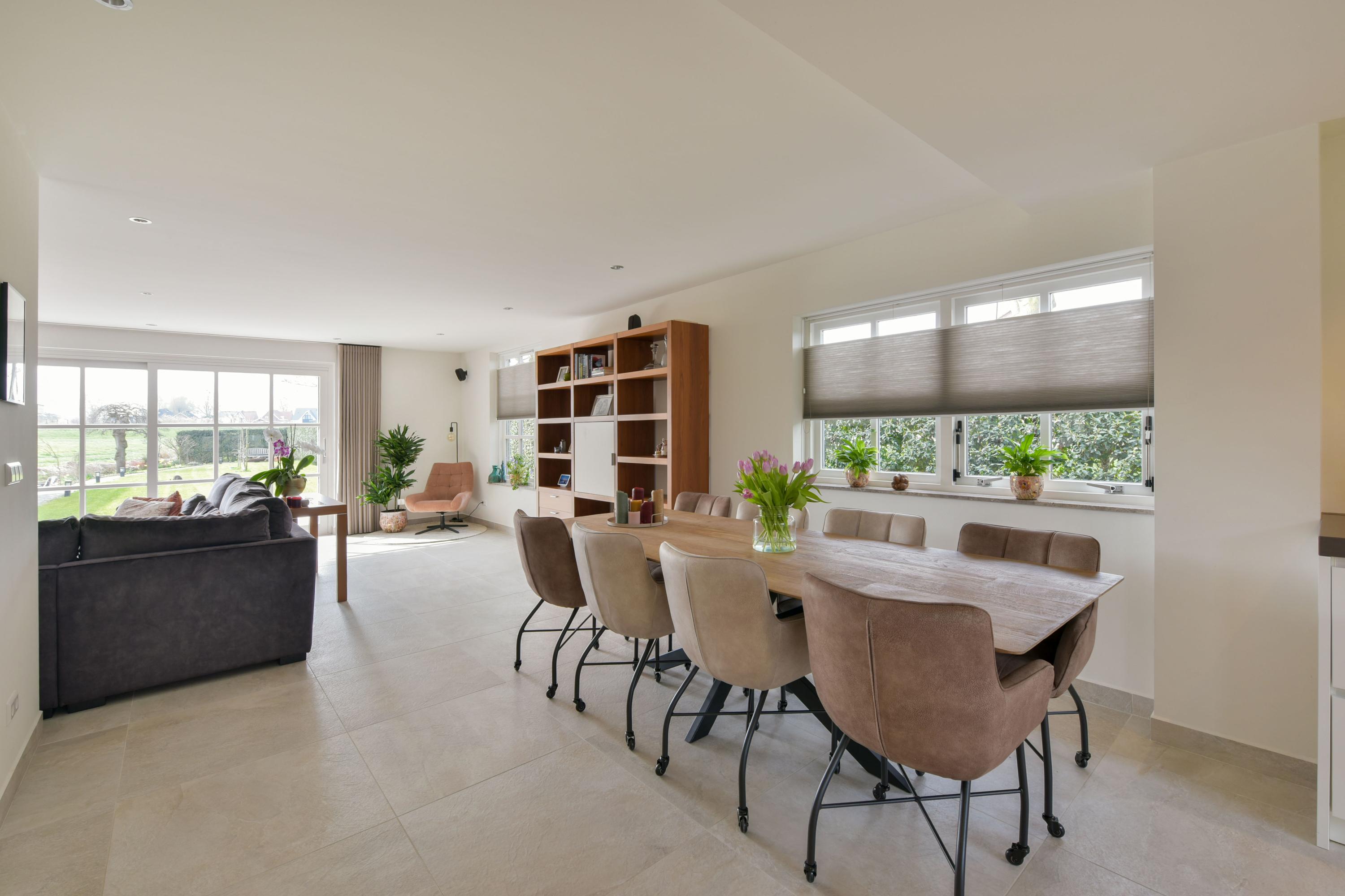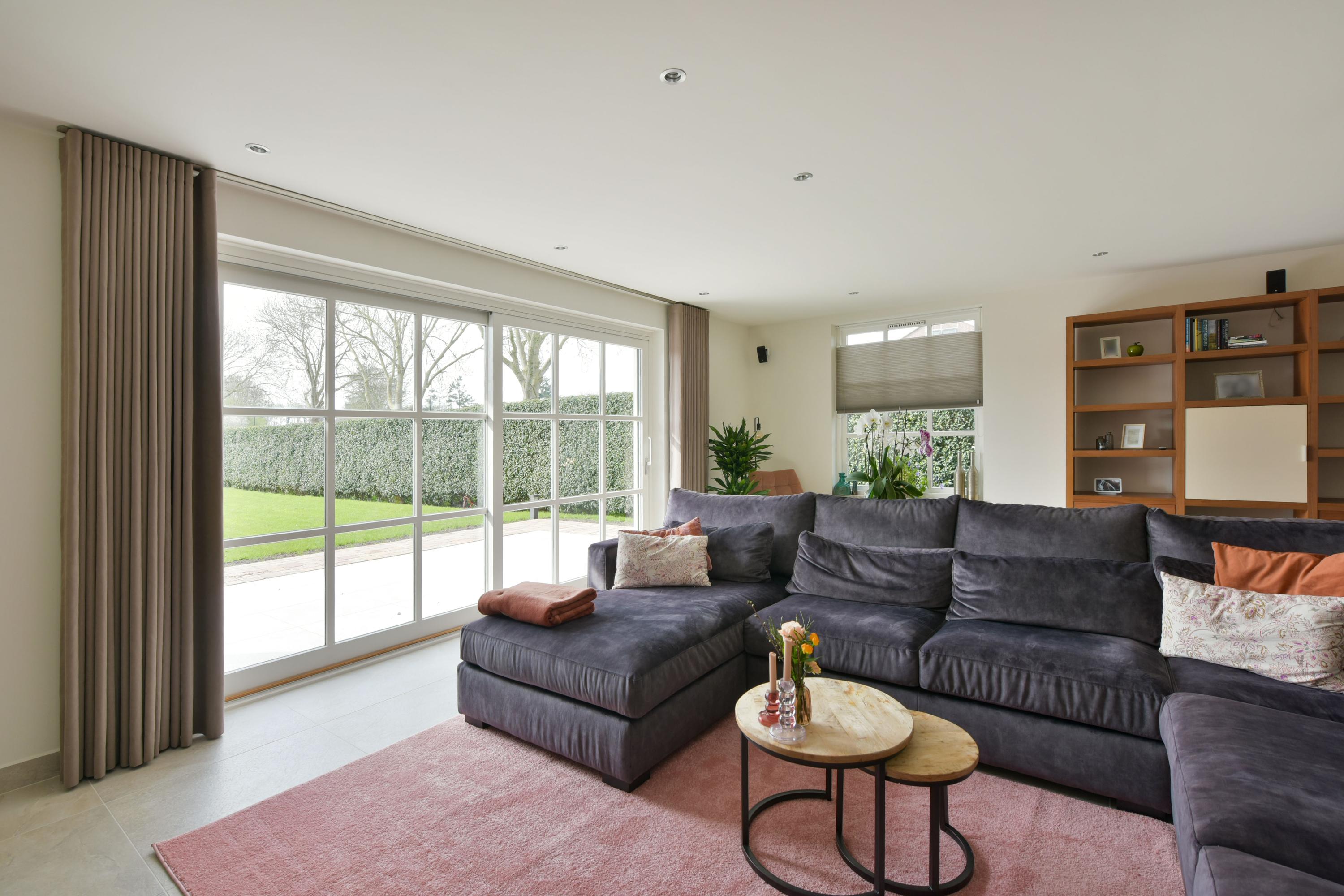 The L-shaped living room is located at the rear of the house and serves as a delightful space to gather. Large windows and sliding doors provide an abundance of natural light and create a seamless connection to the garden. The unobstructed views over the greenery ensure that every season has its own charm.