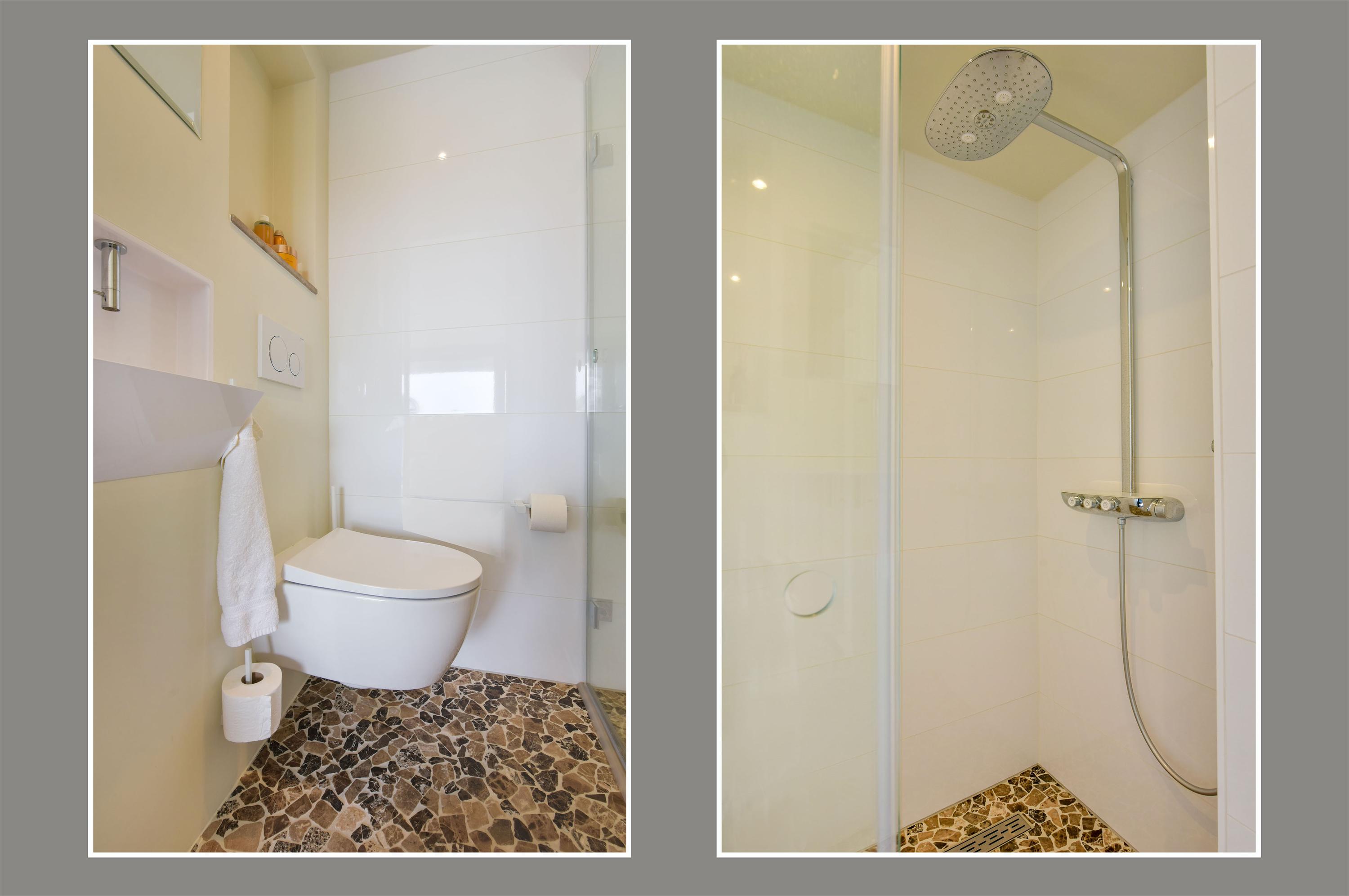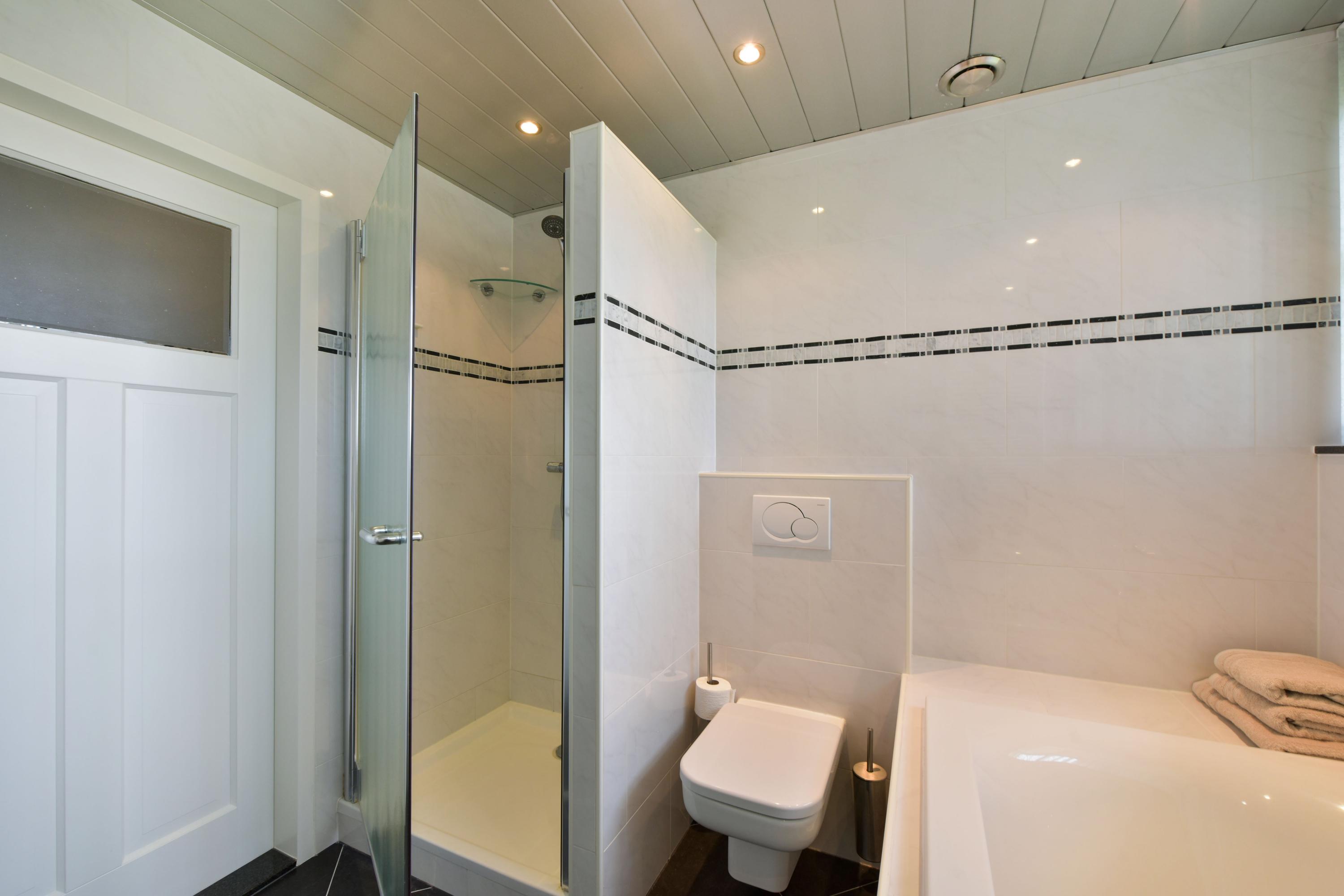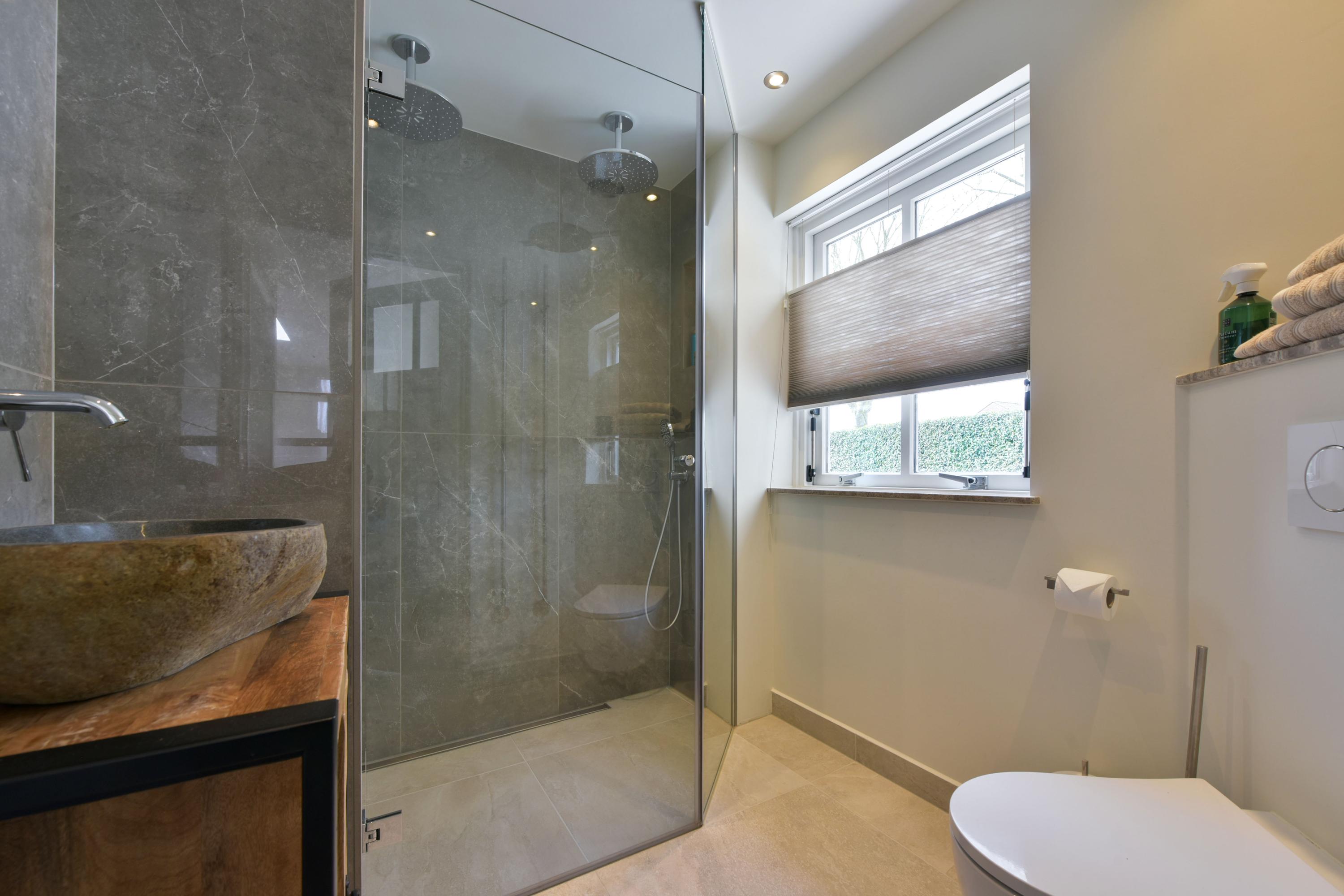 From the central hall, you also reach the multifunctional room, formerly the garage. This space is now fully integrated into the home and offers numerous possibilities, such as a home office, practice space, or additional living area. Here you will also find a modern bathroom (2022), equipped with double rain showers, a washbasin, toilet, and designer electric towel radiators. This makes having a bedroom on the ground floor entirely feasible.
