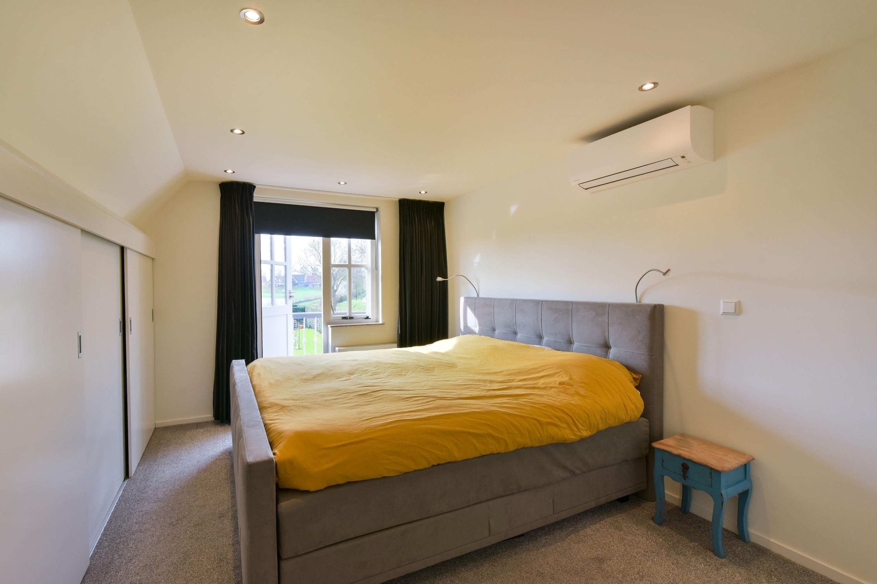 The second floor, accessible via a fixed spiral staircase, offers two additional bedrooms. The rear bedroom is also equipped with air conditioning. Both rooms include TV and internet connections and are neatly finished with laminate flooring and recessed spotlights.