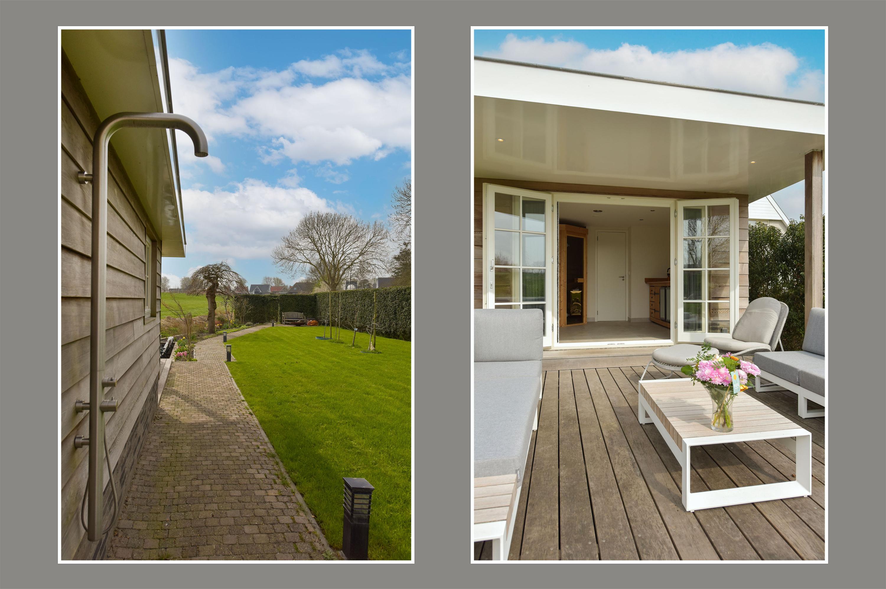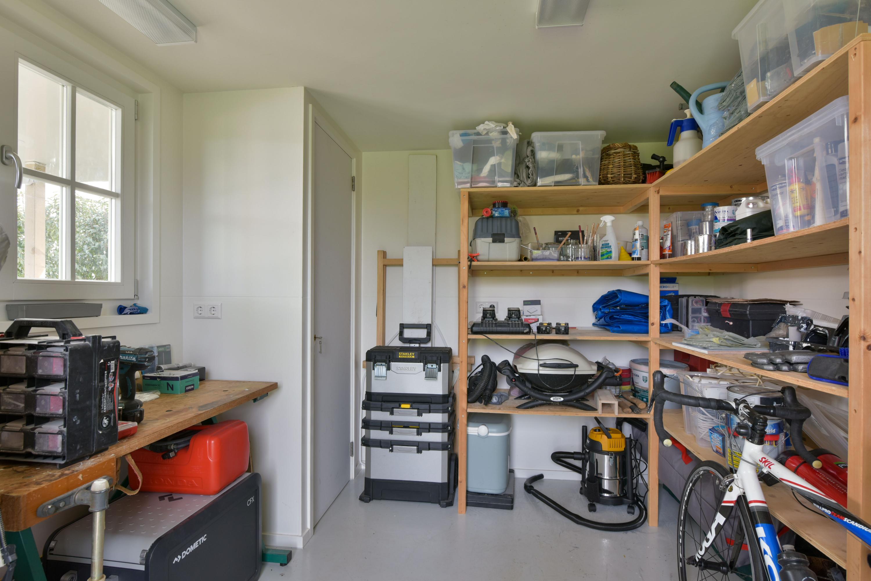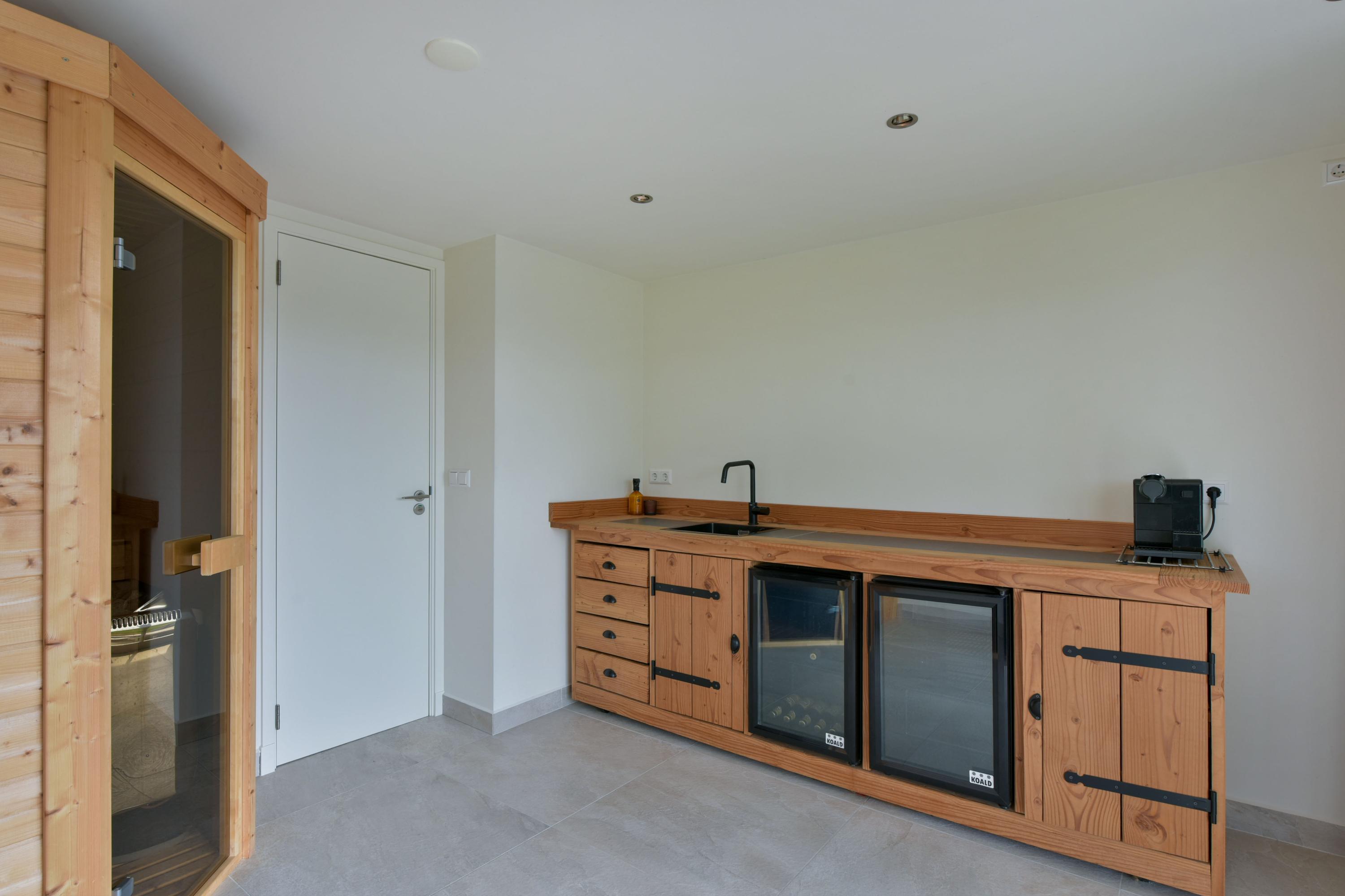 The outbuilding offers an exceptional amount of storage space and is even equipped with underfloor heating. At the front, there is a practical storage area housing the inverter for the solar panels. At the rear, you will find a luxurious relaxation area featuring a sauna with a bio-stove, allowing you to choose between a Finnish sauna, steam sauna, herbal sauna, or aromatic sauna. Additional features include a rain shower, toilet, and a wooden kitchenette with two professional-grade refrigerators—a true space dedicated to relaxation.