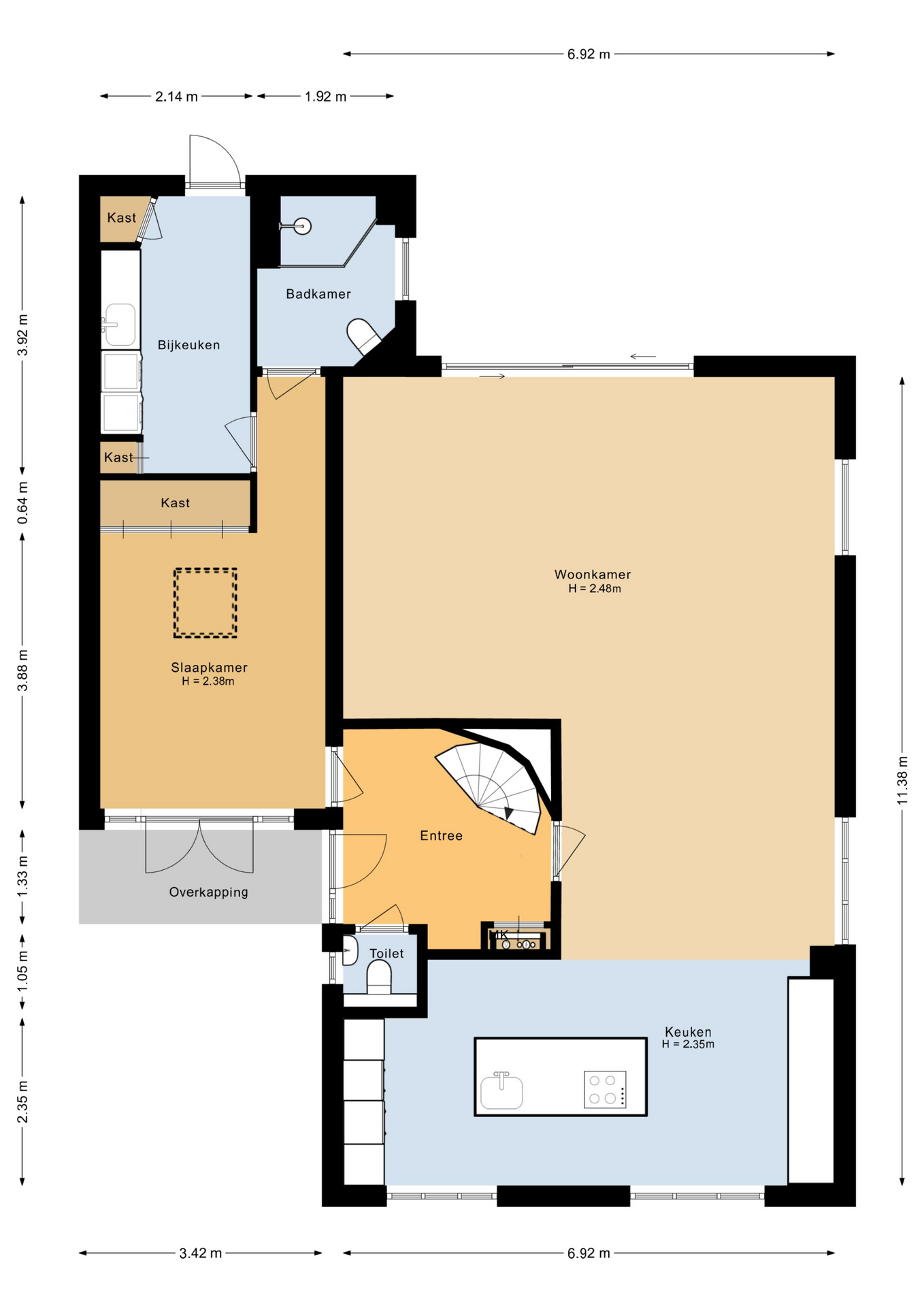 A separate laundry room with space for a washing machine and dryer, a small kitchenette, and a neatly concealed central heating system (2020) complete the ground floor. From this utility room, you have direct access to the garden.