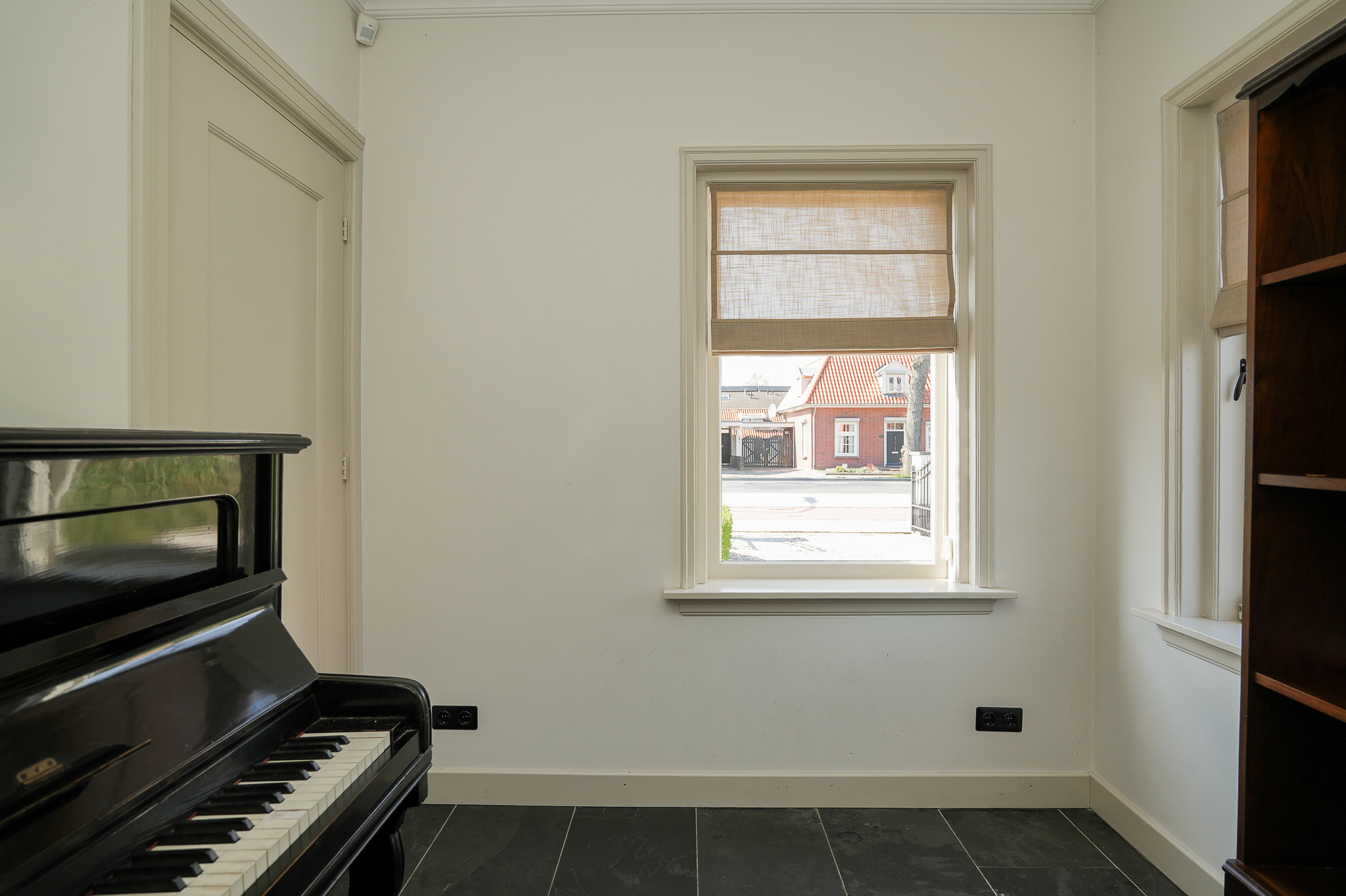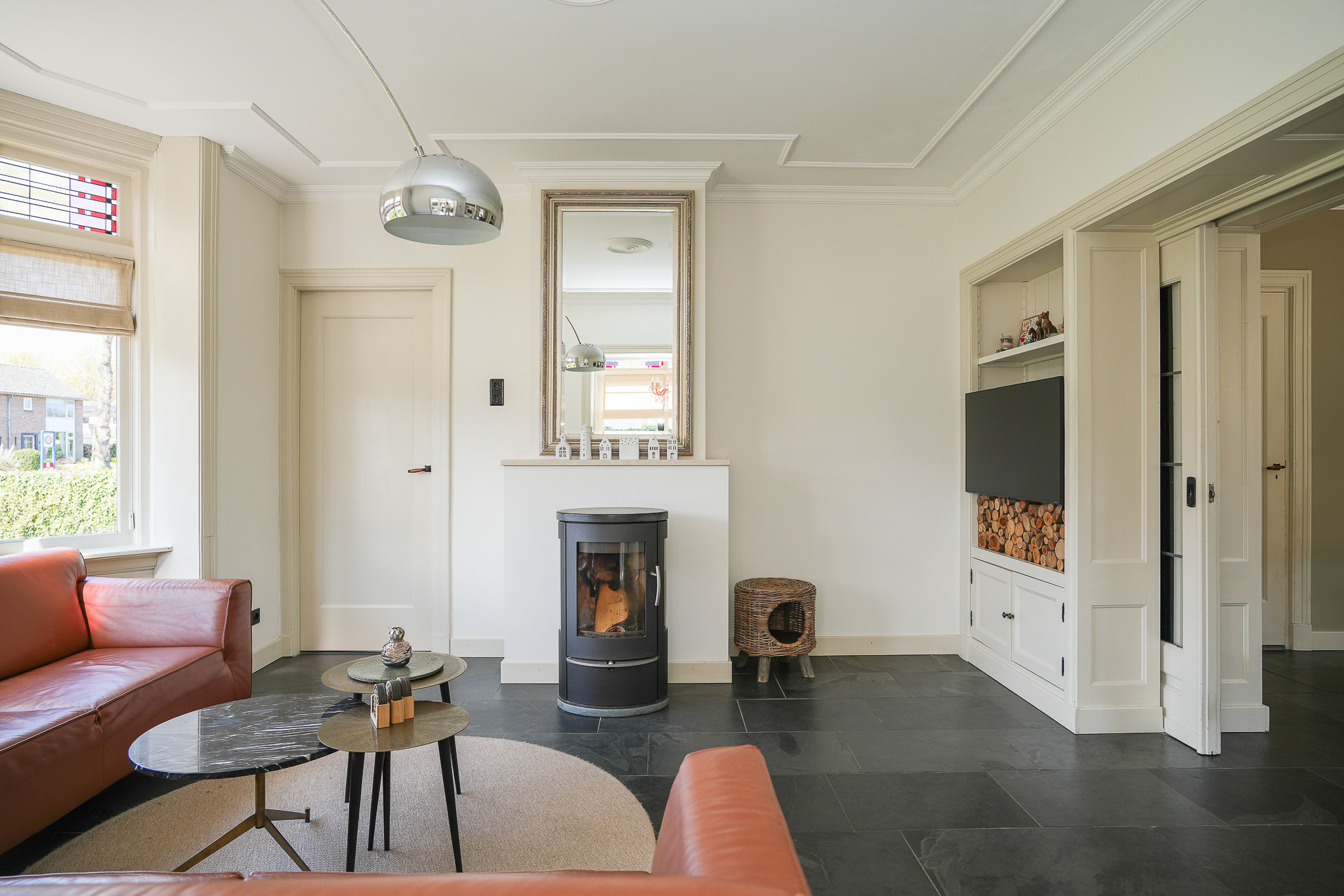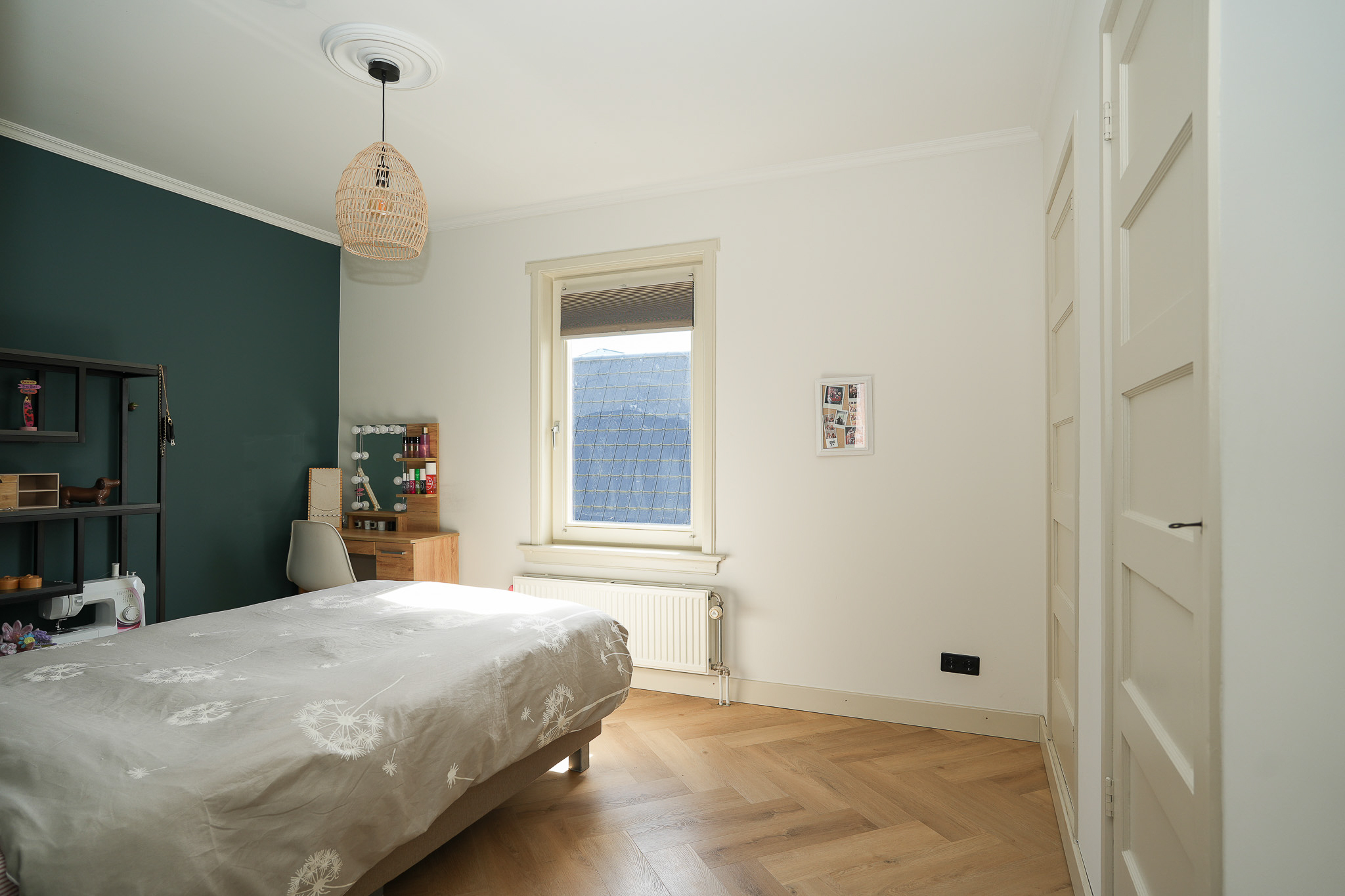 The electrical installation has been completely renewed, incorporating retro-style switches combined with Philips Hue lighting. Twelve solar panels have been installed on the flat roof, and the main roof was fully renovated in 2024, including new battens and tiles. The zinc work had already been renewed the year before.