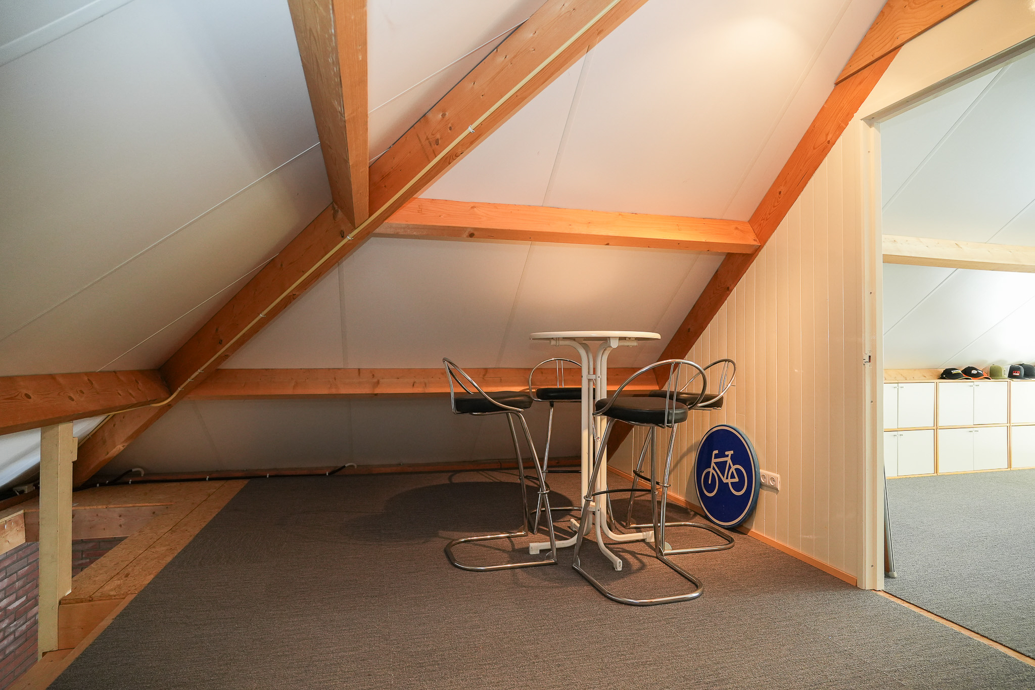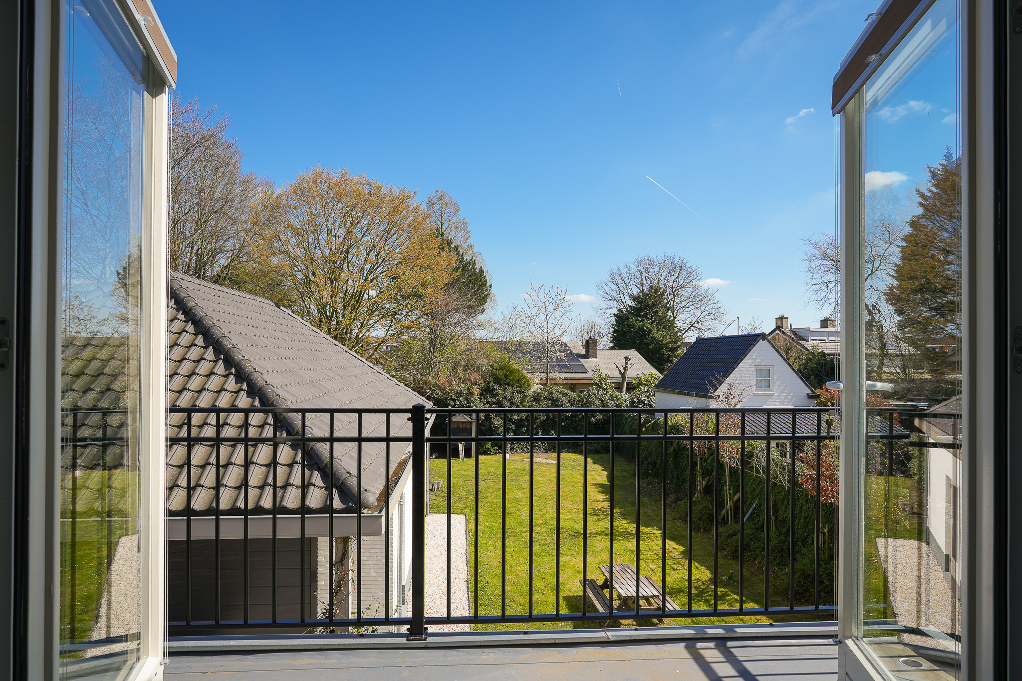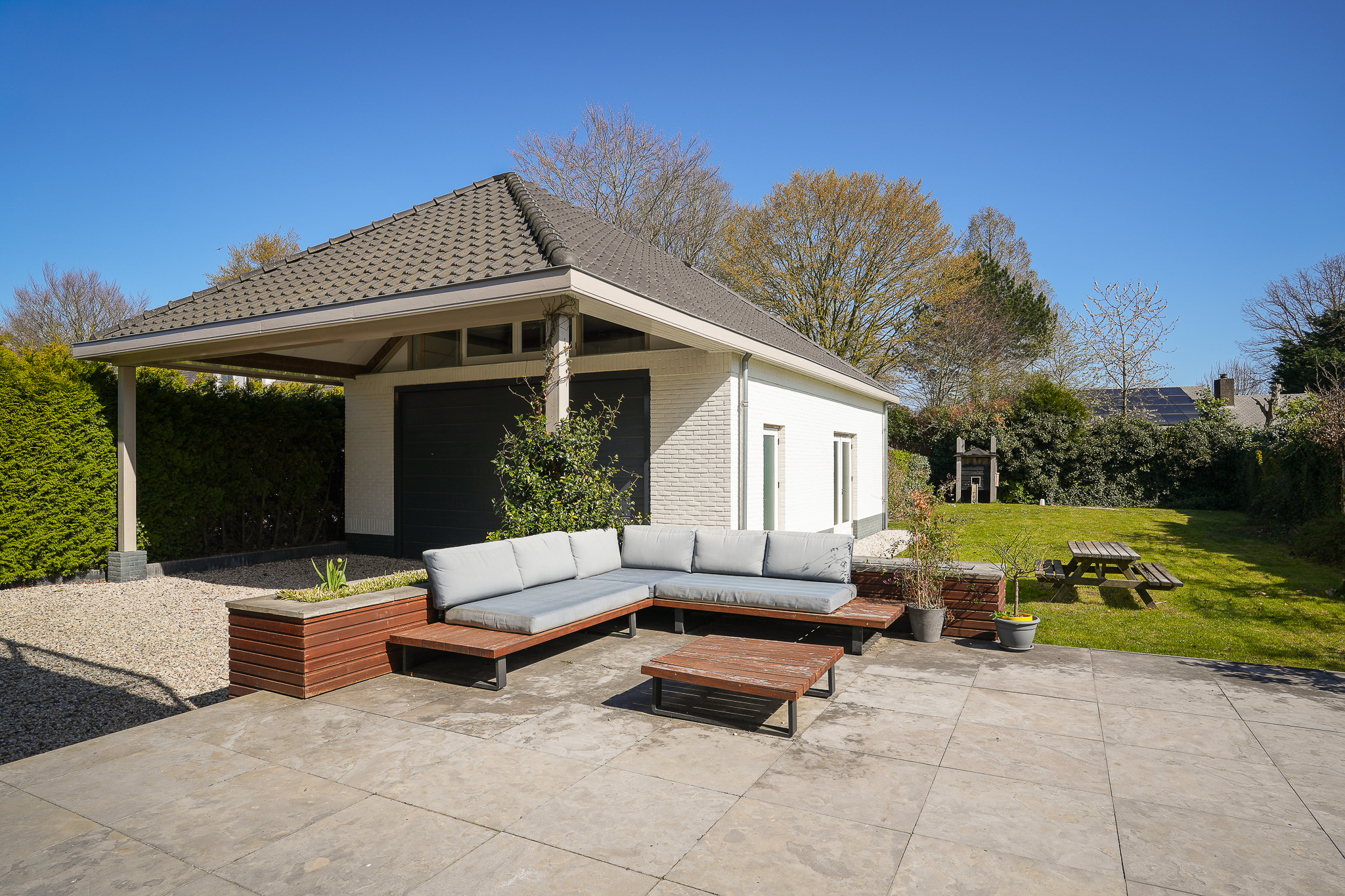 The electrical installation has been completely renewed, incorporating retro-style switches combined with Philips Hue lighting. Twelve solar panels have been installed on the flat roof, and the main roof was fully renovated in 2024, including new battens and tiles. The zinc work had already been renewed the year before.