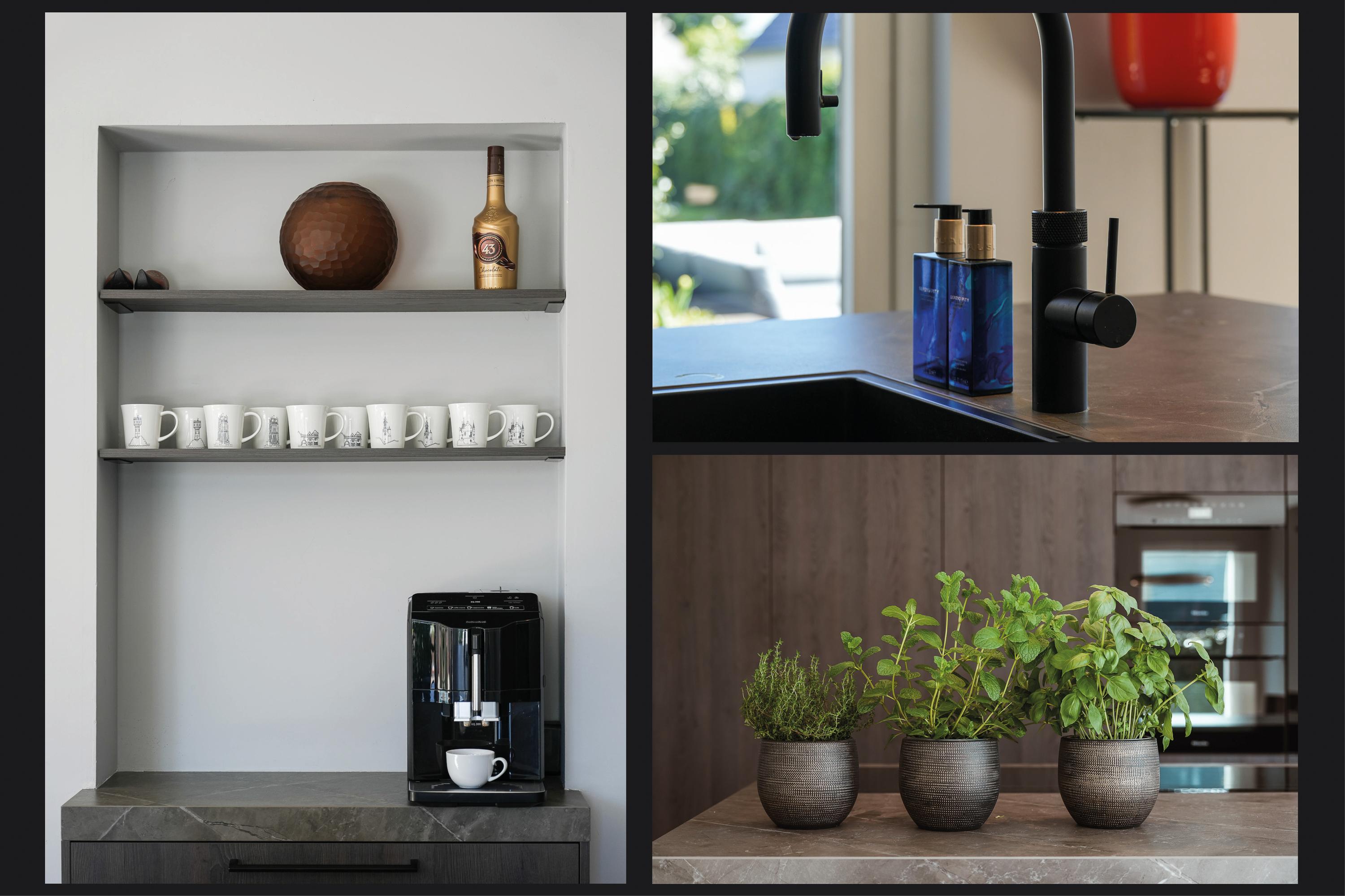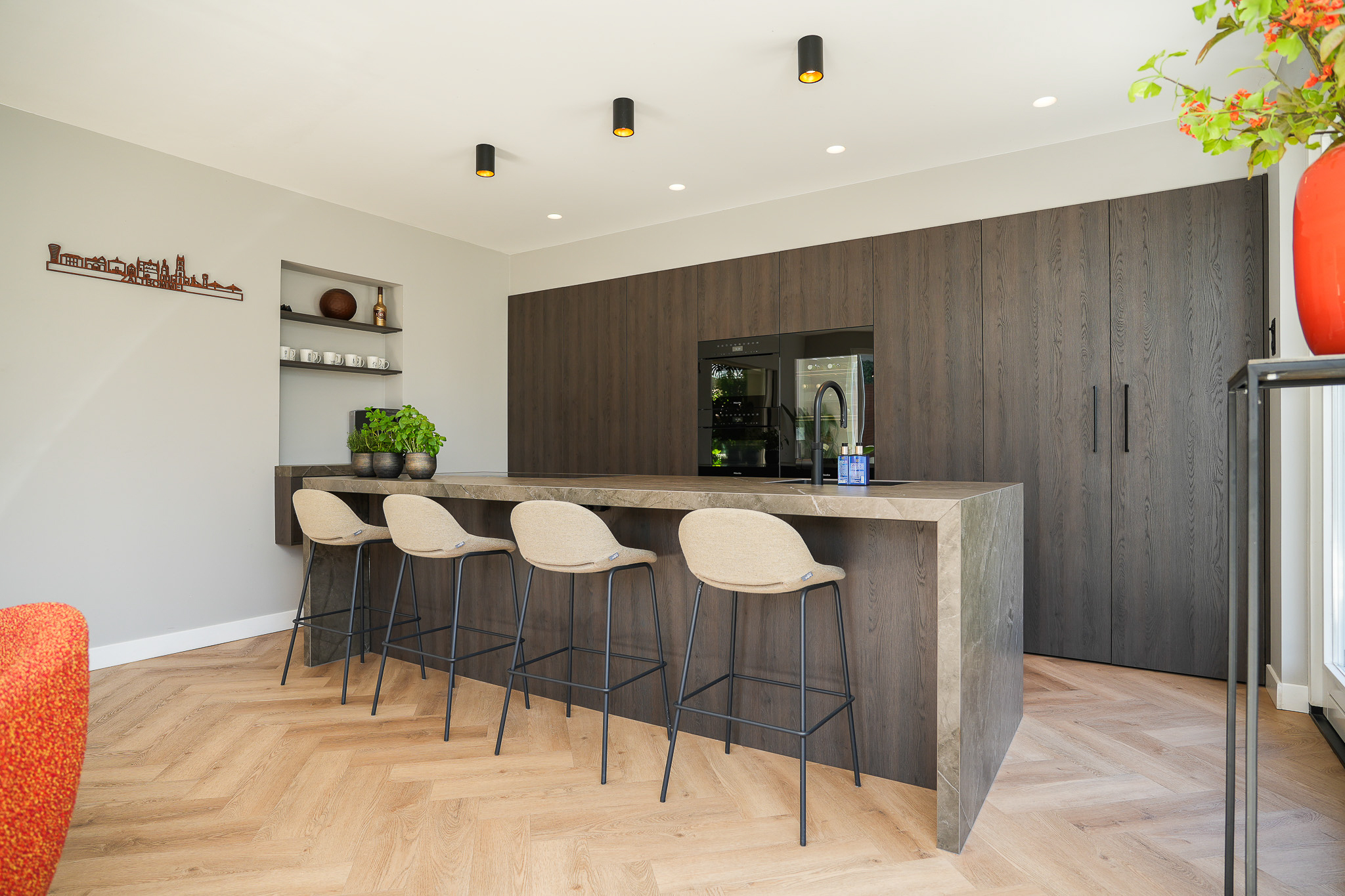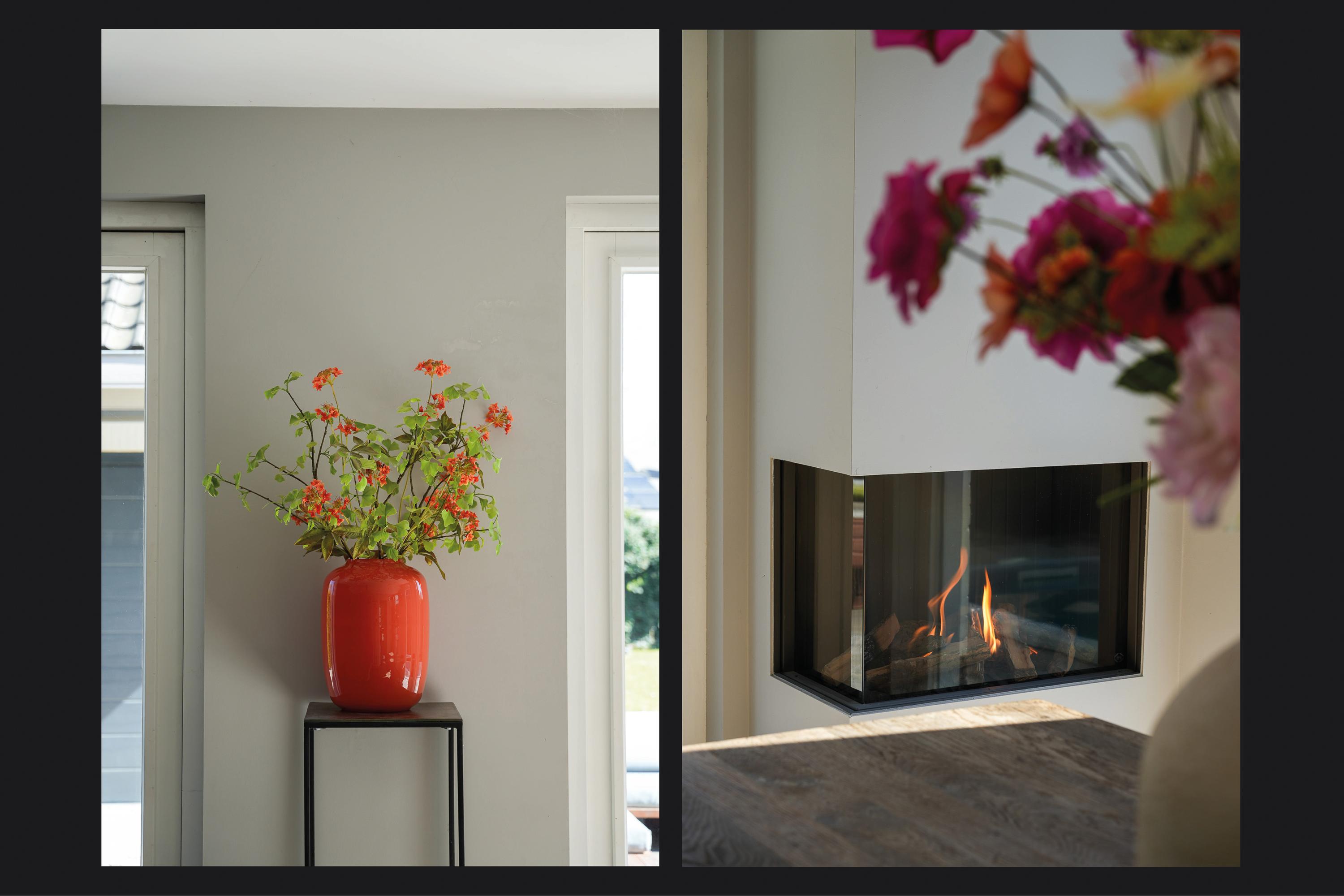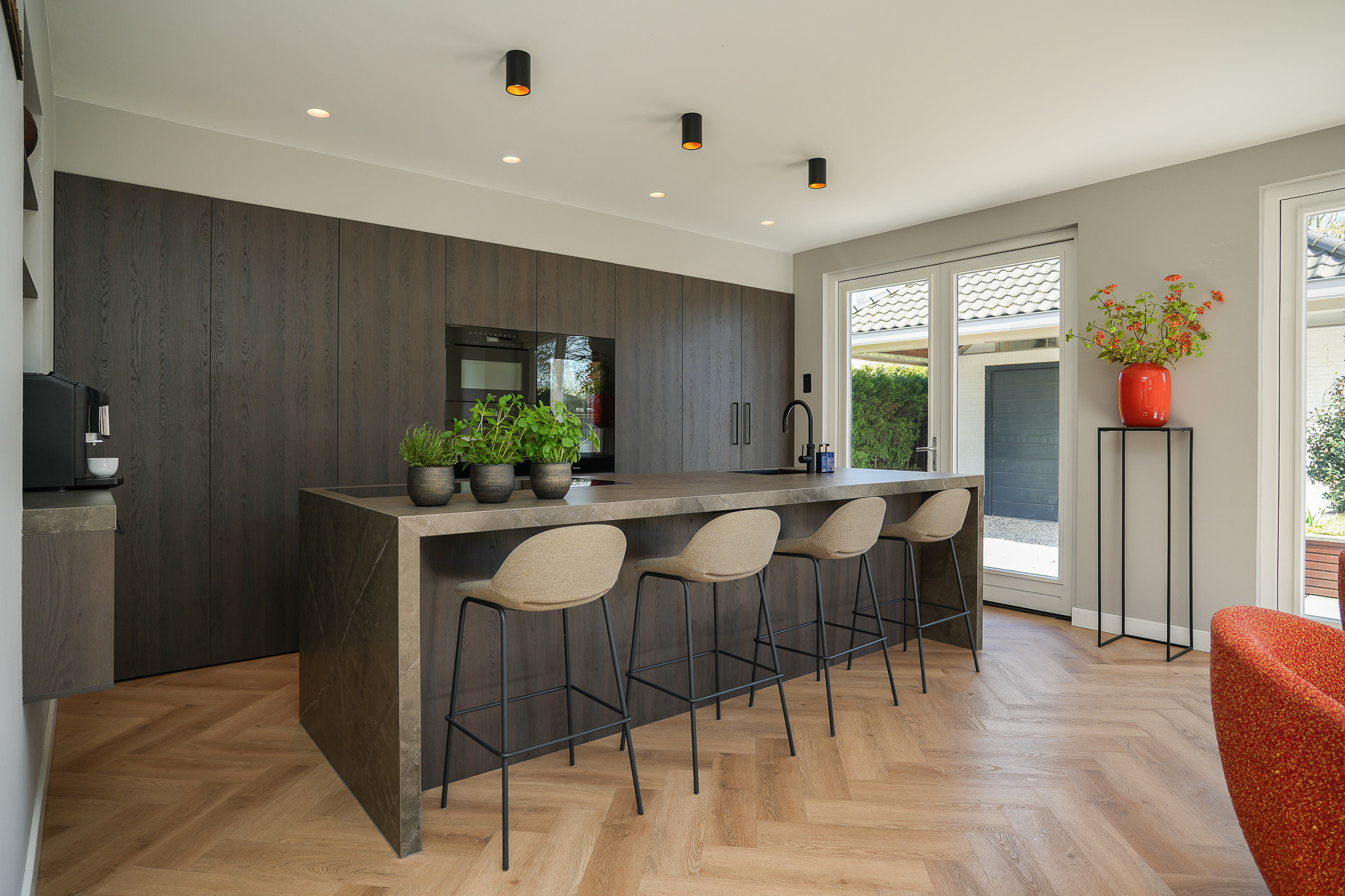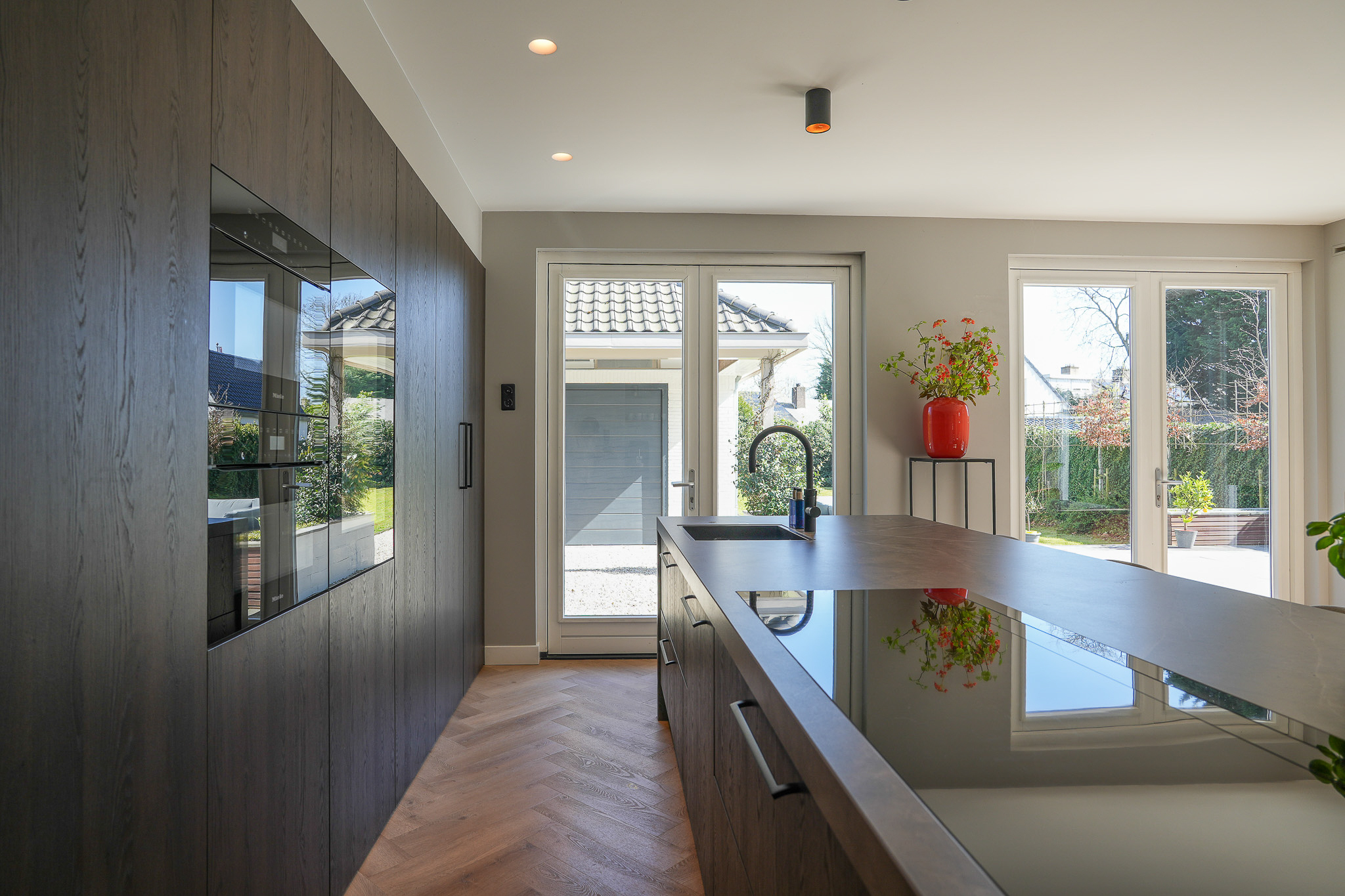 The kitchen is finished to a high standard, featuring a wide wall of cabinetry with premium built-in appliances and a large island with a Dekton worktop. On the dining side, the island incorporates a breakfast bar near the coffee corner. Adjacent to the gas fireplace there is space for a large dining table. Two sets of French doors provide an abundance of natural light and direct access to the full-width terrace and garden.