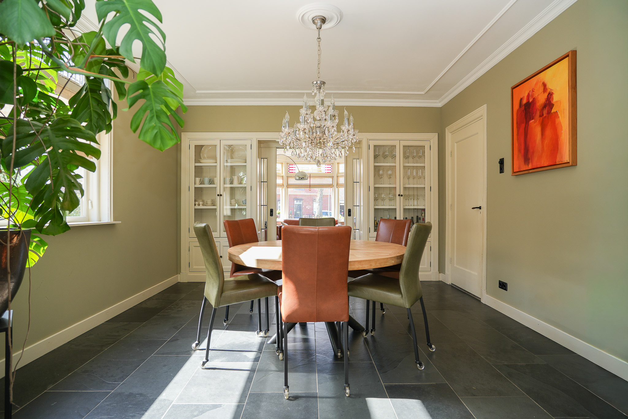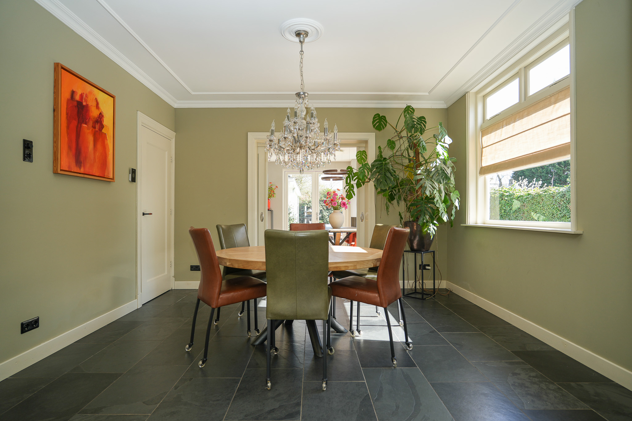 Double en suite doors with stained glass, flanked by built-in cupboards, lead to the rear room, which connects directly to the kitchen-diner. This kitchen-diner is located in the extension completed in 2021/2022 and is fully oriented towards the garden. It forms the heart of the home, with views of the garden and direct access outside.