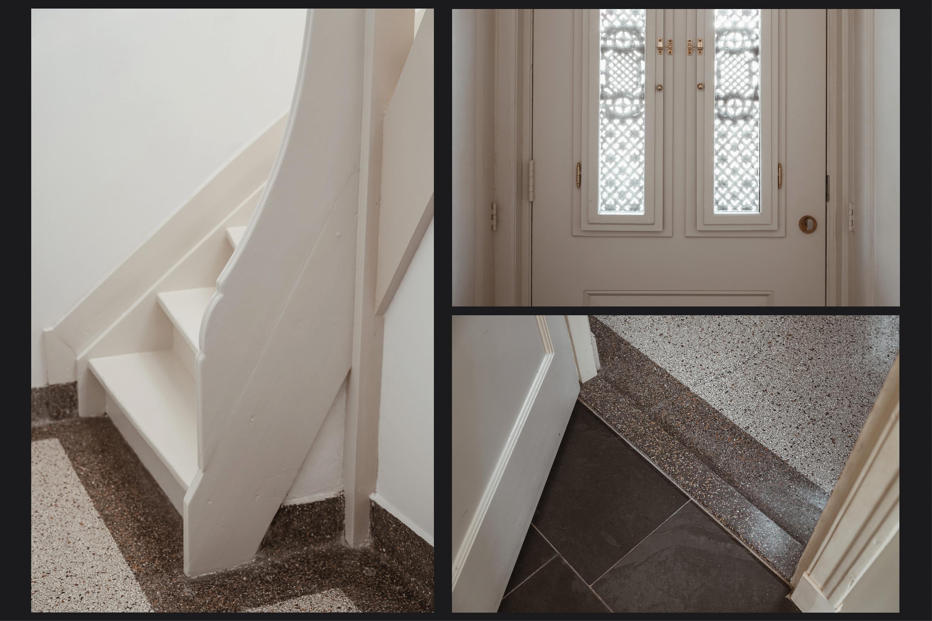 The side entrance is accessed via the wide driveway. The entrance hall provides access to the living room en suite, the cloakroom and the wine cellar. The terrazzo floor, staircase and beautifully preserved panelled doors with traditional ironmongery are fine examples of the original pre-war craftsmanship.
