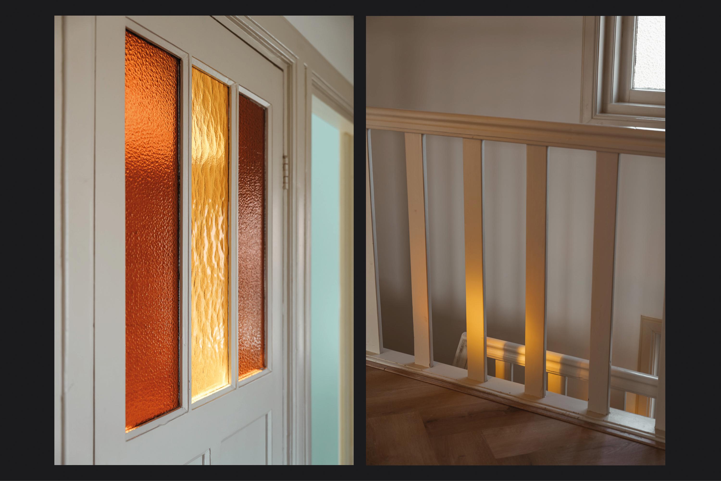 The living room en suite is wonderfully bright, with windows facing south at both the front and rear. The front room features a fireplace with wood-burning stove, a high plastered ceiling with decorative mouldings and a bay window with stained-glass transoms. From here there is access to the music/study and the enclosed conservatory. In the conservatory, double doors open onto the side garden, where the stained-glass transoms have also been retained.