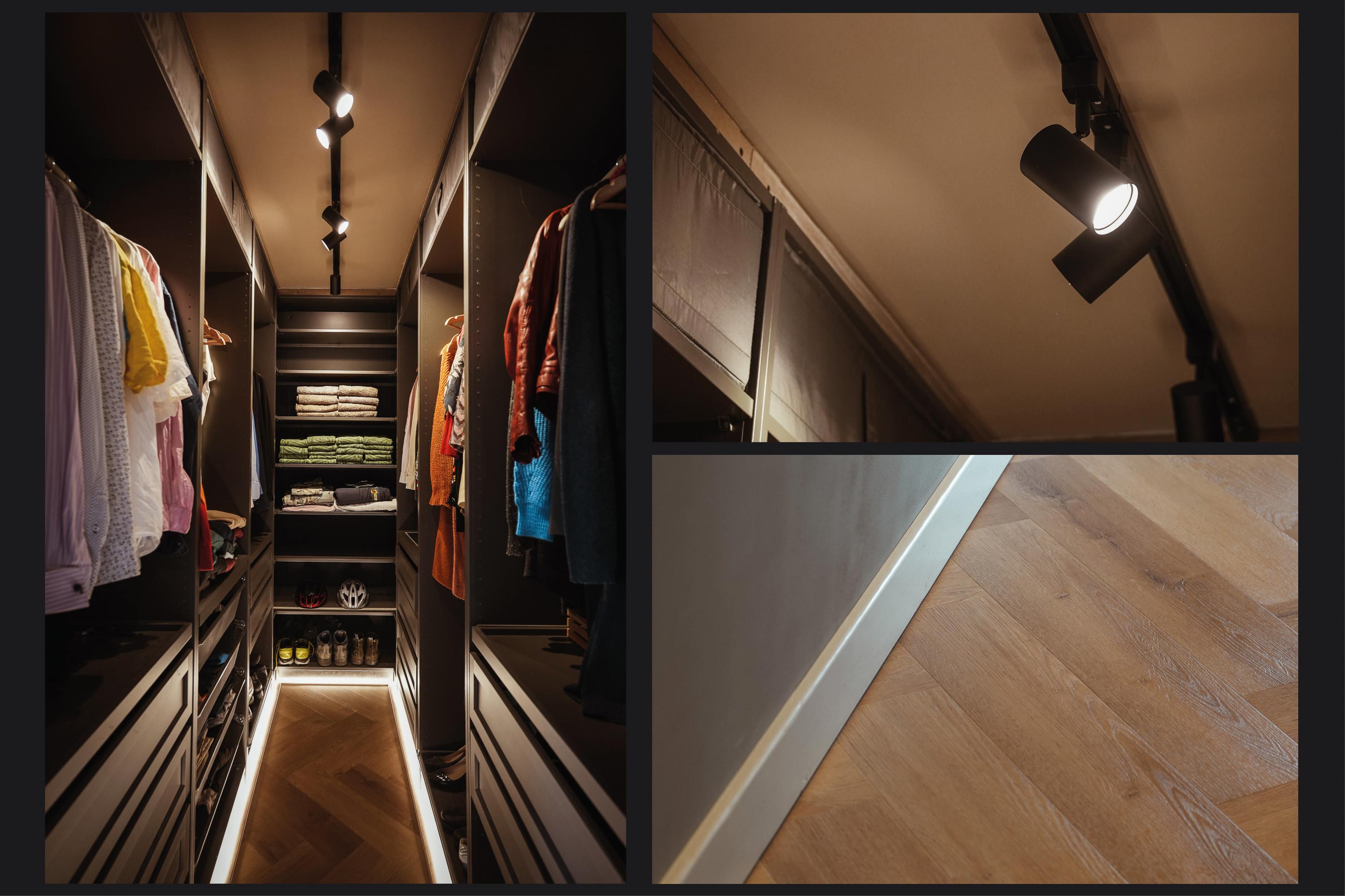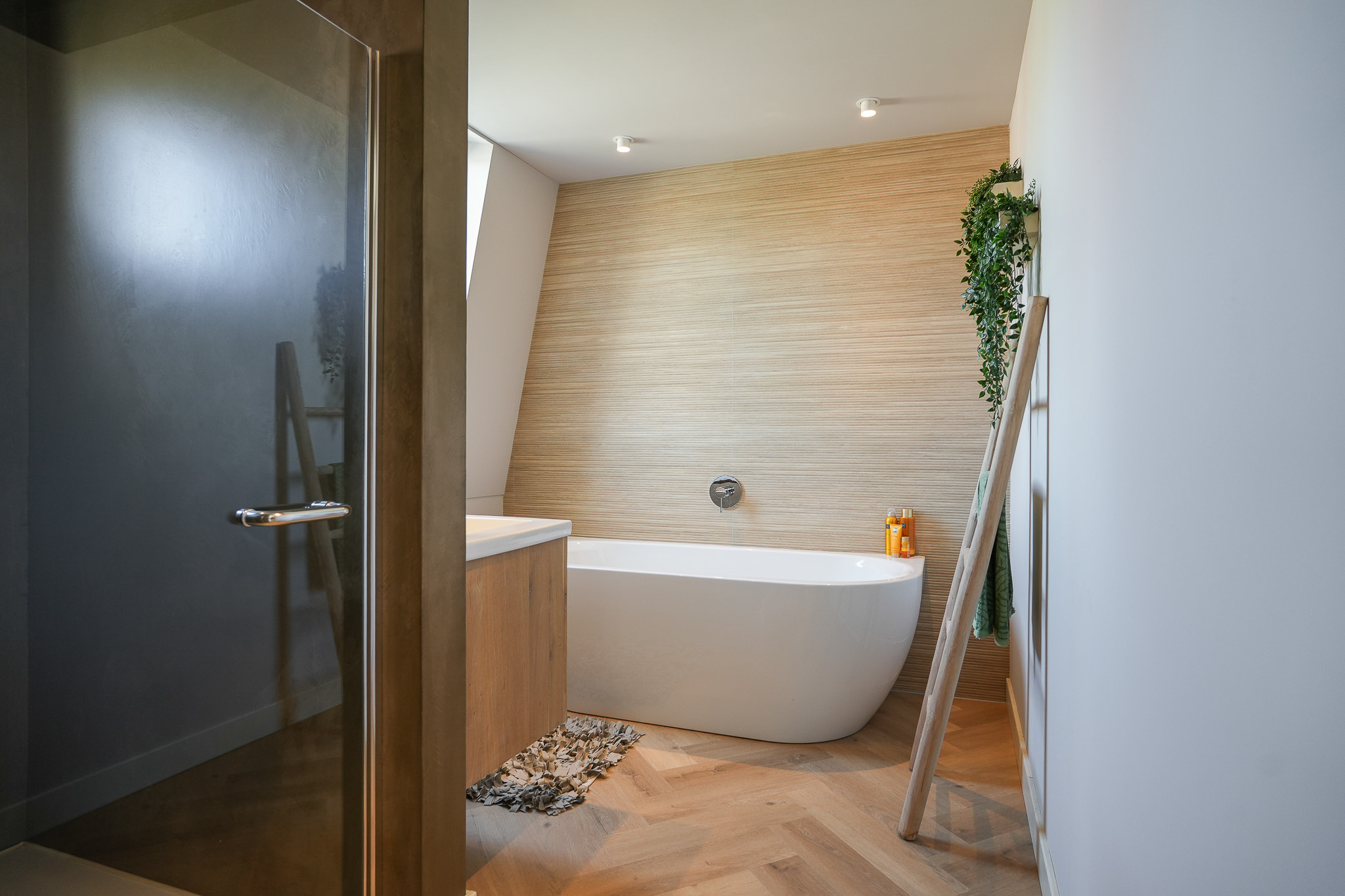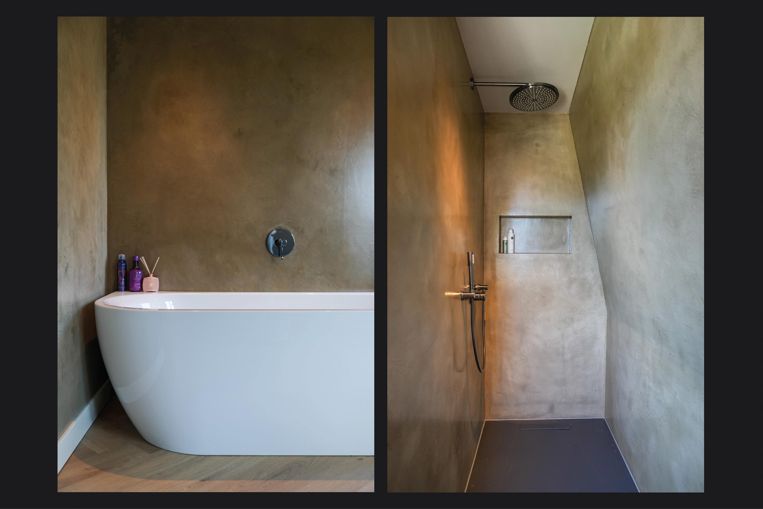 The landing reflects the care and attention given to the renovation. The new extension blends seamlessly with the original architecture. There is also a separate toilet on this level. In the rear extension is a bedroom with balcony, a luxurious open bathroom and a walk-in closet. The bathroom is fitted with a semi-freestanding bathtub, a spacious walk-in shower with rainfall shower and a stylish vanity unit. The wall behind the vanity is finished with hexagonal mosaic tiles, while the shower and bath areas feature concrete ciré finishes. Thanks to its east-facing position, the morning sun enters here, and the balcony is directly accessible from the bedroom.