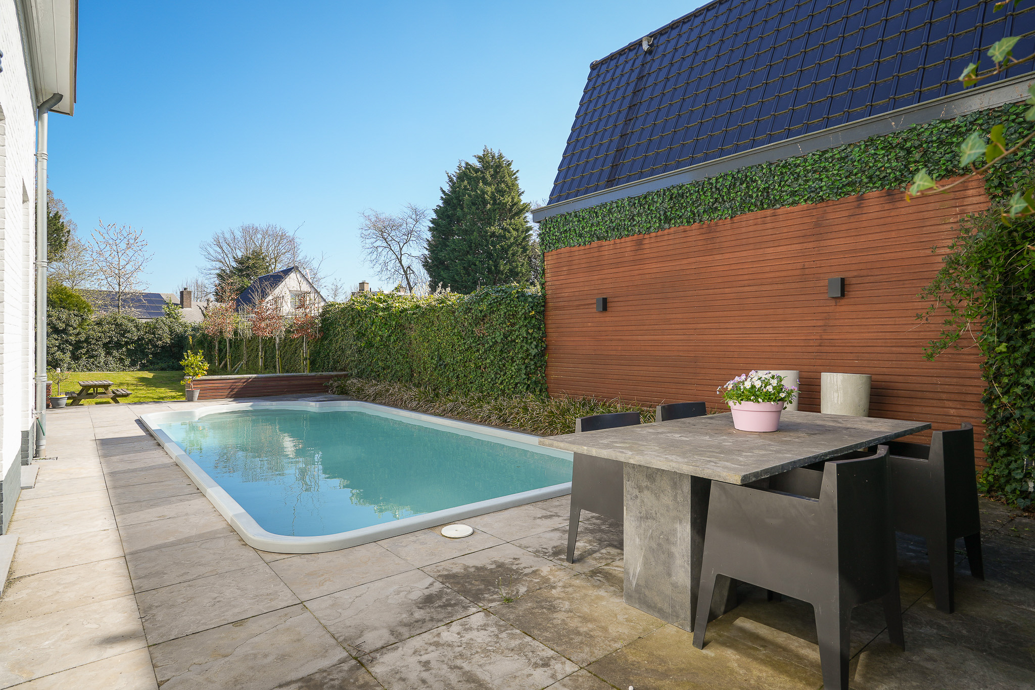 Adjacent to the terrace is the swimming pool, a beautifully constructed composite pool heated via a heat pump system located in the outbuilding. The garden adjoining the terrace is laid out as a lawn.