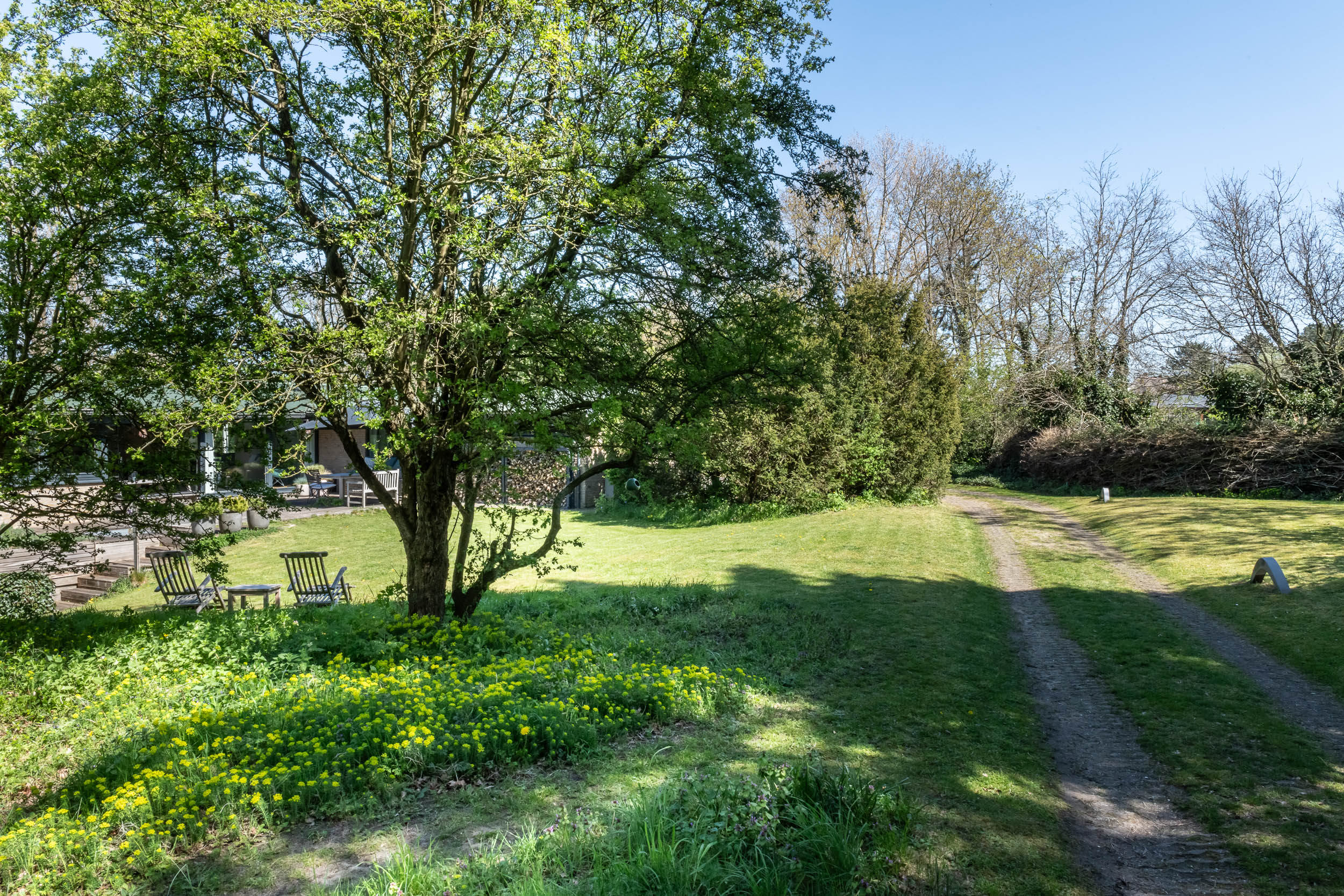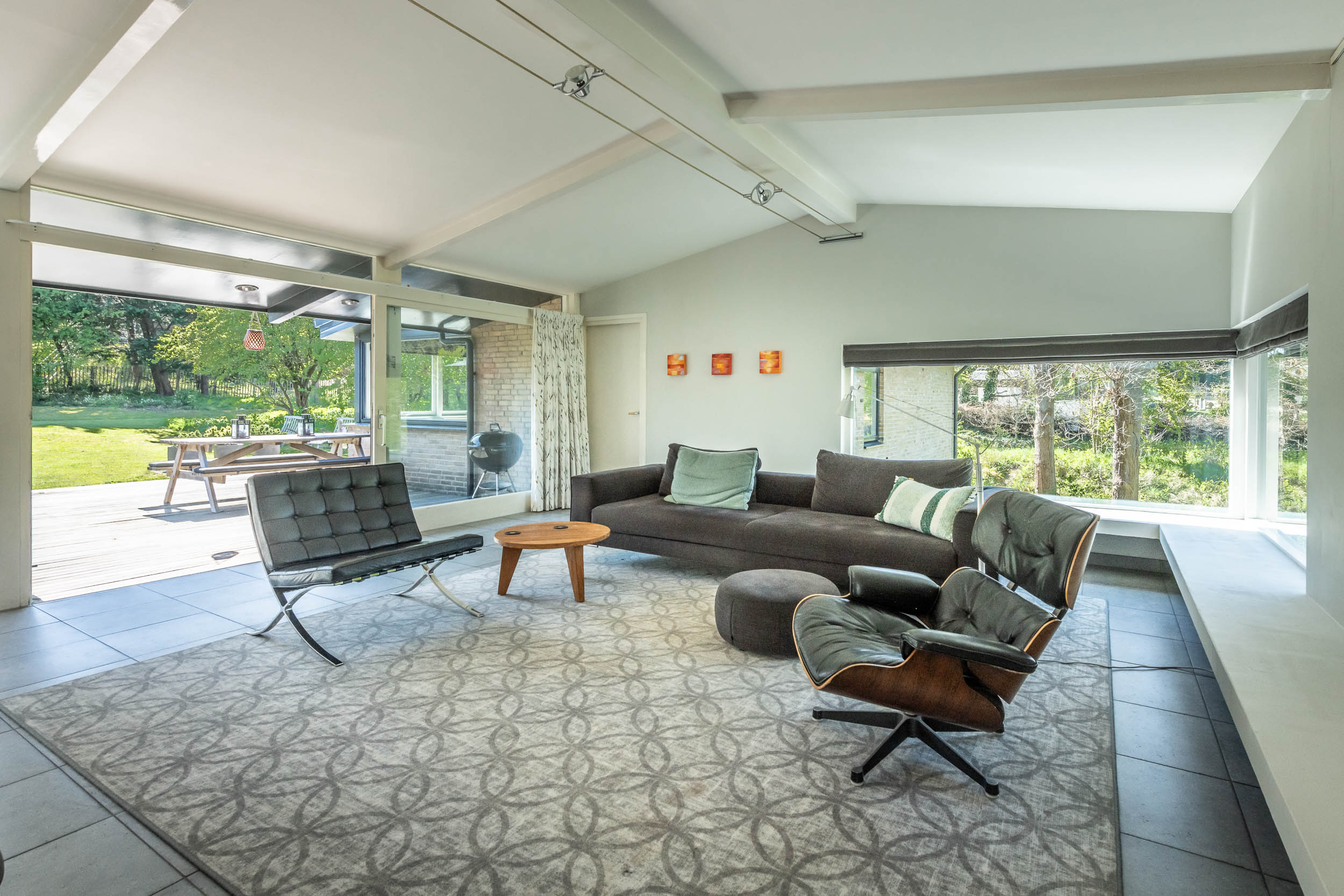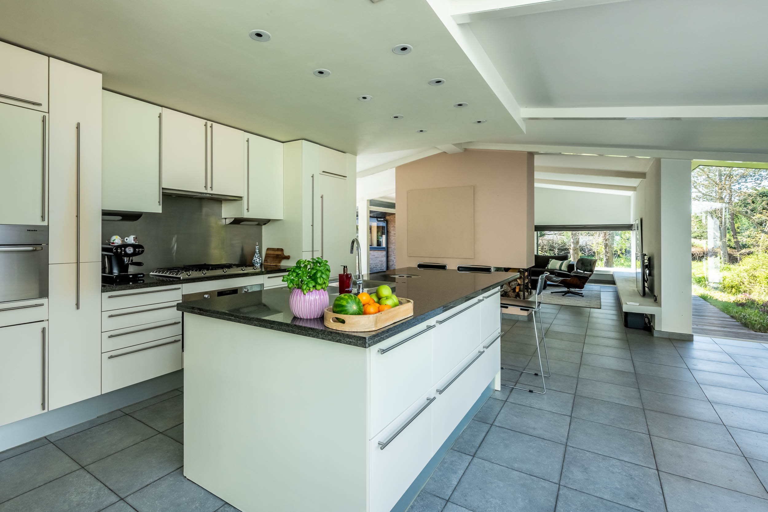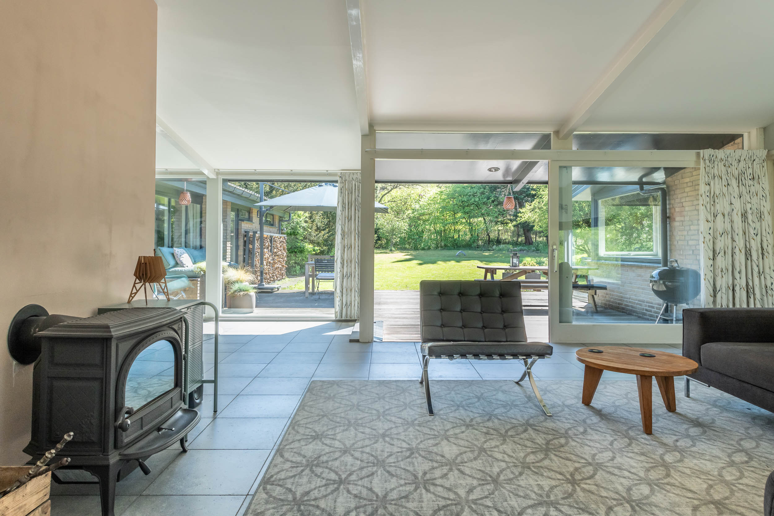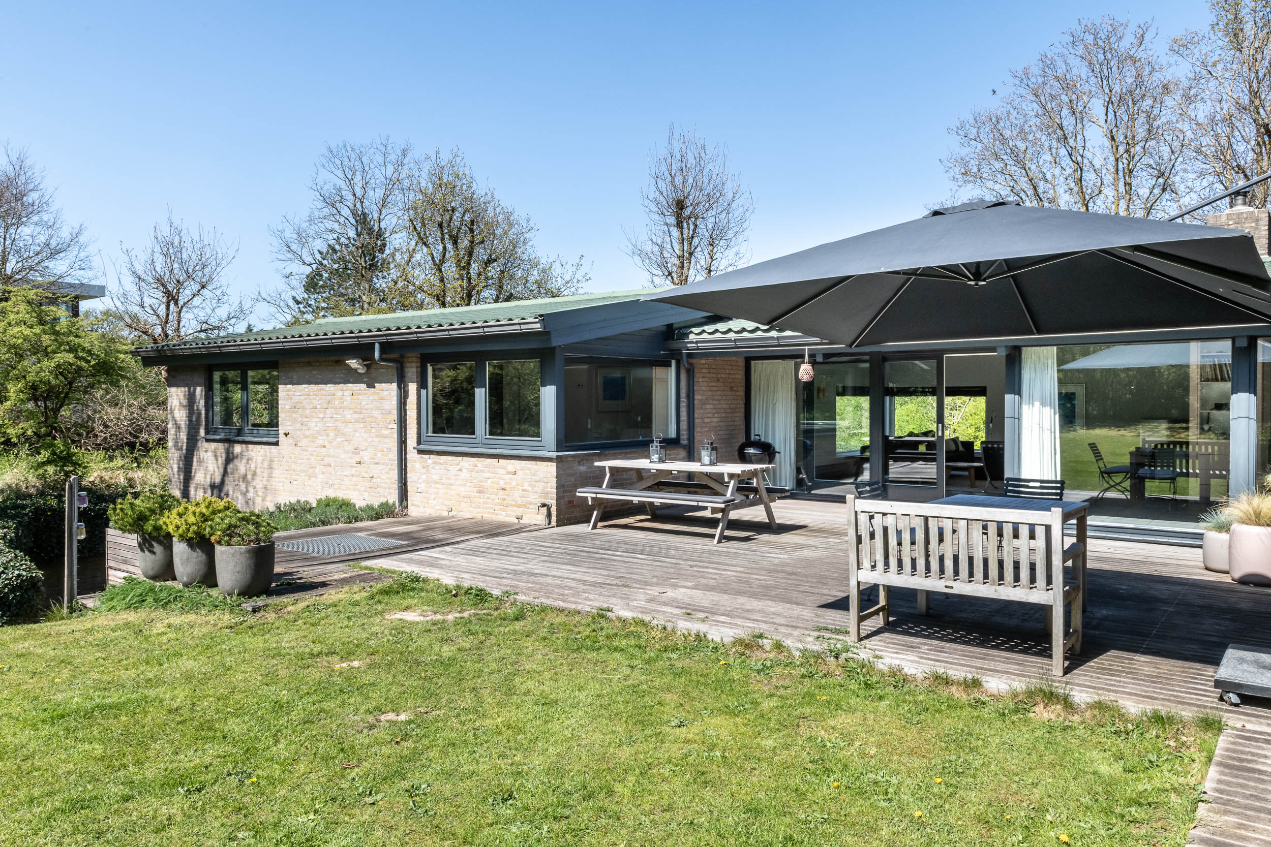 The home is approached by a long driveway with plentiful parking and features an airy living room, illuminated by large windows and two sliding doors, opening onto a sunny terrace with sweeping views of the surrounding dune garden. The wood burning stove, underfloor heating, and careful insulation including double glazing and facade insulation contribute to year round comfort, reflected in its energy class C status.
