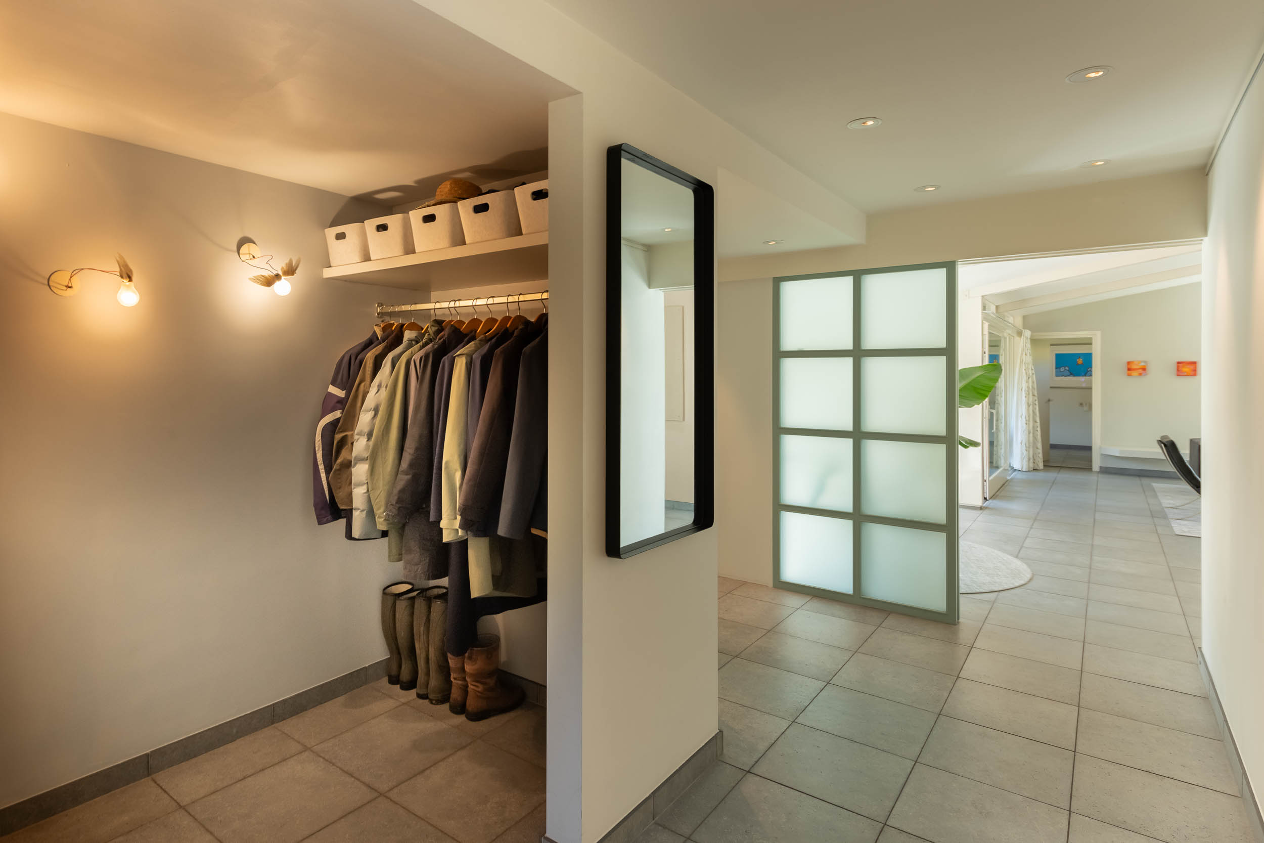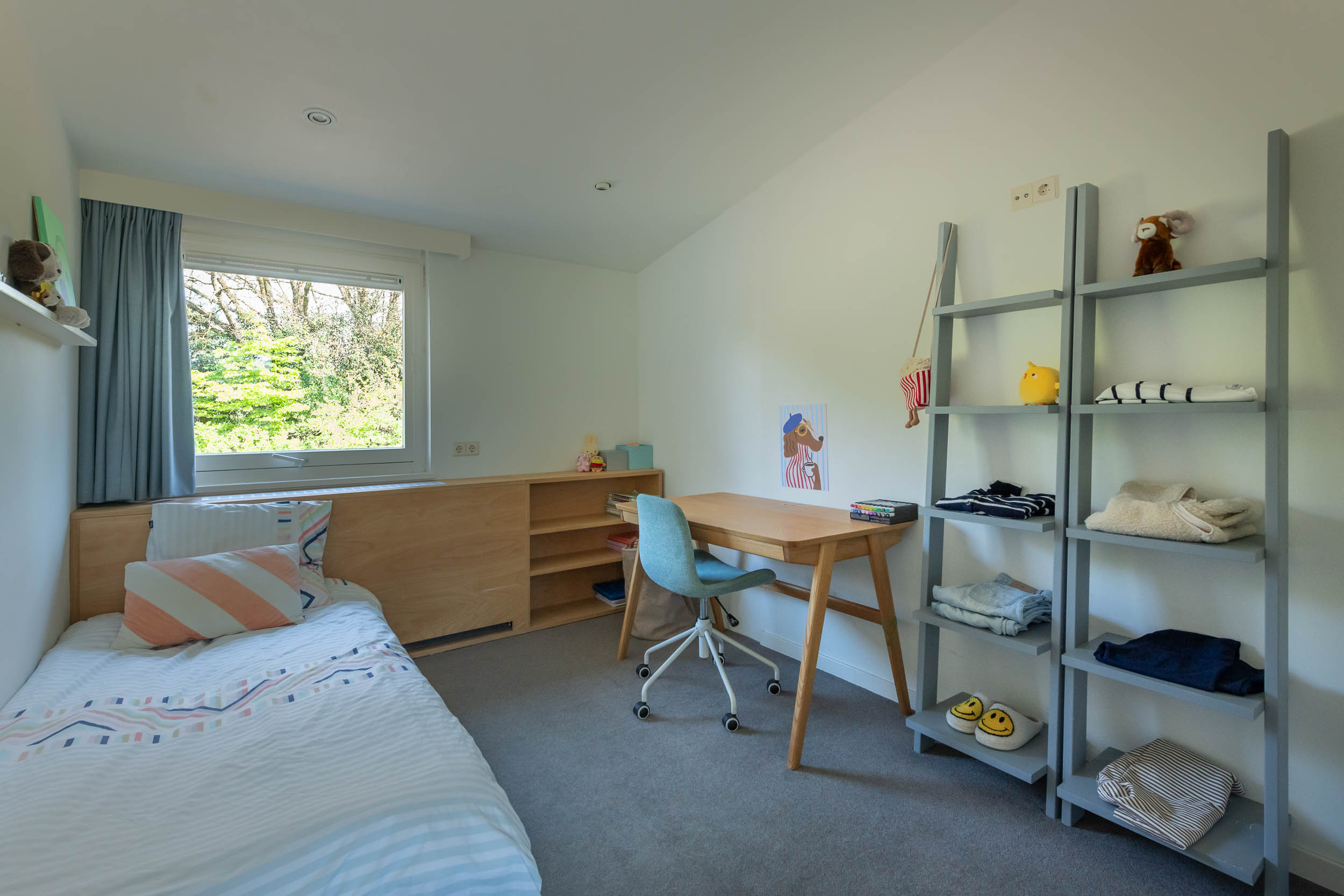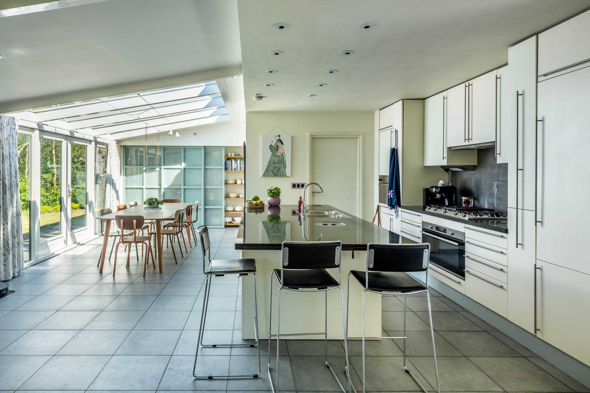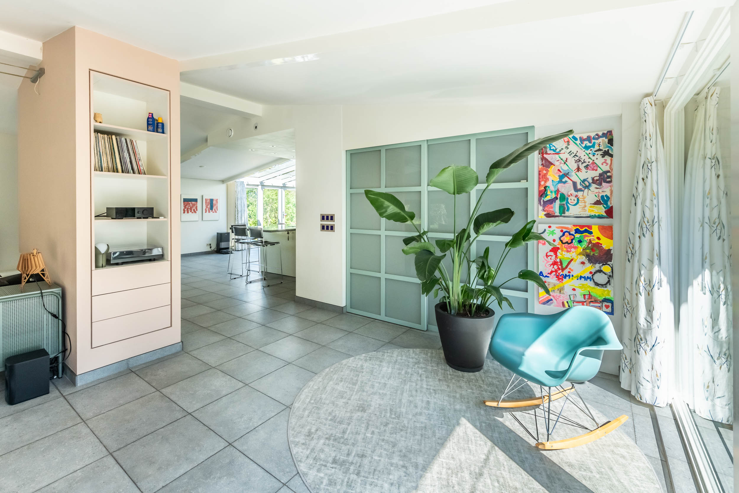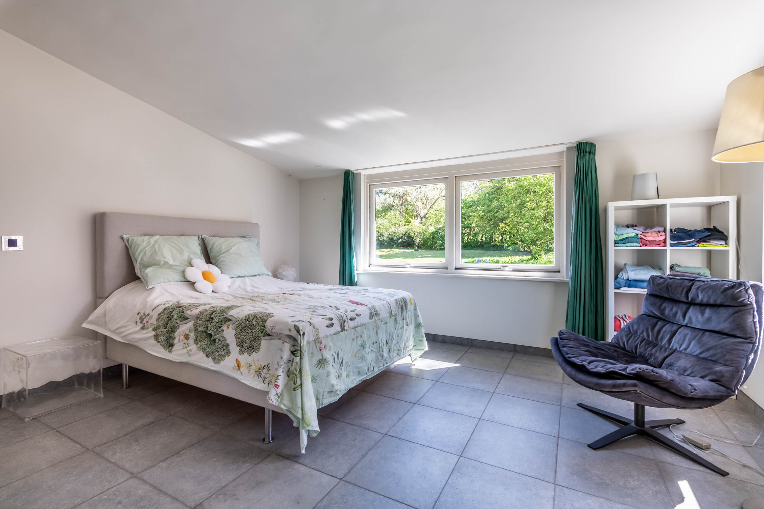 The home is approached by a long driveway with plentiful parking and features an airy living room, illuminated by large windows and two sliding doors, opening onto a sunny terrace with sweeping views of the surrounding dune garden. The wood burning stove, underfloor heating, and careful insulation including double glazing and facade insulation contribute to year round comfort, reflected in its energy class C status.