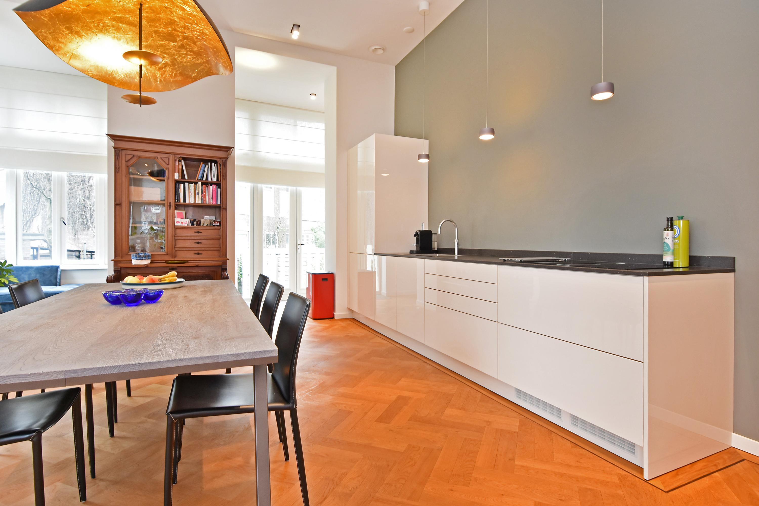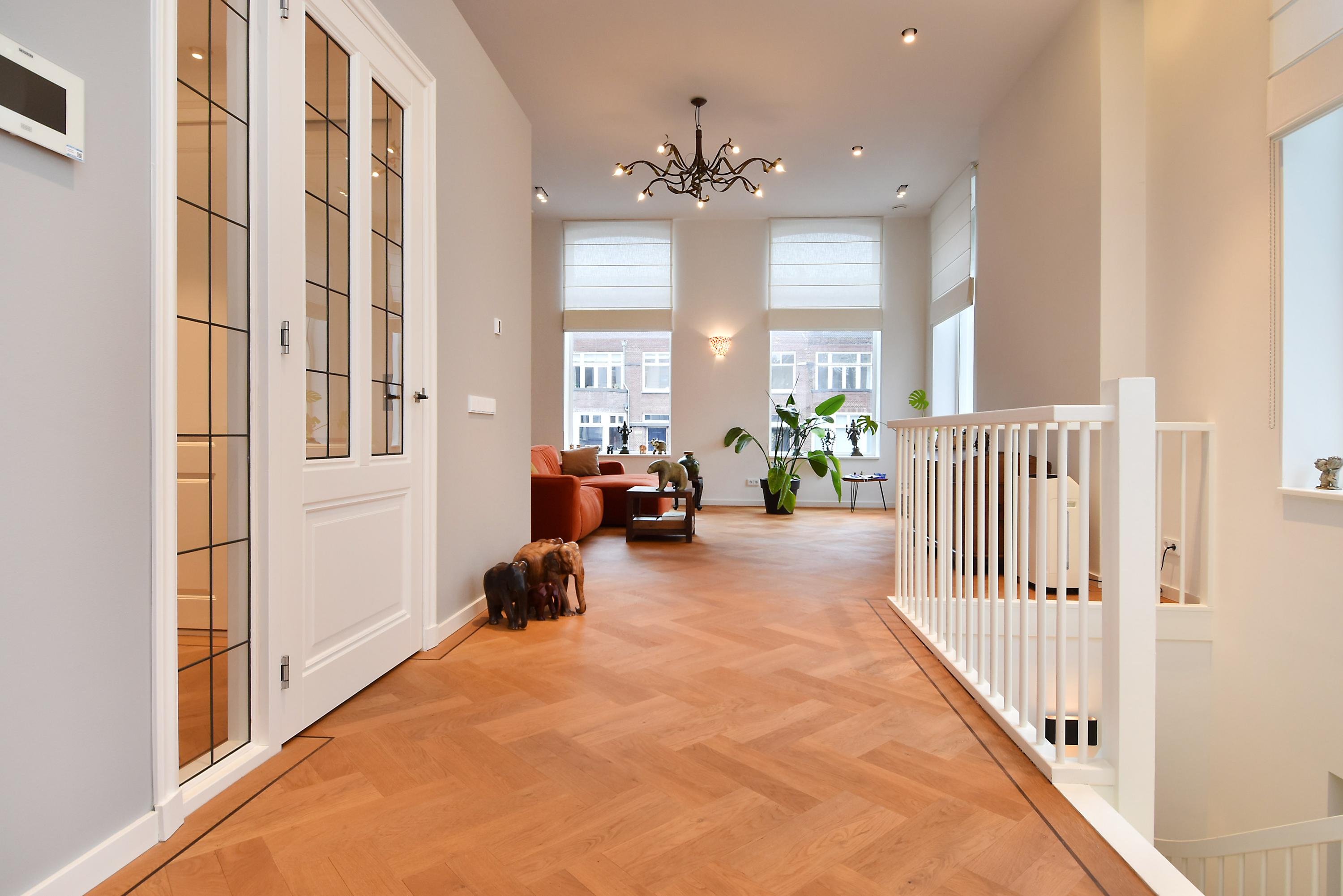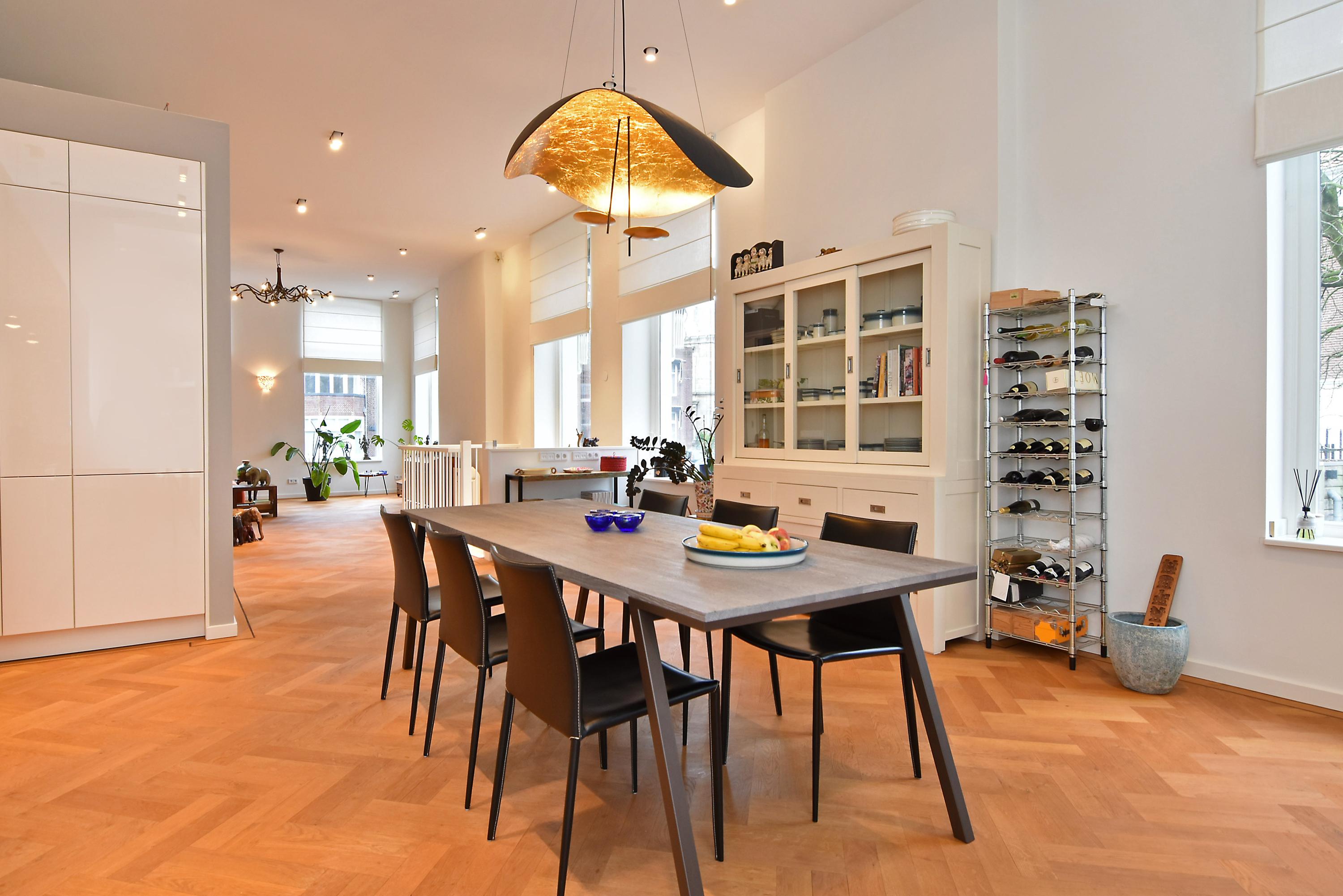 Bij binnenkomst in het appartement komt u in een hal met modern toilet en fonteintje, garderobe- en meterkast. Vanuit deze hal betreedt u de fraaie en ruim opgezette woon-/eetkamer met open woonkeuken. Wat direct opvalt zijn de vele hoge ramen en daardoor de lichtinval. Doordat de woonkamer hoger ligt dan straatniveau overziet u de straat. De woonverdieping is geheel voorzien van een fraaie eiken visgraat parketvloer met bies en vloerverwarming. De keuken is voorzien van diverse inbouwapparatuur: een koel-/vriescombinatie, een vaatwasser, een Quooker met close-in boiler, een inductie kookplaat met kookveldafzuiging en oven. Door de hoge plafonds van bijna 4 meter met inbouwspots voelt het appartement nog ruimer aan.