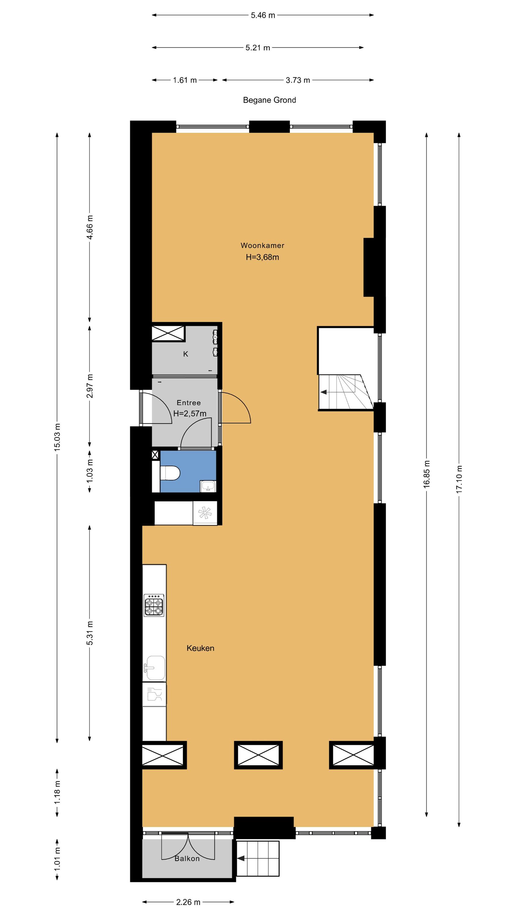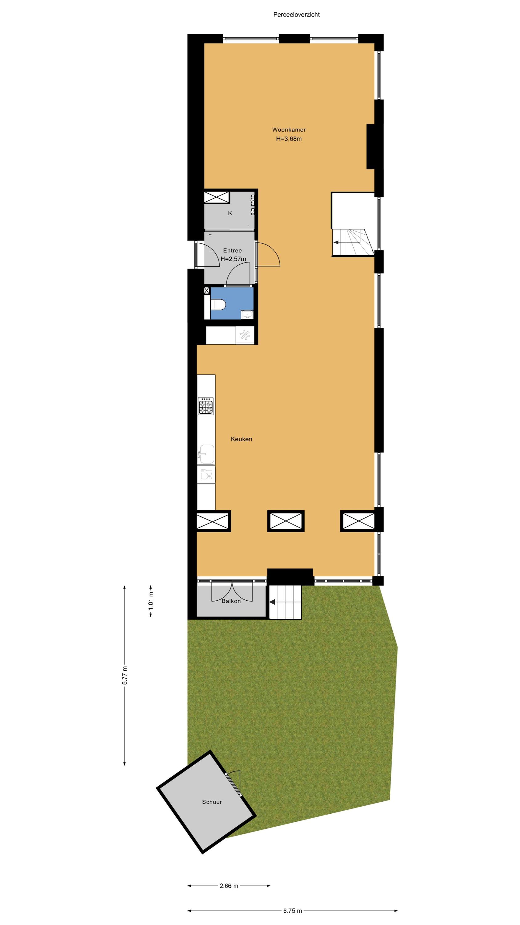 Aan de achterzijde van de woon-/eetkamer is de toegang tot het balkon en met een trap komt u in de stadstuin met berging en achteringang. De tuin is gelegen op het zuiden.