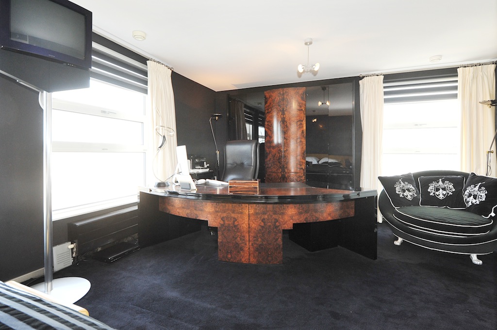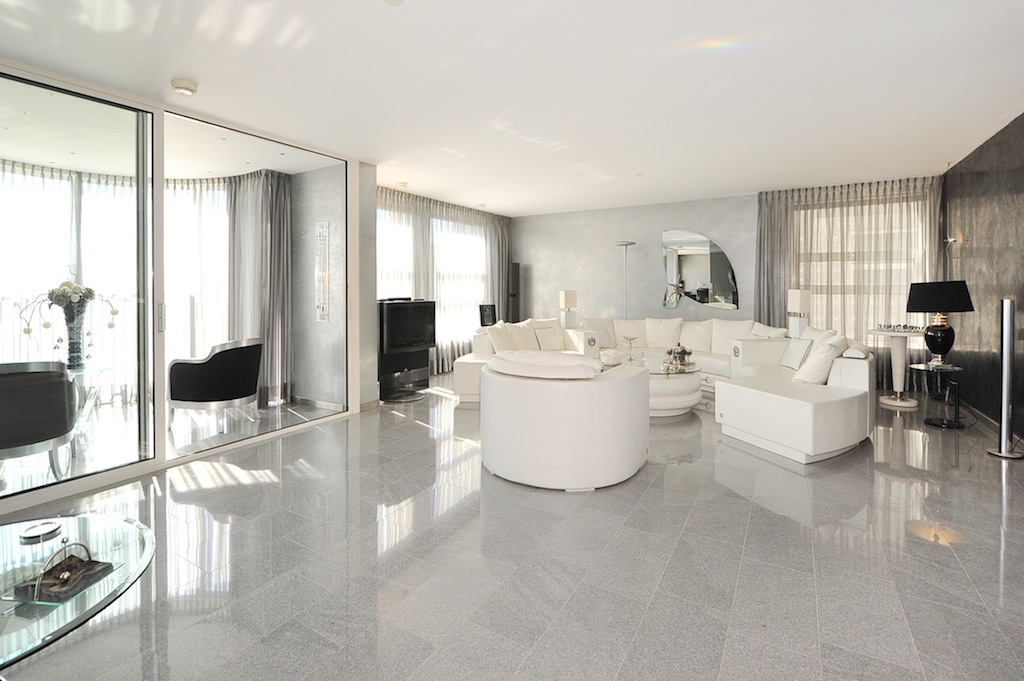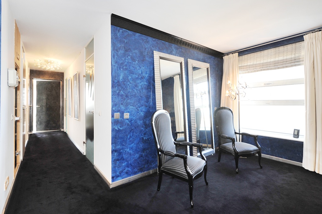 10e verdieping: eigen entree, ruime hal met garderobe, twee separate toiletten, royale slaapkamer (voormalig twee slaapkamers) met toegang naar eigen badkamer voorzien van ligbad, douche en toilet, dichte keuken met hoek opgestelde keukeninrichting en diverse inbouwapparatuur, zeer ruime living met grote raampartijen en twee aangrenzende en halfronde serres, de living is voorzien van een fraaie Chinees travertinvloer, middels een aangrenzende gang heeft u toegang naar een aparte kleedruimte, een tweede badkamer met ligbad, aparte douche en wastafel, een bergruimte met opstelplaats c.v.-combiketel en aansluiting wasmachine en droger, een aparte sauna en een tweede ruime slaapkamer.