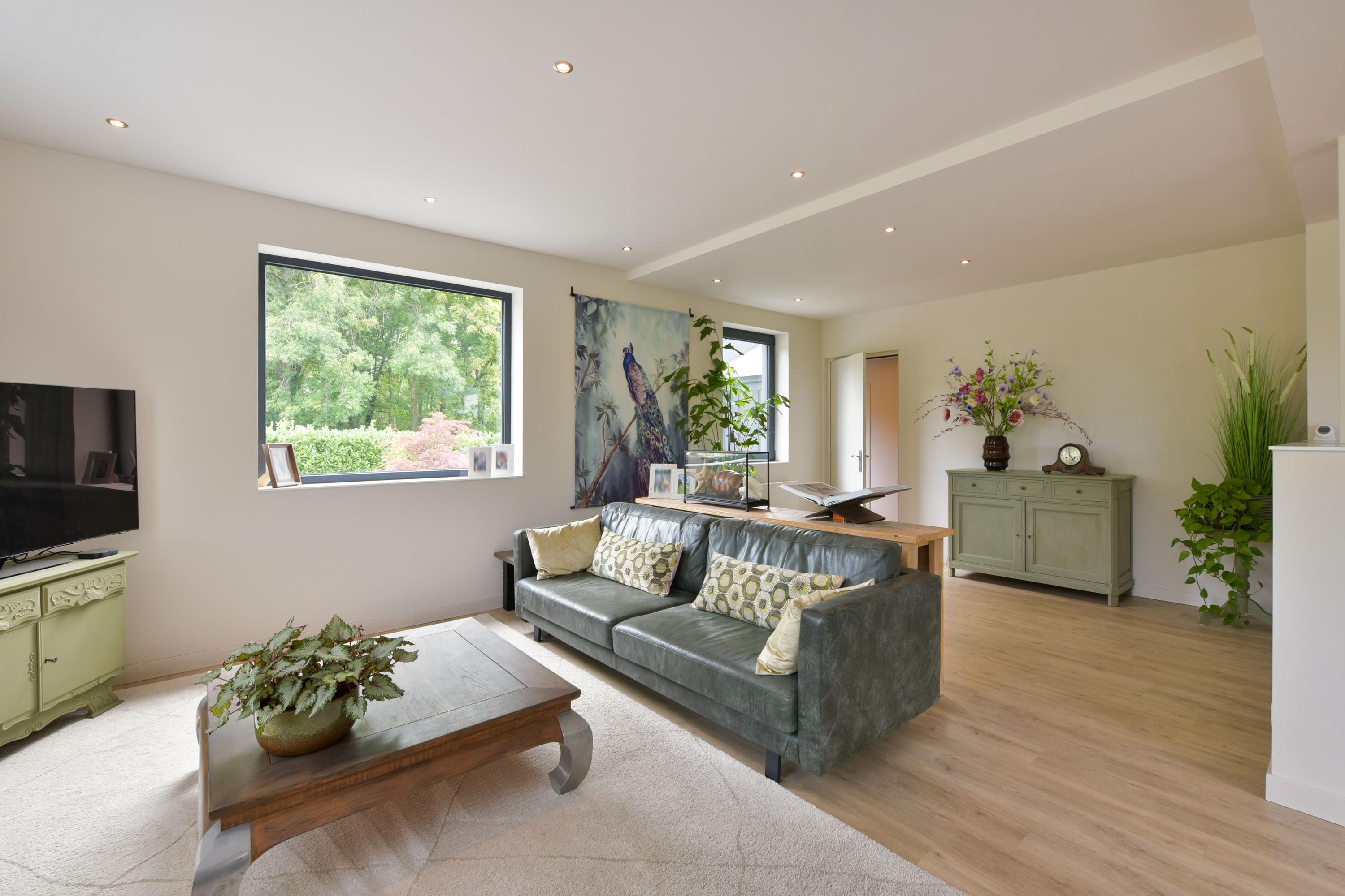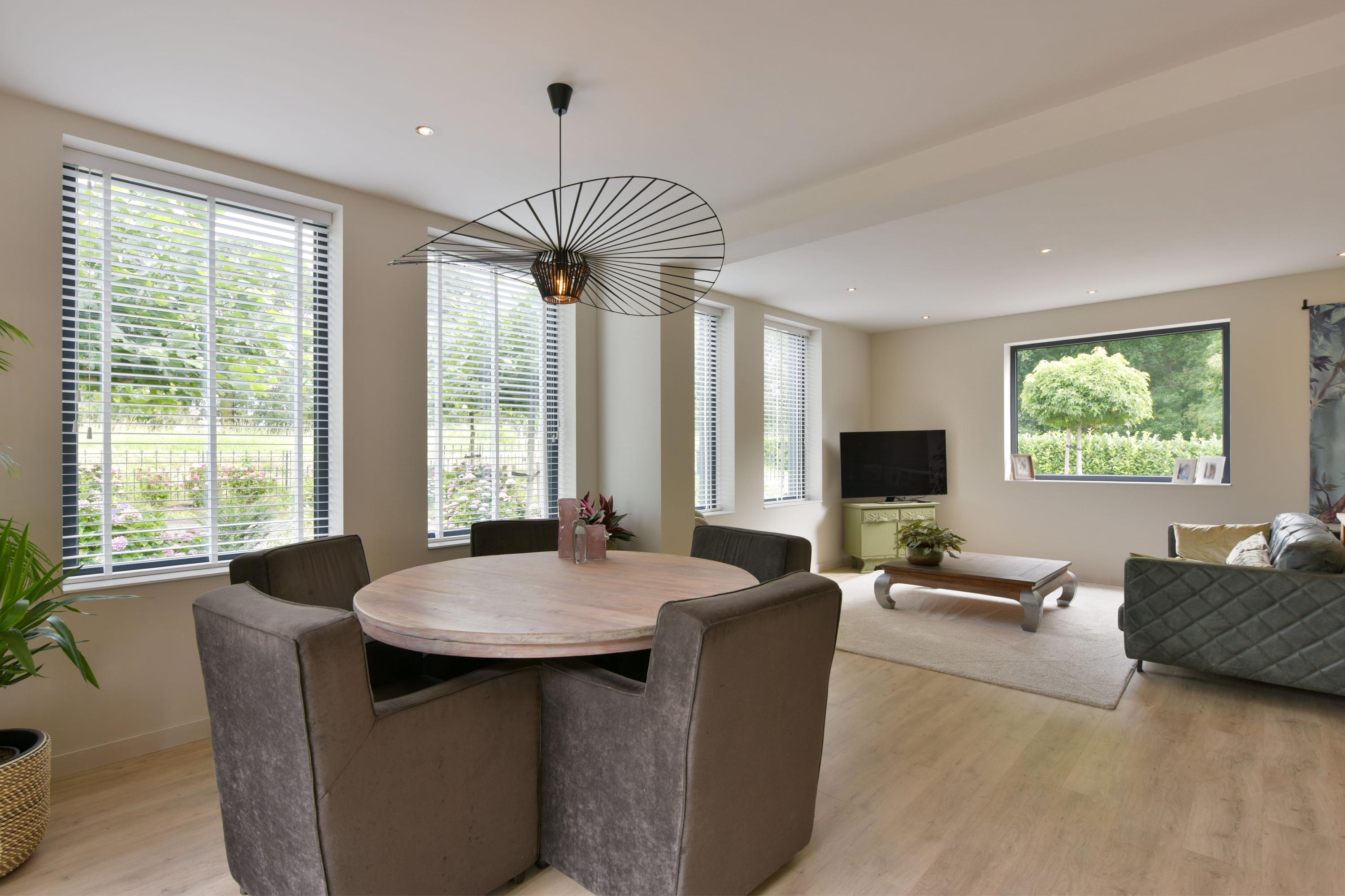 De woonkamer is een oase van licht en ruimte, dankzij de grote raampartijen rondom. Elke hoek van de kamer staat in verbinding met het buitenleven. Via dubbele openslaande deuren loop je zó de tuin in — perfect op zomerse dagen of voor een frisse start in de ochtend. De ruimte voelt open en tegelijk warm aan, een ideale plek om te ontspannen of gasten te ontvangen.