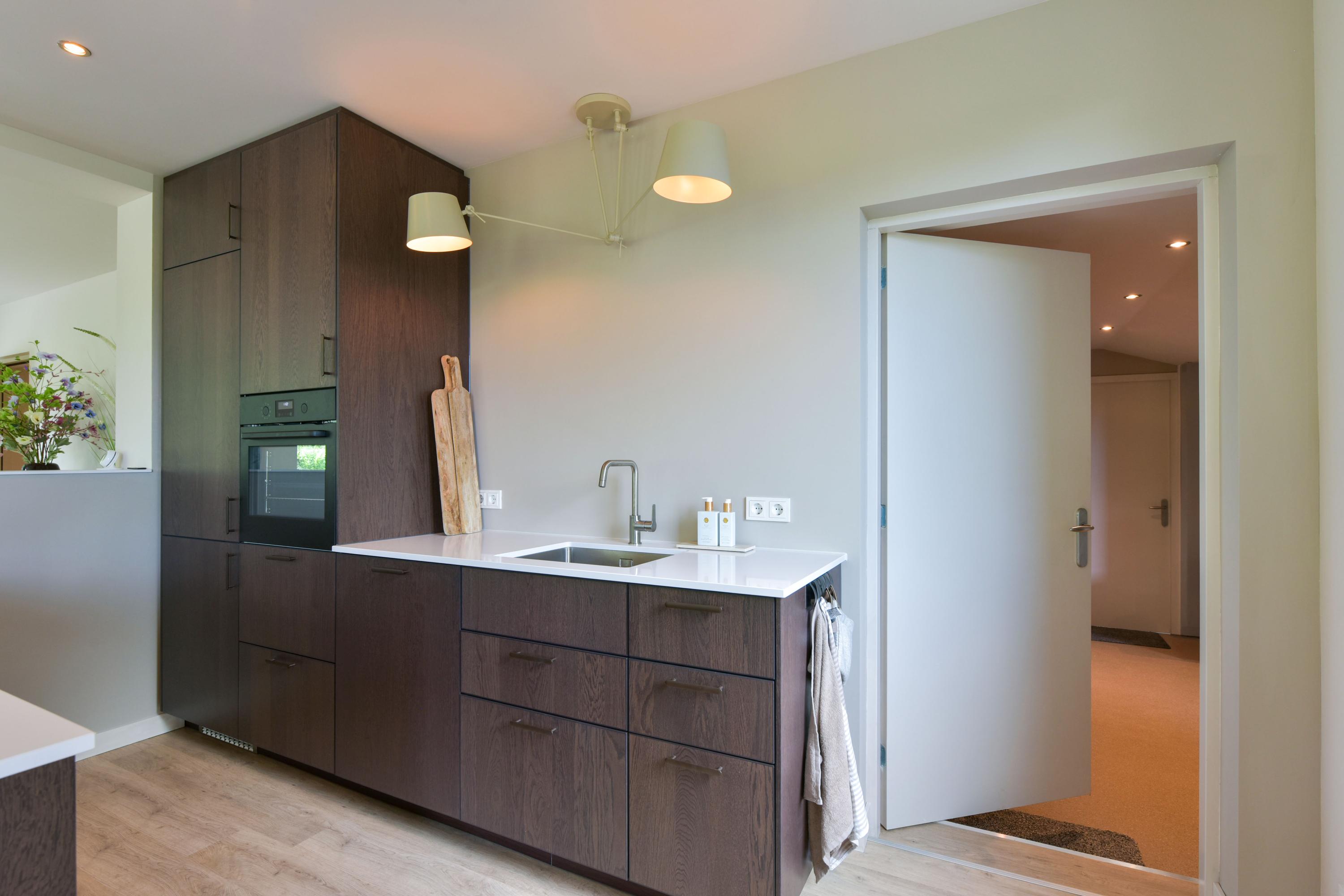 Aansluitend aan de woonkamer vind je de splinternieuwe open keuken (geplaatst in 2025), uitgevoerd in een stijlvol en tijdloos design. Aan de ene kant een hoge kastenwand met een royale koelkast, moderne oven en veel bergruimte voor al je keukenspullen. Het werkblad met geïntegreerde spoelbak is ruim opgezet, met diepe lades eronder voor optimaal gebruiksgemak. Aan de andere zijde vind je het kookeiland — het hart van de keuken. Dit eiland is voorzien van een inductiekookplaat met een strak geïntegreerde afzuiging. Rondom vind je extra kastruimte én een comfortabele barzone waar je met barkrukken gezellig kunt zitten, ontbijten of borrelen terwijl er gekookt wordt.