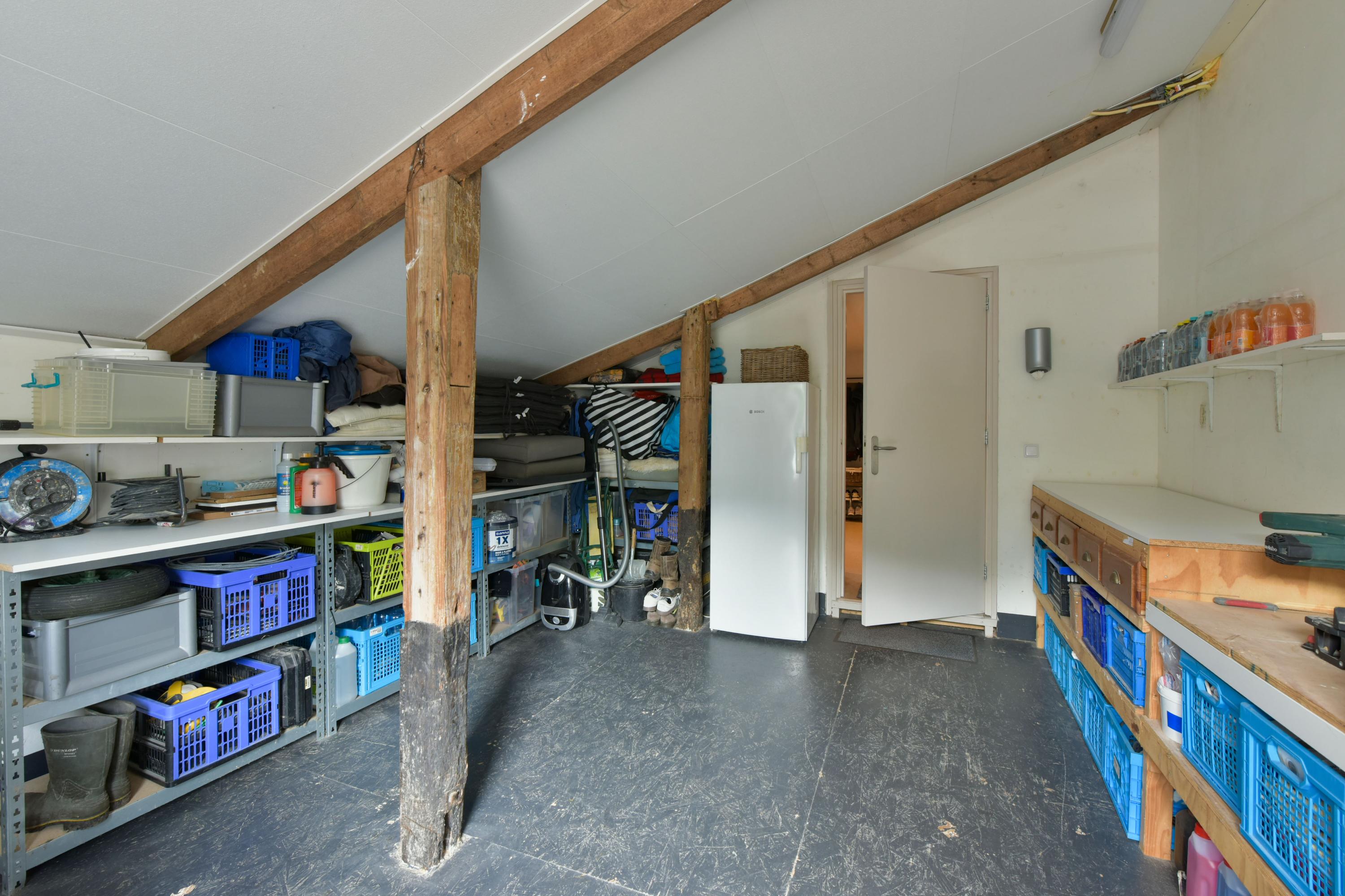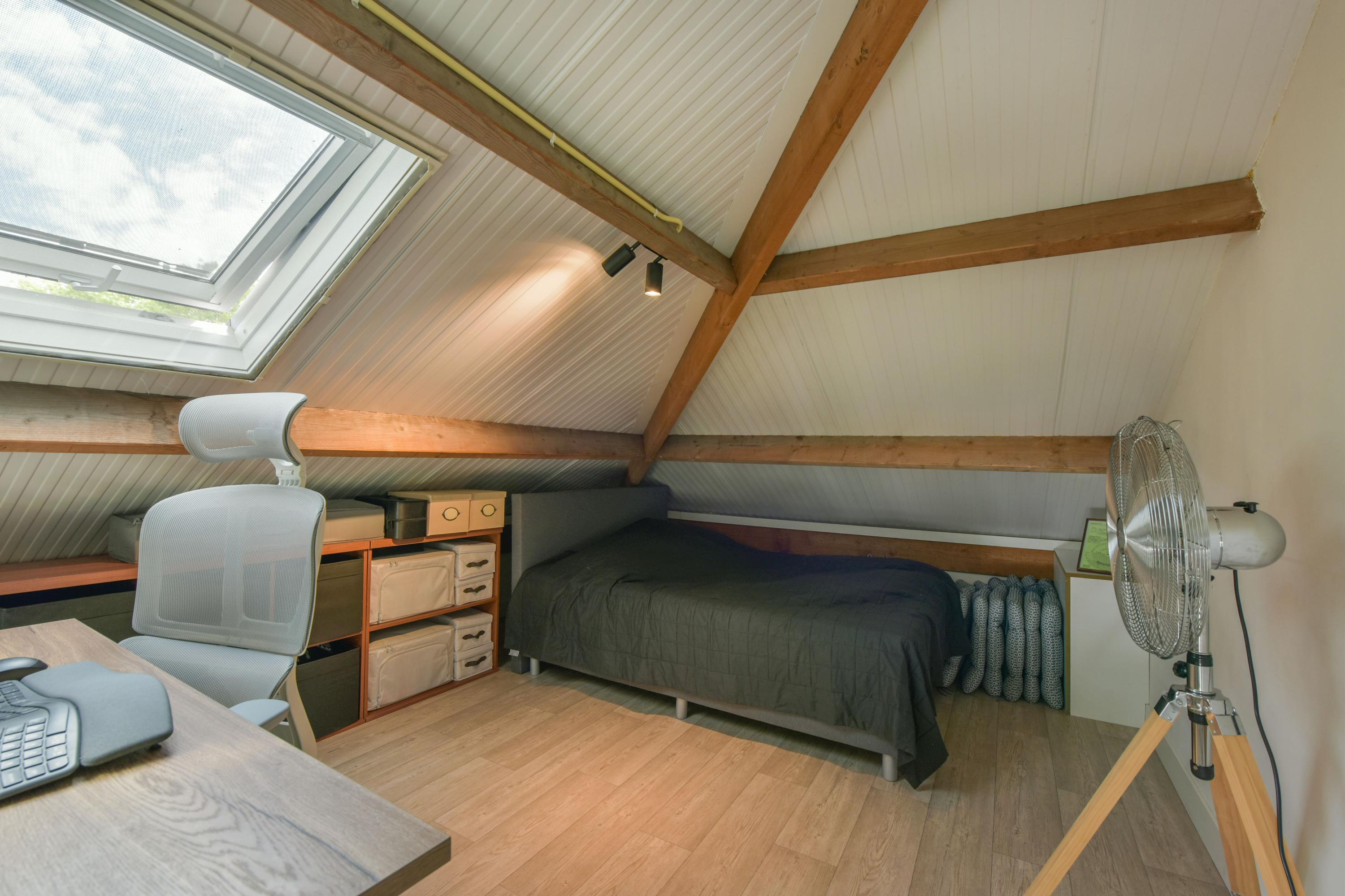 Wil je hier een volwaardige badkamer realiseren? Dat kan! De aansluitingen zijn eenvoudig te realiseren en de ruimte leent zich uitstekend voor het creëren van een luxe tweede badkamer met bijvoorbeeld een ligbad, inloopdouche en dubbel wastafelmeubel. De bestaande indeling vormt een mooie basis, maar kan ook volledig naar eigen smaak worden aangepast. De afwerking van de verdieping wacht nog op jouw persoonlijke stempel: kies jouw eigen vloer, wandafwerking, kleurstellingen en verlichting — en maak van deze woonlaag een volwaardig verlengstuk van de comfortabele woning op de begane grond. En dat is nog niet alles: via een vlizotrap is er vanaf de overloop ook toegang tot een ruime bergzolder. Deze zolder strekt zich uit over een groot deel van de woning en biedt volop plek voor seizoensspullen, koffers, kerstdecoratie of andere zaken die je graag netjes en uit het zicht opbergt.