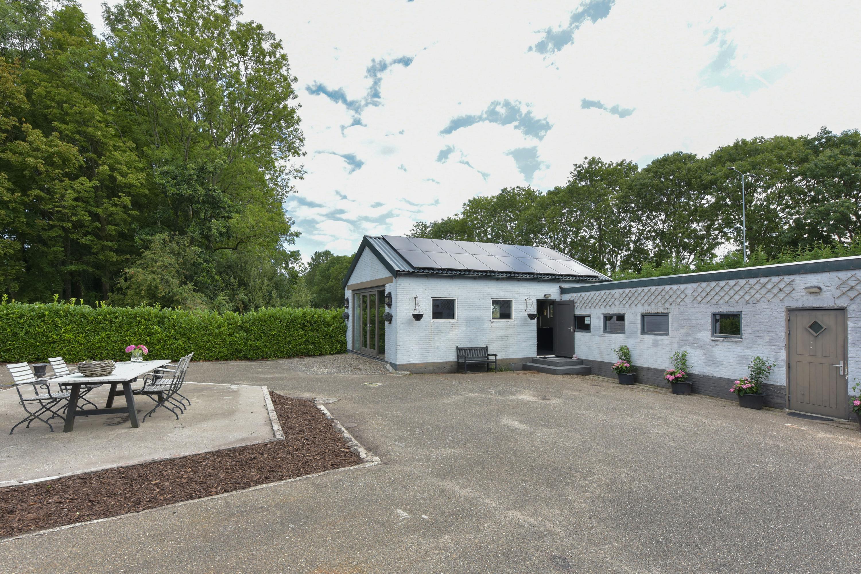 Het geheel wordt ontsloten via een elektrisch bedienbaar toegangshek, dat langs de woning uitkomt aan de achterzijde van het perceel met parkeergelegenheid voor meerdere auto’s. Ook aan duurzaamheid is gedacht: de woning is uitgerust met 16 zonnepanelen, wat bijdraagt aan lagere energielasten en toekomstbestendig wonen.