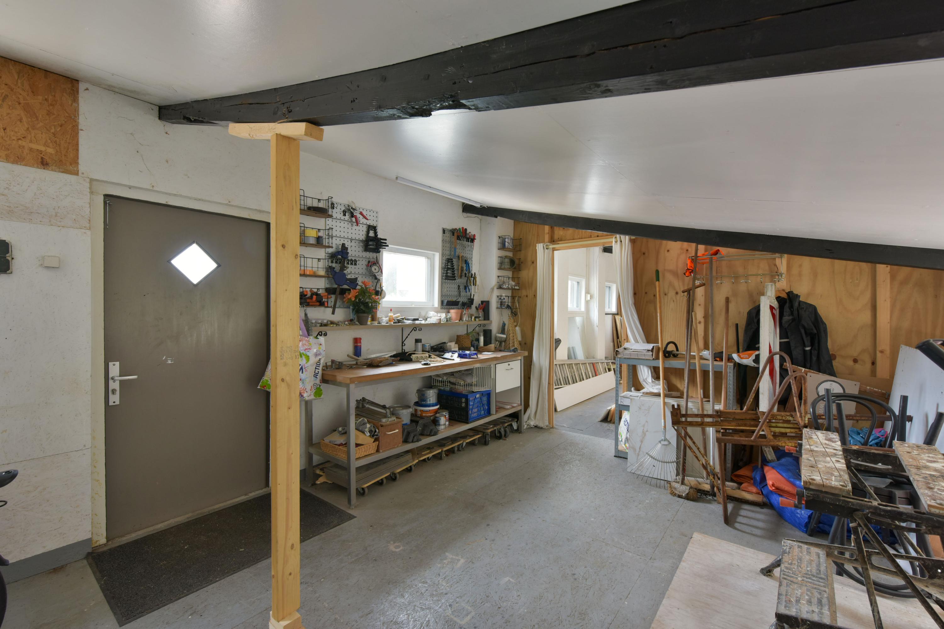 Via een doorgang in het atelier is er een directe verbinding naar de oudere voormalige veestal, welke in gebruik is als werkplaats. De combinatie van het atelier en de werkplaats maakt dit gebouw bijzonder geschikt voor creatieven, makers of ondernemers die wonen en werken willen combineren op één locatie. Maar ook het ombouwen tot extra woonunit t.b.v. bed & breakfast of ruimte voor de au pair behoort tot de mogelijkheid.
