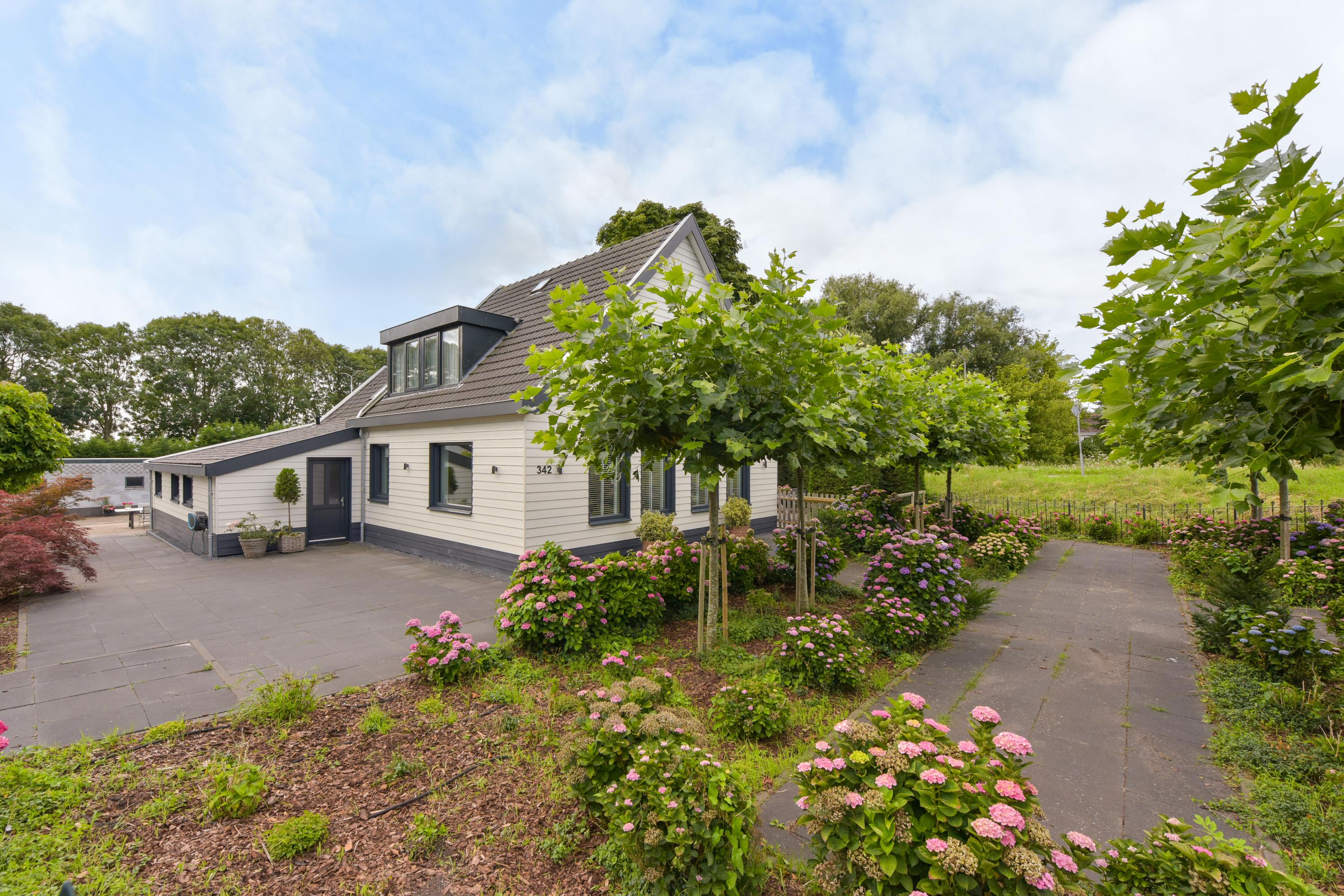 Via het elektrisch toegangshek betreed je dit heerlijke perceel. Een oprit leidt je langs de woning richting de achterzijde, waar volop parkeergelegenheid is — ideaal voor meerdere auto’s. Hier begint het buitenleven al: rust, ruimte en groen om je heen.