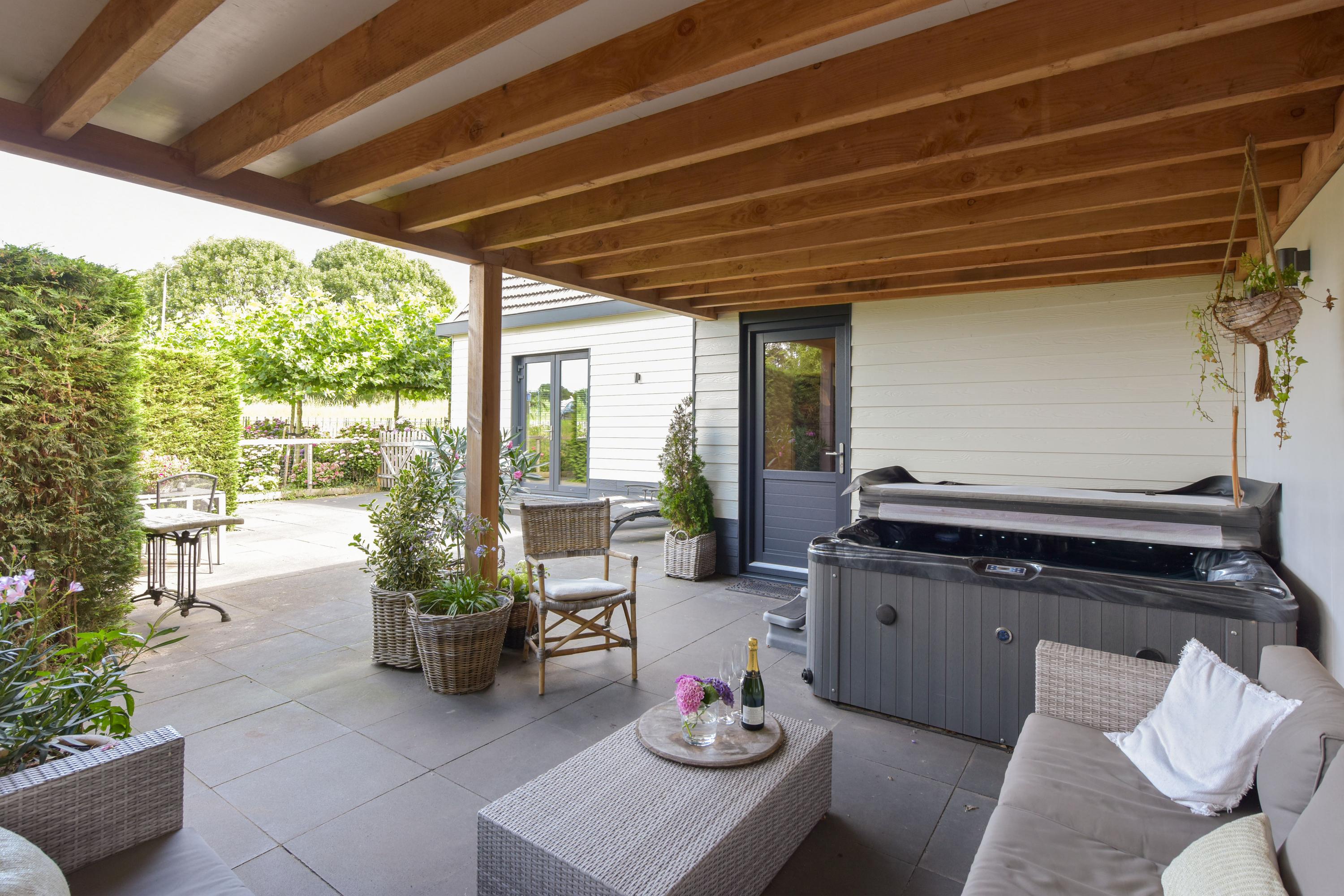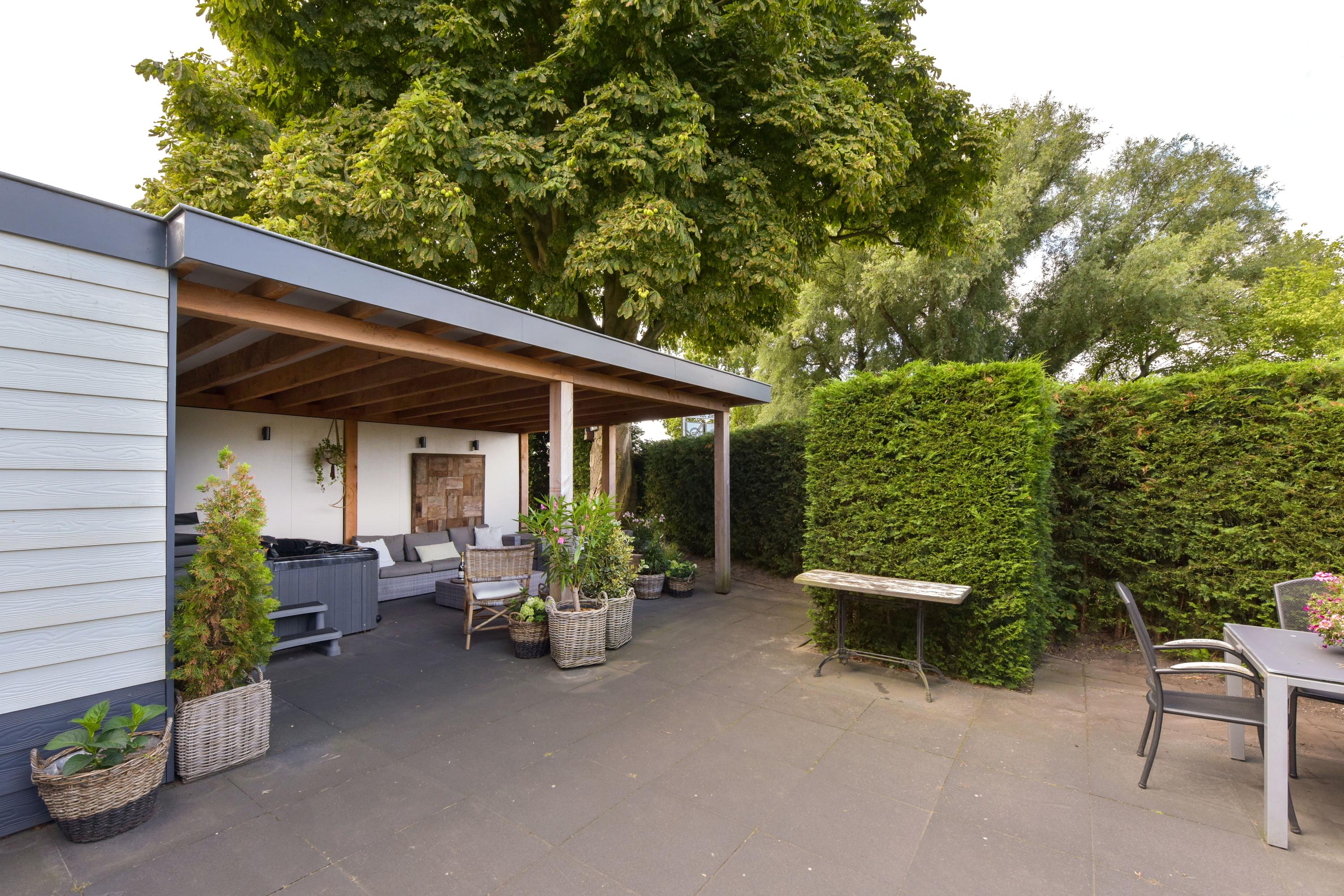 De woonkamer van de woning grenst aan een royaal terras. Dit gedeelte is volledig betegeld en biedt volop ruimte voor een grote eettafel, een loungeset of meerdere zitjes. Dankzij de ligging en de open ruimte geniet je hier van zon én privacy — perfect voor lange zomeravonden of een rustige ochtend met koffie en uitzicht op het groen. Grenzend aan dit terras bevindt zich een sfeervolle veranda, ingericht als comfortabele loungehoek. Hier is het ook bij minder mooi weer heerlijk toeven: overdekt, beschut en voorzien van elektra en sfeervolle verlichting. Er is bovendien een aparte aansluiting aanwezig voor een jacuzzi, die eventueel ter overname is. Het geheel voelt als een privé spa in je eigen achtertuin — luxe en ontspanning binnen handbereik.