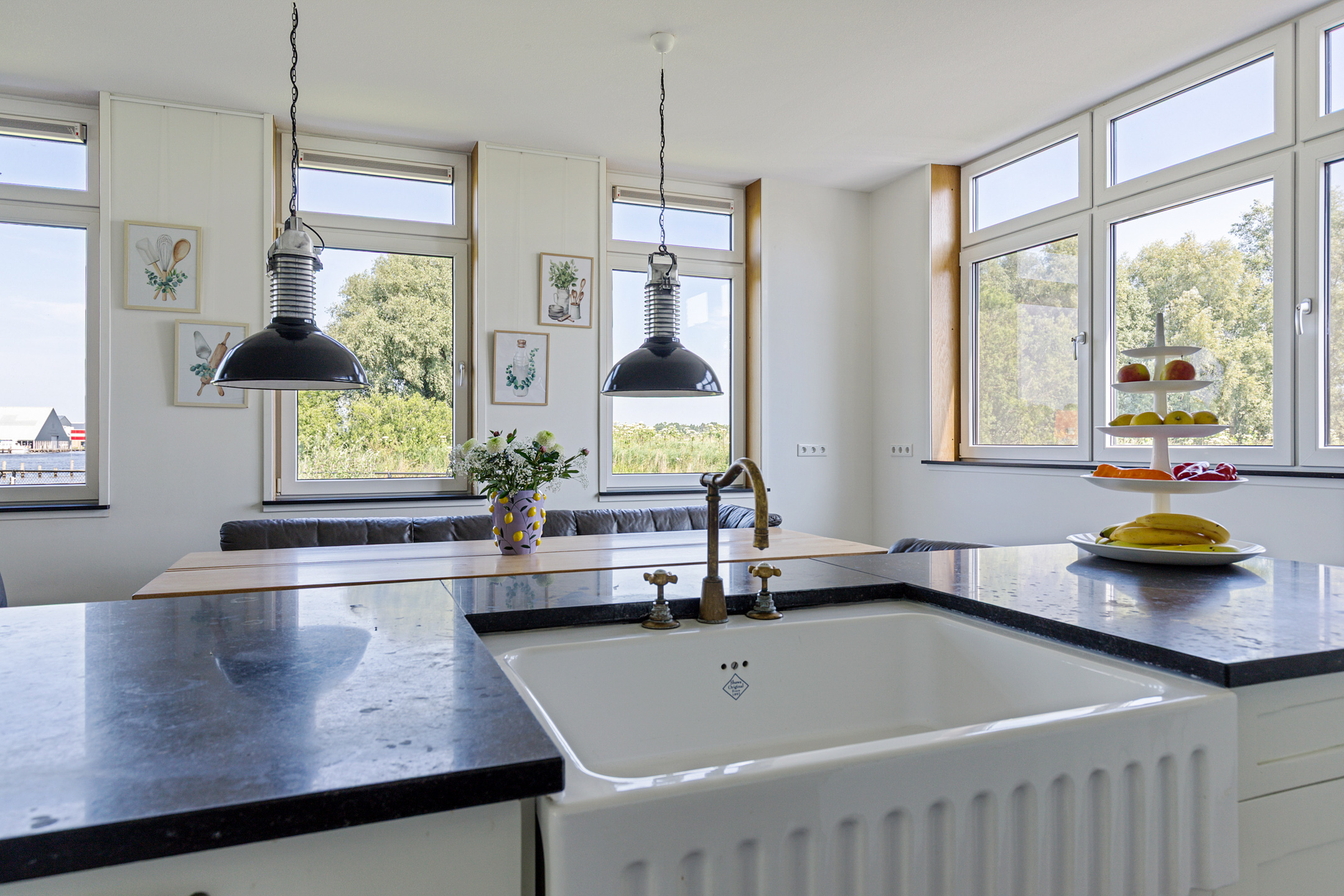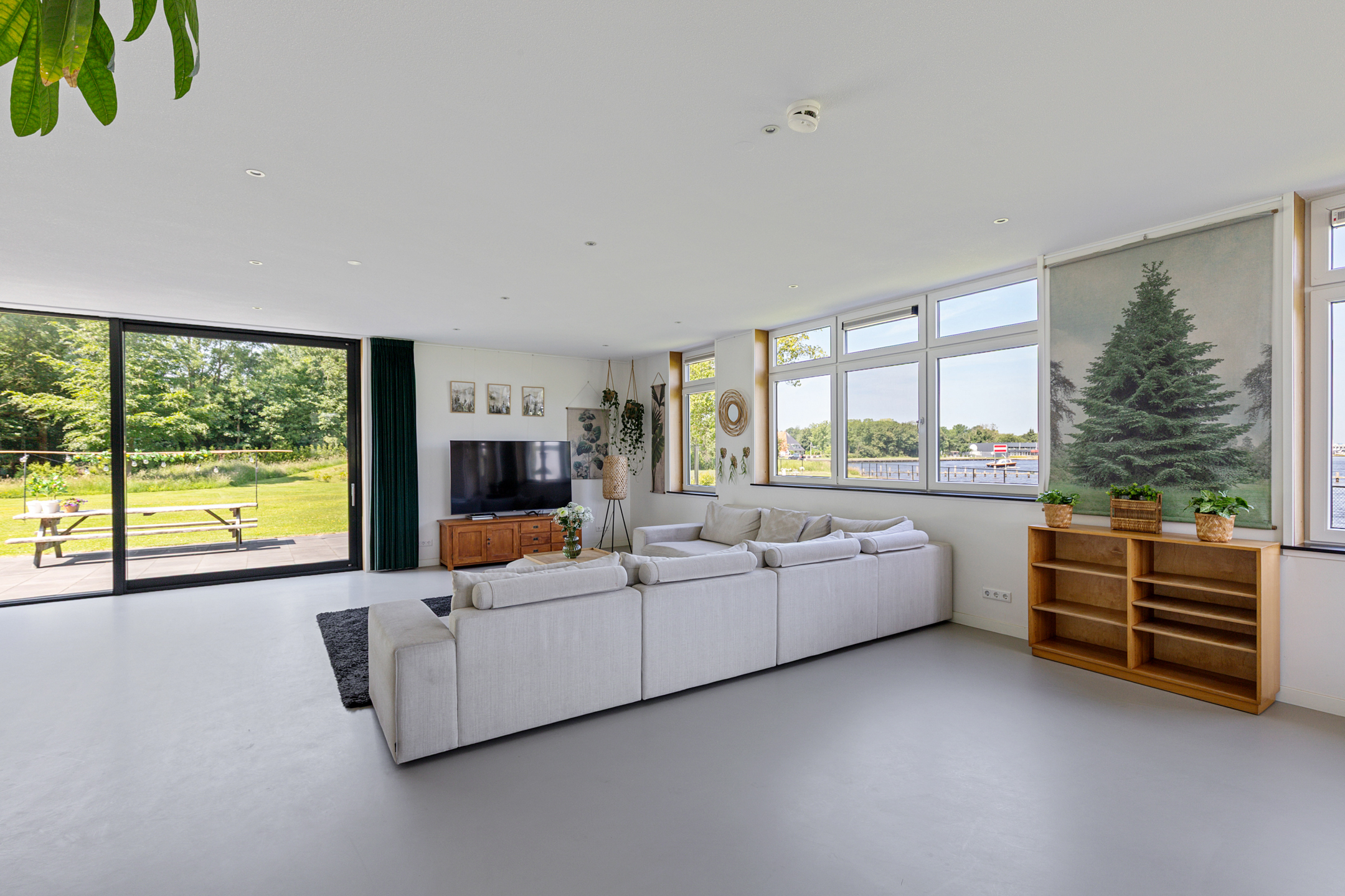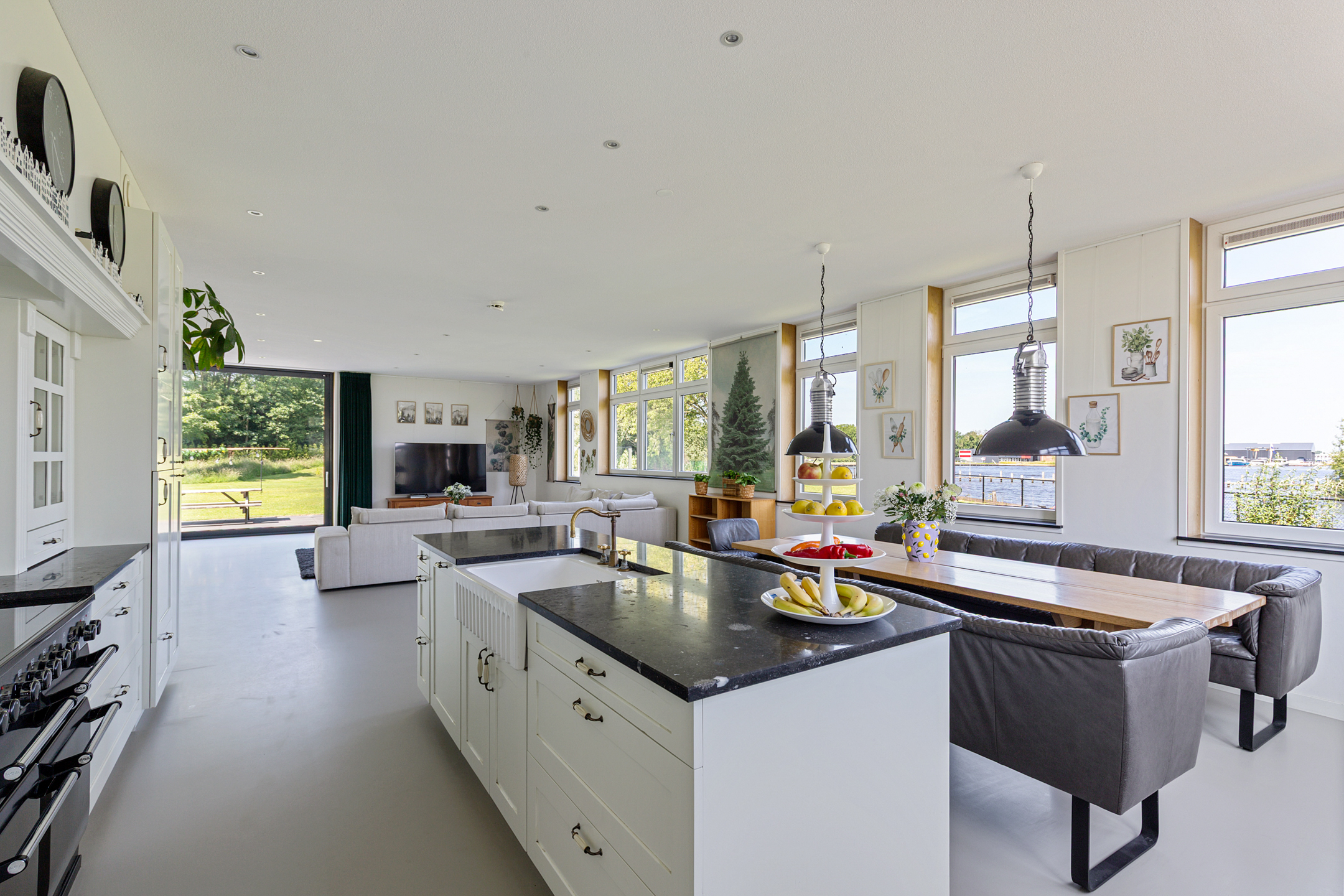 De living is een oase van licht, ruimte en uitzicht. Hoge schuifpuien zorgen voor een naadloze overgang naar terras en tuin, met directe zichtlijnen op het water en de groene omgeving. De open keuken met spoeleiland en veel kastruimte vormt het hart van de woning: hier dineert u met vrienden en familie terwijl u uitkijkt op een wisselend schouwspel van zeilboten en sloepen.