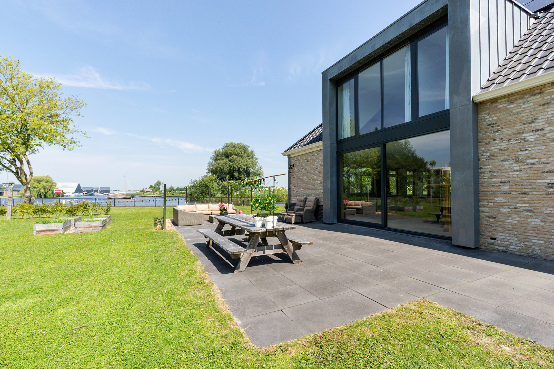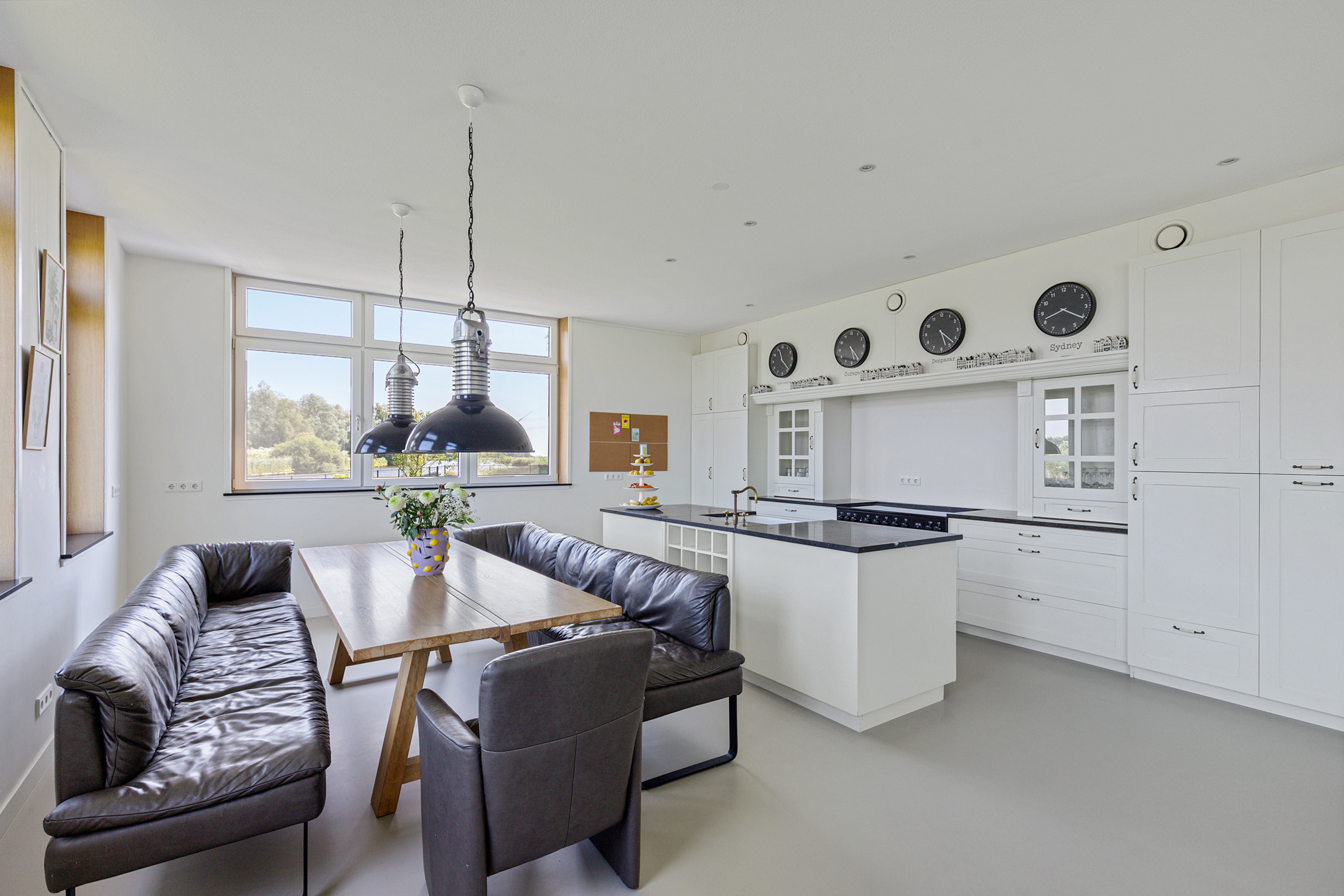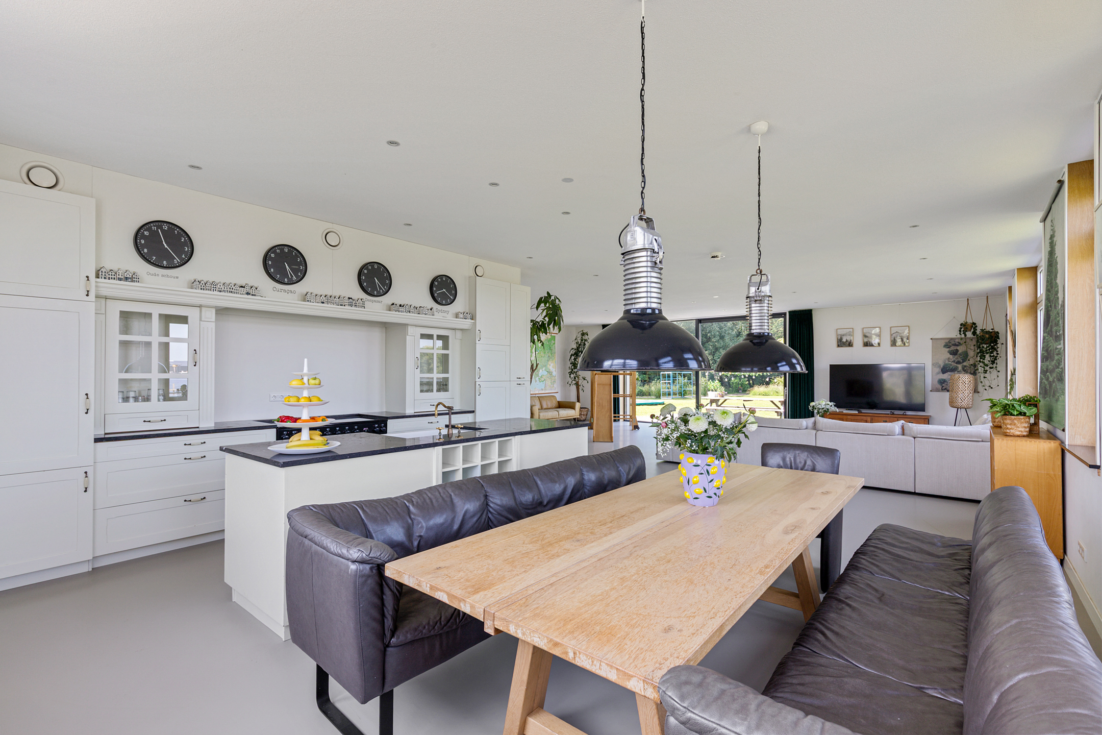 De living is een oase van licht, ruimte en uitzicht. Hoge schuifpuien zorgen voor een naadloze overgang naar terras en tuin, met directe zichtlijnen op het water en de groene omgeving. De open keuken met spoeleiland en veel kastruimte vormt het hart van de woning: hier dineert u met vrienden en familie terwijl u uitkijkt op een wisselend schouwspel van zeilboten en sloepen.