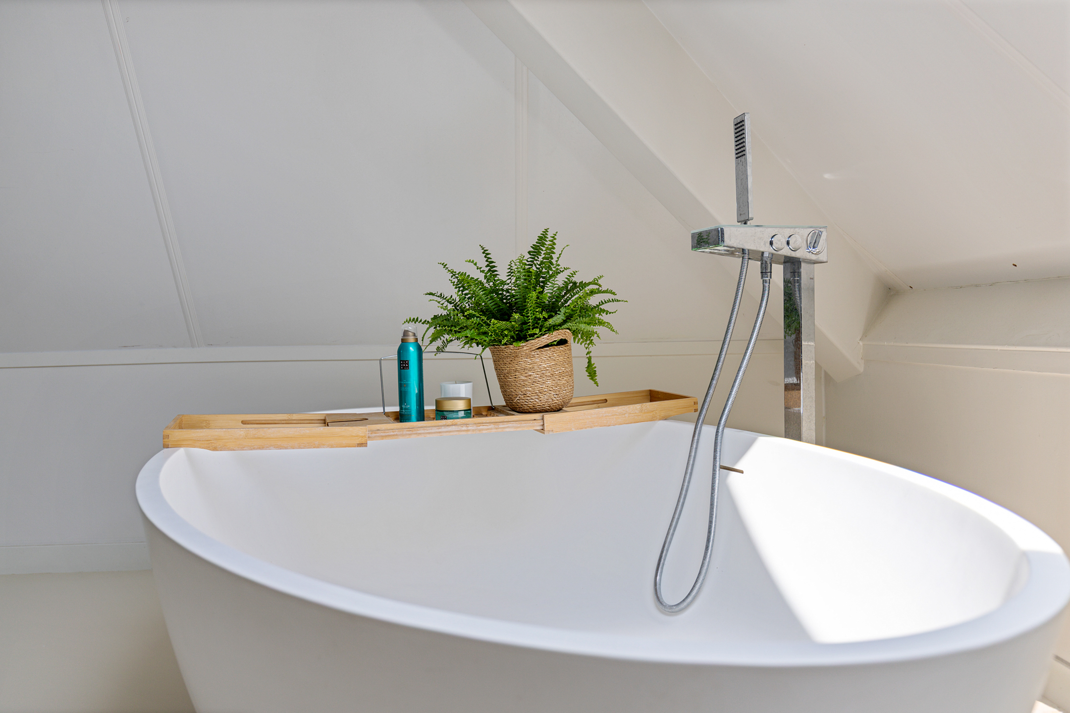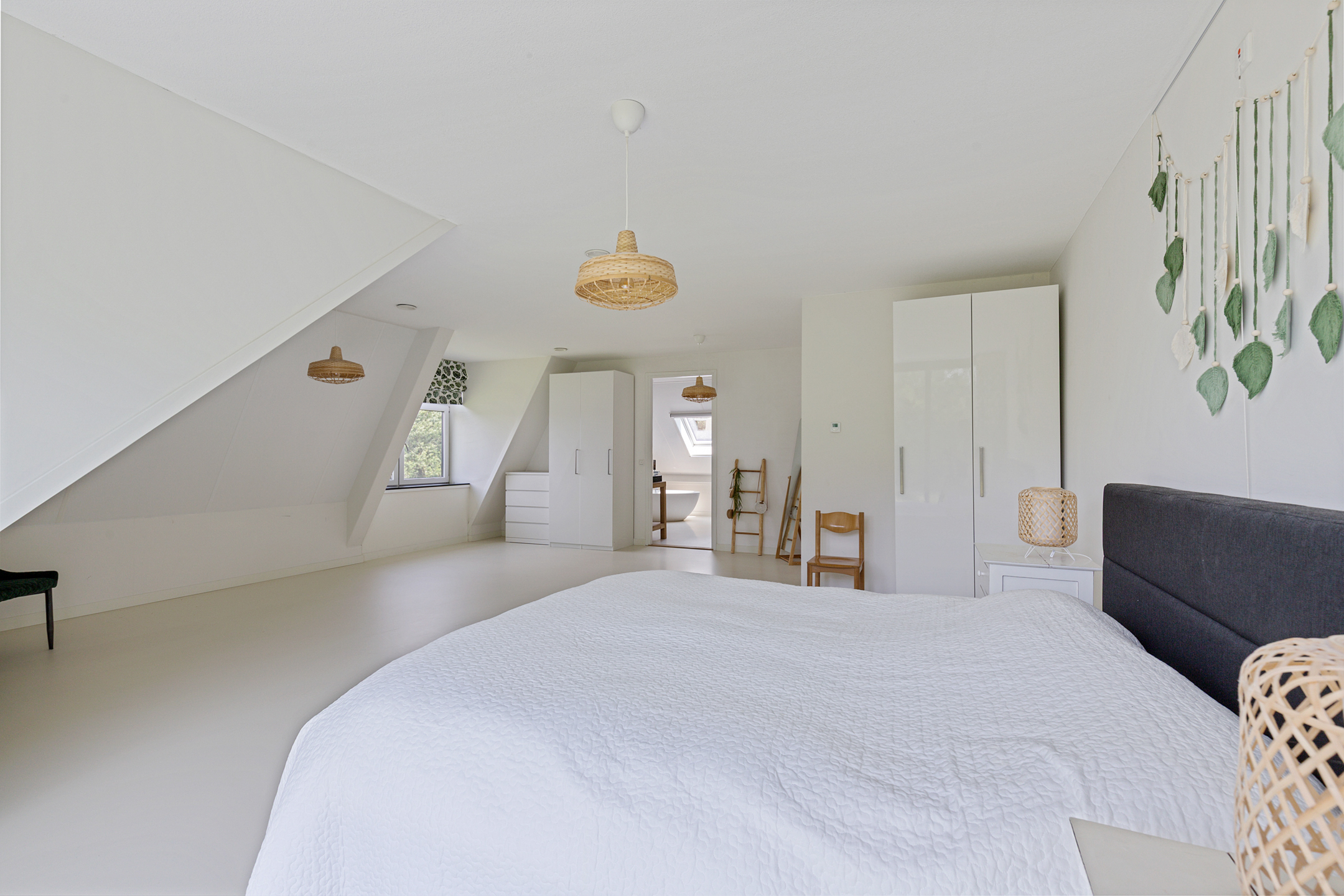 De master bedroom is een ware privésuite (46m2) met panoramisch uitzicht op het water via kamerhoge ramen in het zinken risaliet. Een extra dakkapel biedt zicht op het naastgelegen natuureiland. De luxe en-suite badkamer is voorzien van een vrijstaand ligbad, dubbele wastafel, toilet en inloopdouche. Hier wakker worden geeft elke dag energie.