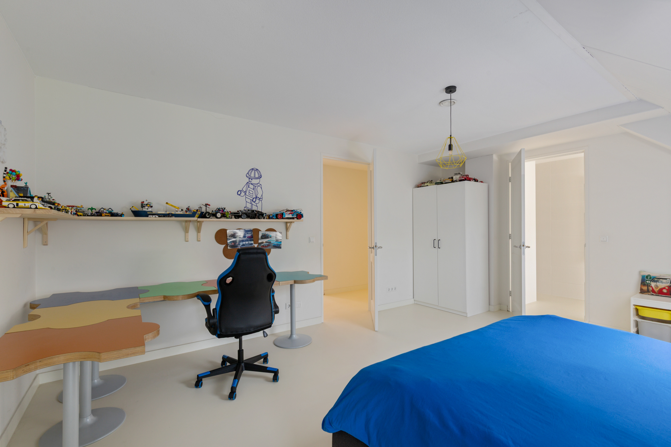 Grenzend aan de woonkamer bevindt zich een kantoor- of speelkamer met zicht op de tuin. De ruime bijkeuken is praktisch ingedeeld en voorzien van witgoedaansluitingen.