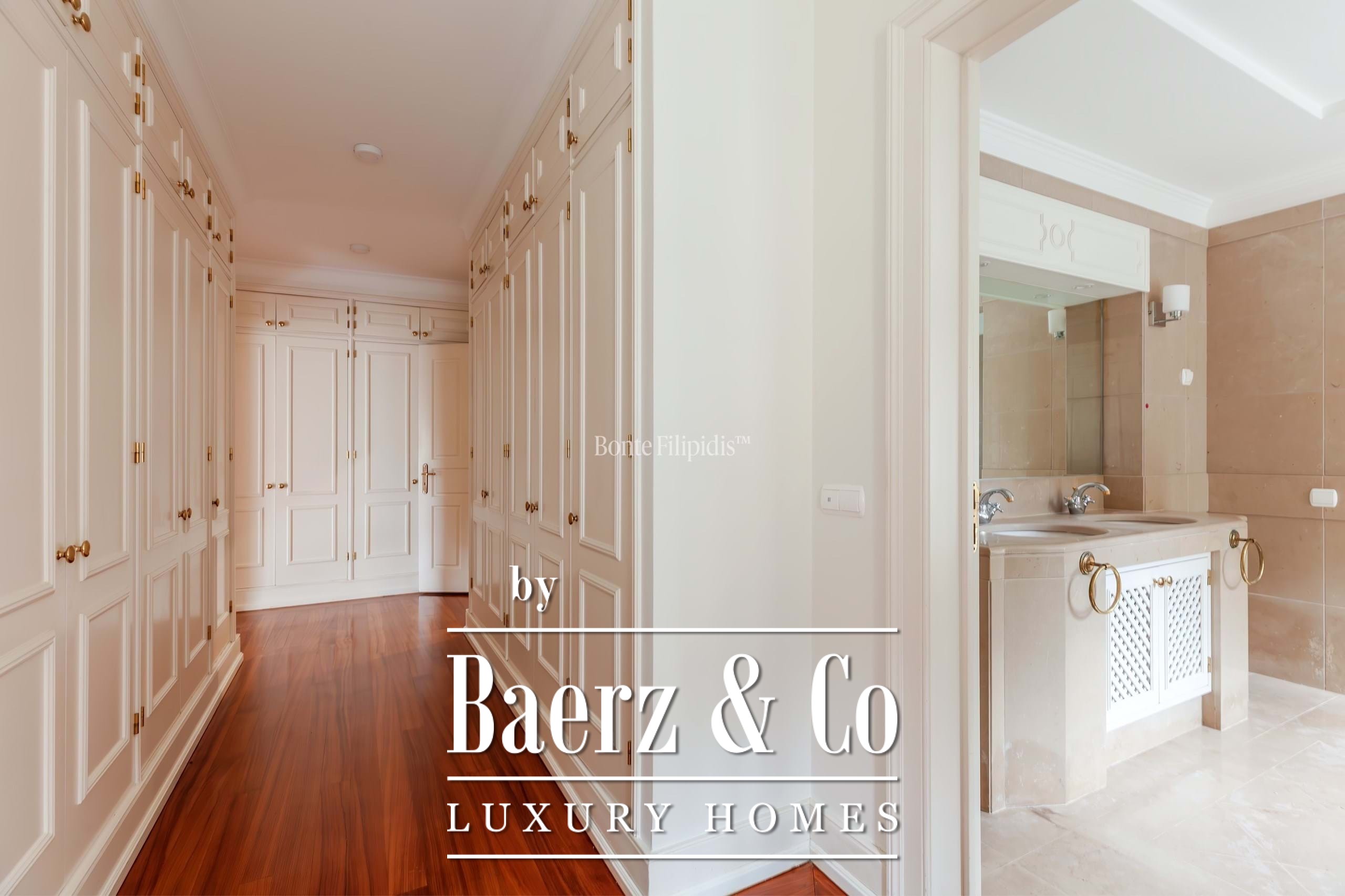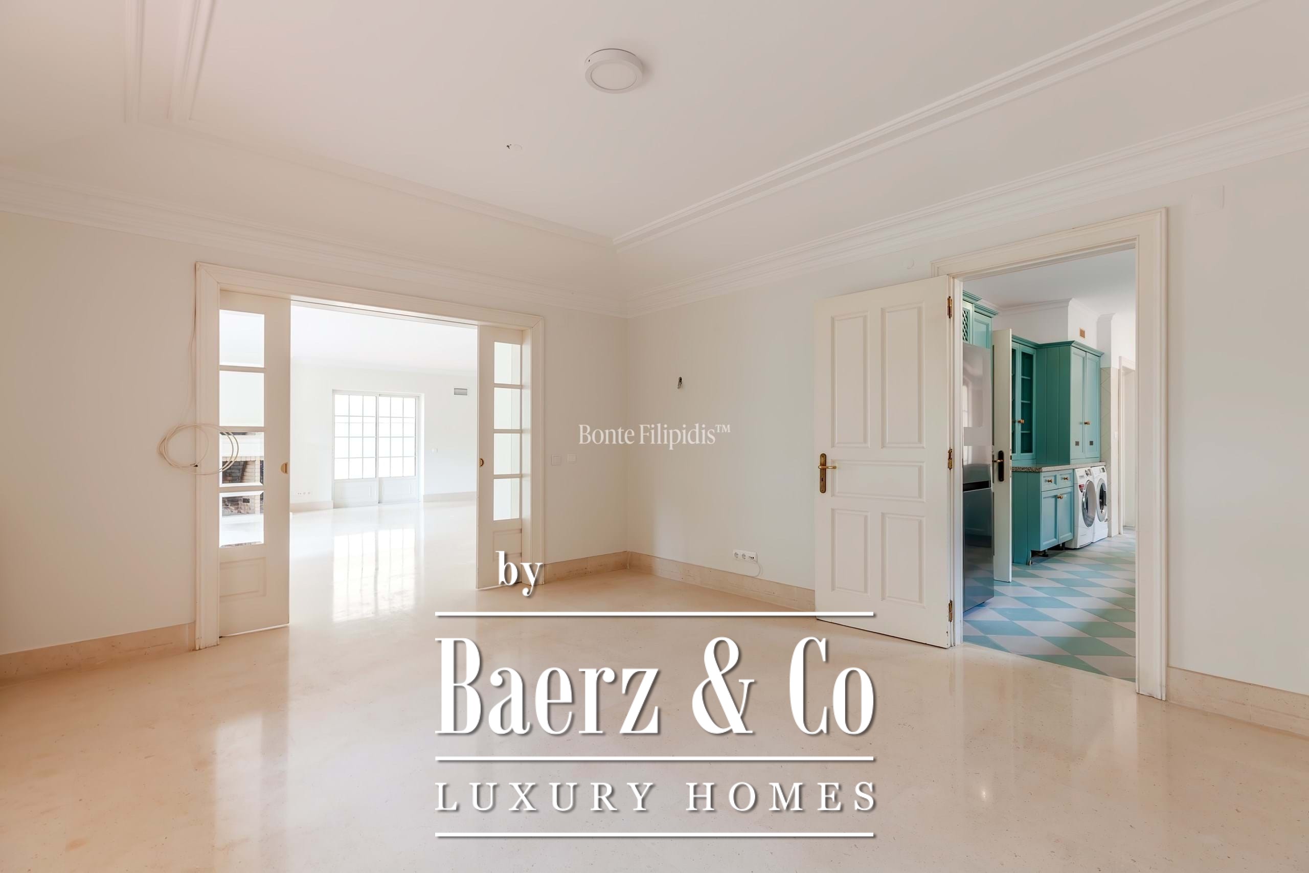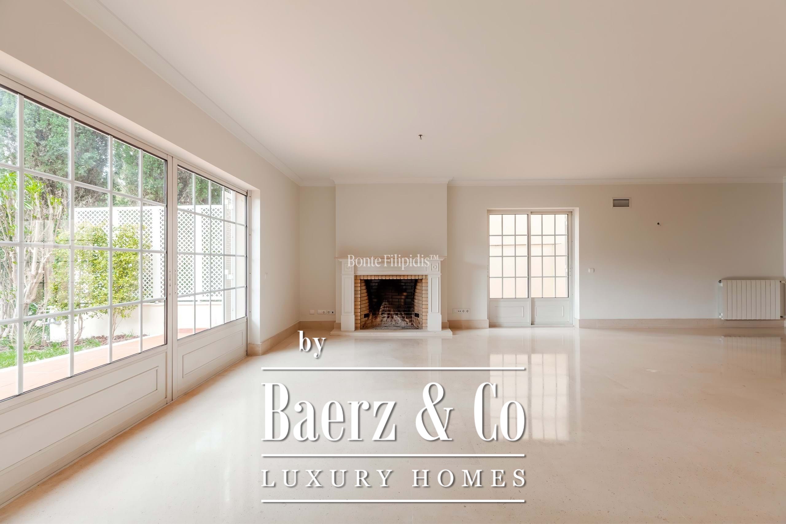 Op de begane grond vindt u een woonkamer met open haard en een eetkamer, beide met toegang tot de besloten tuin, alsmede een kantoor of bibliotheek. De keuken is optimaal uitgerust, compleet met een dienstpatio, wasruimte en personeelsverblijf. Op de bovenverdieping bevinden zich de privé slaapvertrekken, waaronder een suite met inloopkast, extra slaapkamers en bergruimte, allemaal met directe toegang tot het terras. Het souterrain biedt ruimte aan een garage voor drie auto's, technische ruimten en extra opslag.