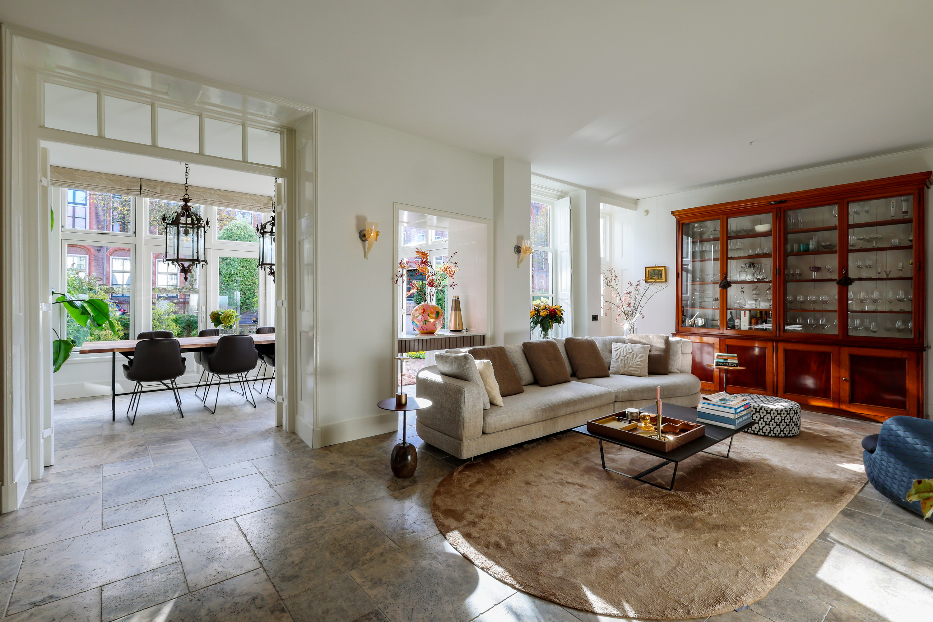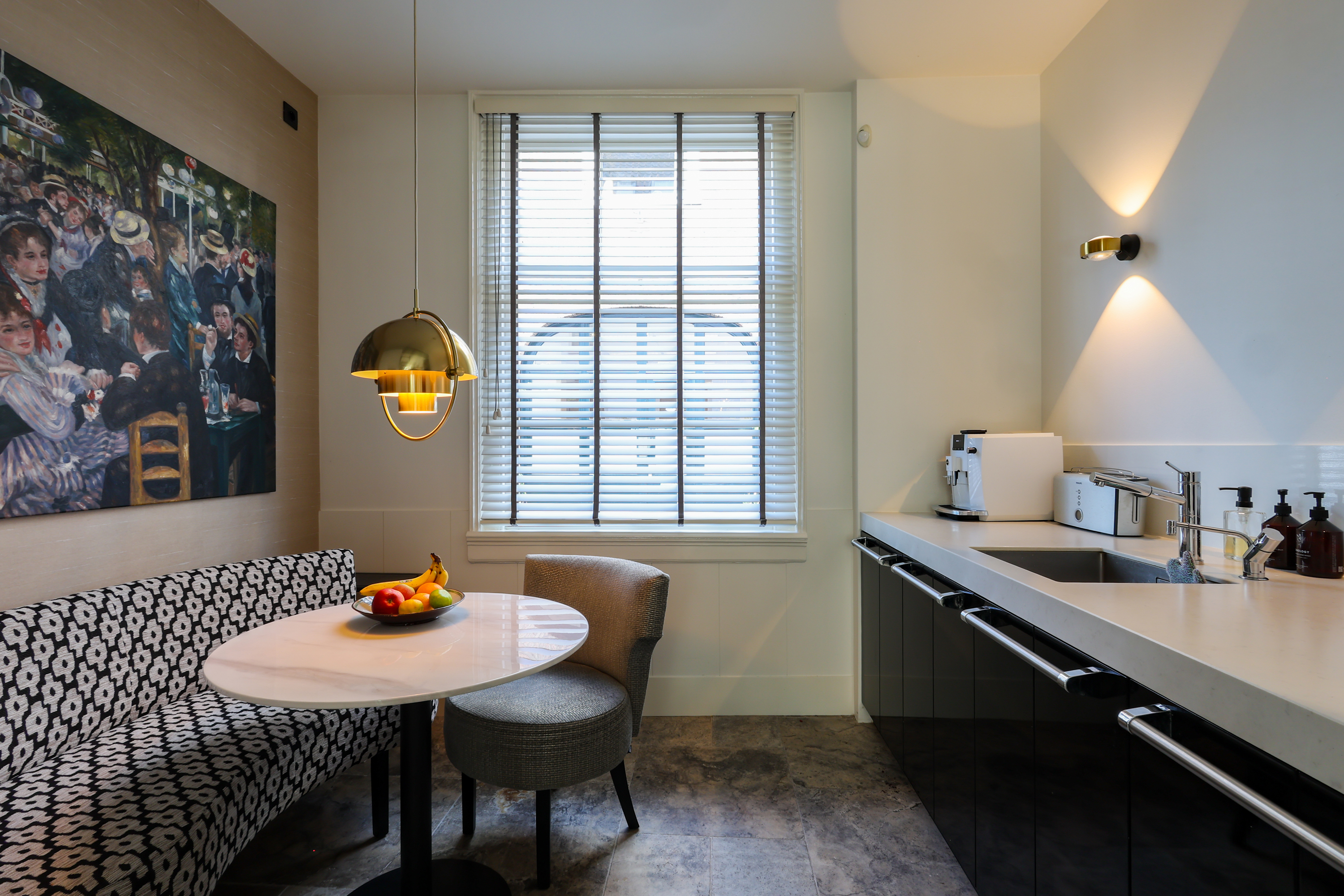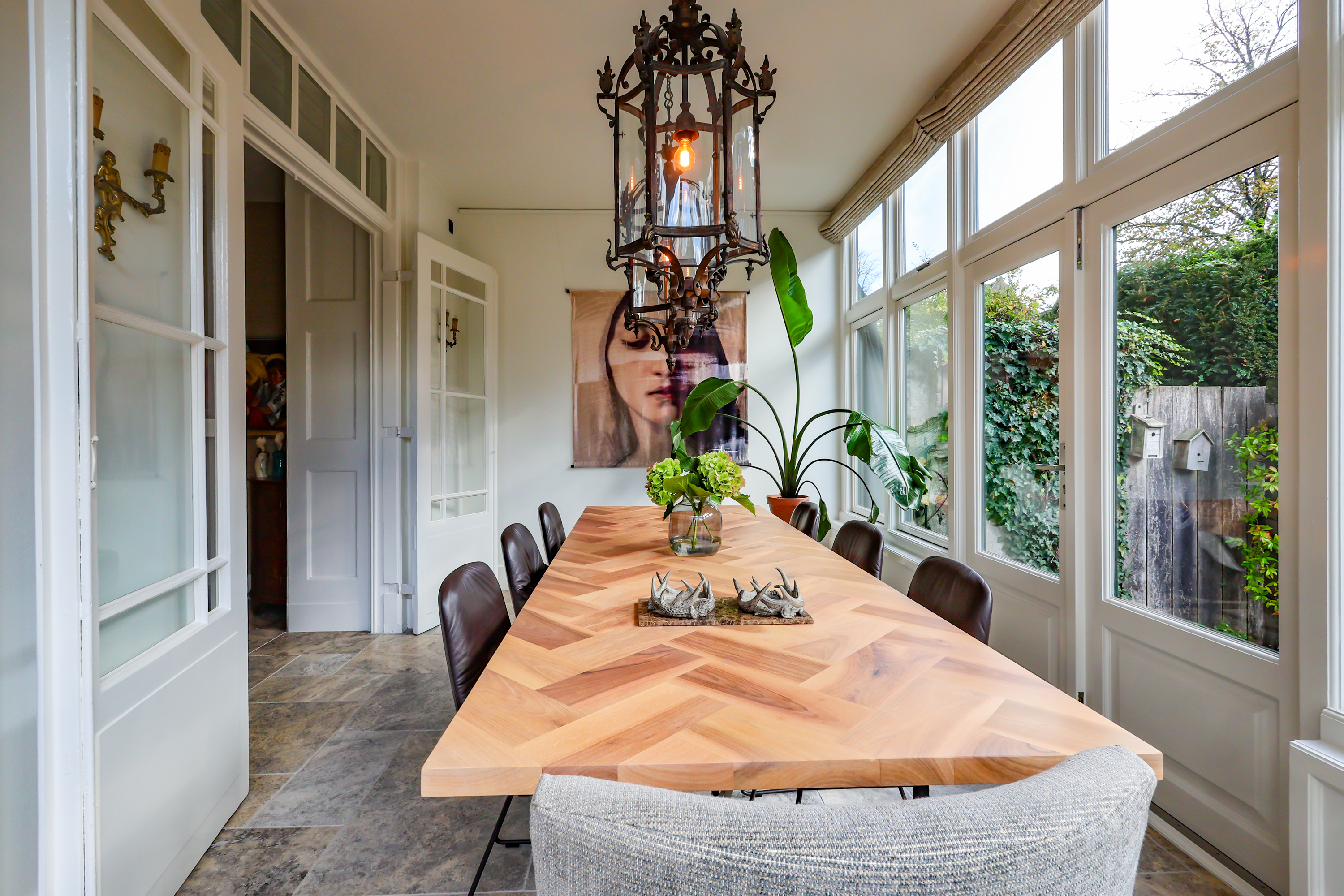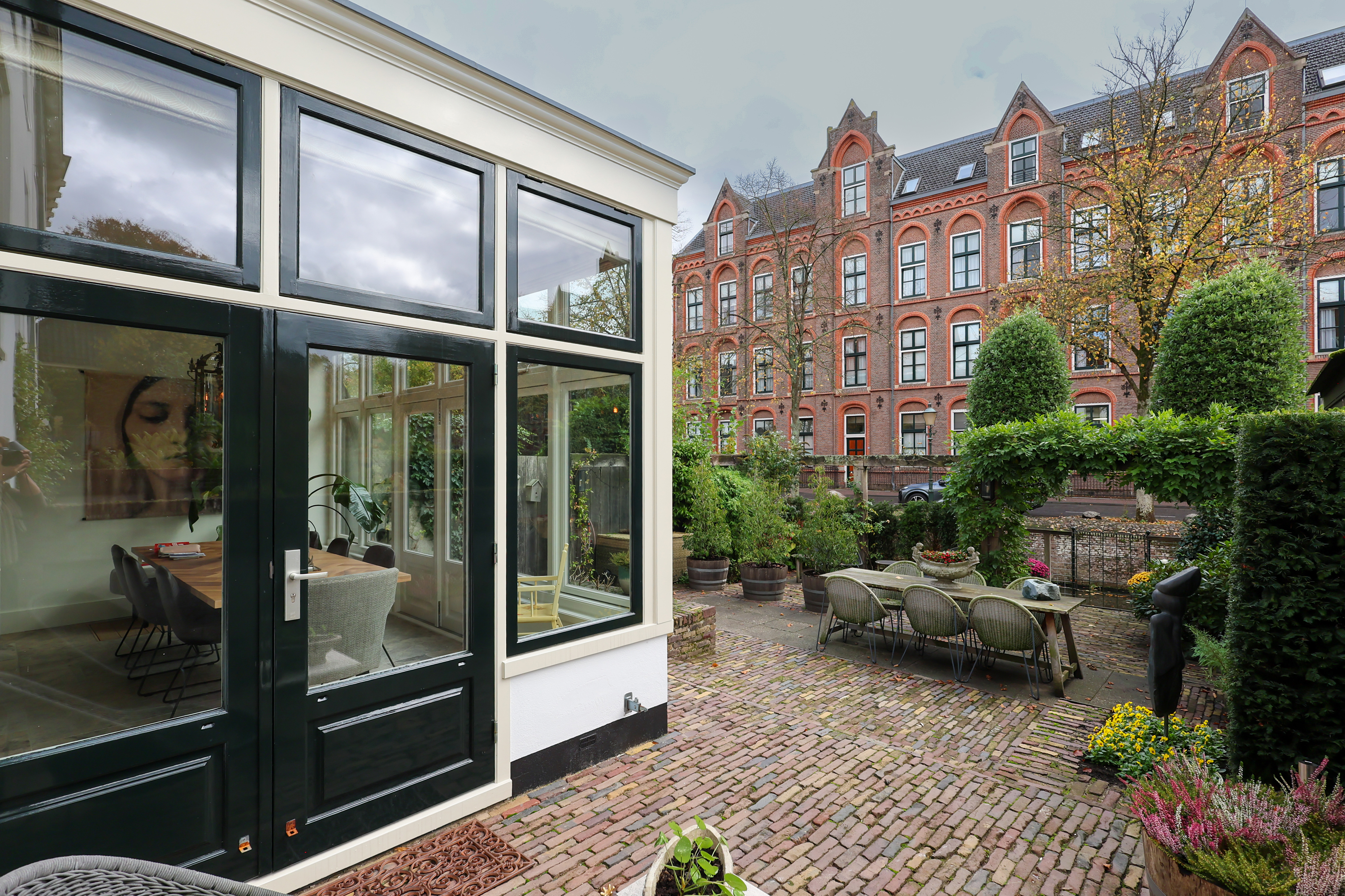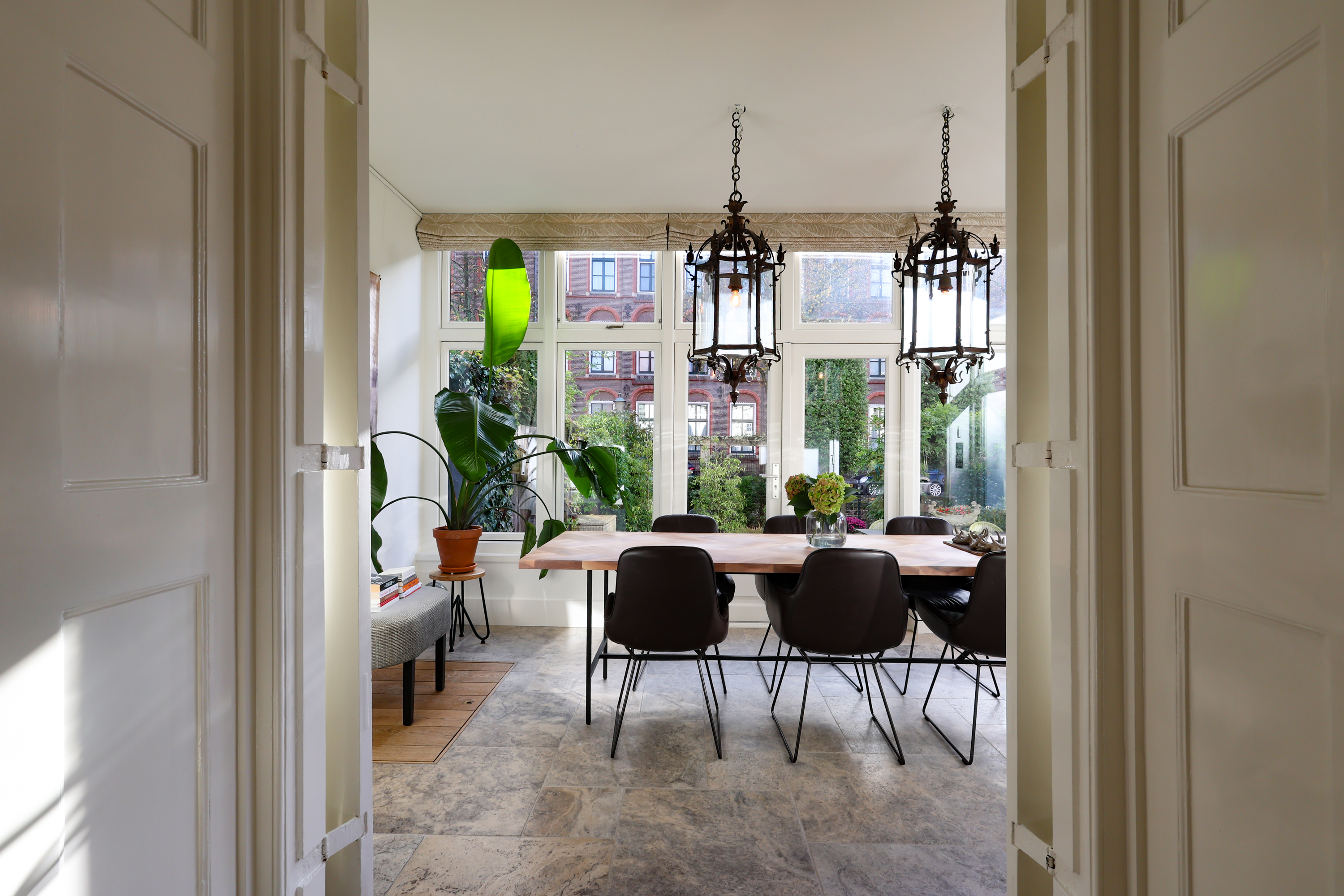 (Lodder) heeft een gezellige ontbijthoek met uitzicht op de Muurhuizen, perfect voor de eerste koffie van de dag. Via de lichte serre met eetgedeelte loop je zo de tuin in met een terras aan de Gracht.